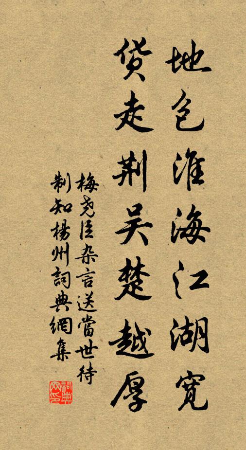 古詩文歷史字典書法欣賞書法字典國語詞典說文解字康熙字典古漢語字典地包淮海江湖寬,貨走荊吳楚越厚梅堯臣 《雜言送當世待制知楊州》名句出處出自宋代梅堯臣的《雜言送當世待制知楊州》全文:廣陵老人爭持壺酒,朝言送少年使君,暮言迎少年太守,少年俱是玉墀人,文章快利生銅吼。莫作蕪城賦,事往復何有。莫聽嵇康琴,商聲豈堪久。今當太平非不偶,星宿煌煌羅北斗。楊州古富變荒涼,萬俗一心依父母。地包淮海江湖寬,貨走荊吳楚越厚。開釀刲羊願遇賓,天下沄沄不輕口。名句書法欣賞地包淮海江湖寬,貨走荊吳楚越厚書法作品梅堯臣名句,雜言送當世待制知楊州名句名句推薦梁渚溪邊下直鉤,波翻浪輥費牽抽釋普寧《偈頌四十一首》劉郎阮郎剡溪客,結們窮幽絕人跡吳師正《劉阮洞》少年事事今已去,惟有愛詩心未歇歐陽修《病中代書奉寄聖俞二十五兄》黃州謫臣坐詩累,杳杳蟄龍空九地林景熙《雙檜堂為魯聖可行可賦》豈止山陽向秀感,徒為嵇呂二子空徘徊方回《聞笛嘆》背倚天峰涌化宮,橫空閣道拖雙虹范成大《平雲閣》東風無氣力陳克《謁金門》虛靈一寸心,至遠而至近魏了翁《題尹商卿自信齋》山霞坐未斂,池月來亭亭歐陽修《初秋普明寺竹林小飲餞梅聖俞分韻得亭皋木葉》楊柳飛花盡,櫻桃結子成韓維《普明亭賦》朱檻煙霜夜坐勞,美人南國舊同袍許渾《寄宋邧(一作寄宋次都,一作寄友人)》彤襜江上遠,萬里詔書催劉長卿《奉送裴員外赴上都》位極人臣,壽六十四。佚名《王山人為李衛公按冥》瓦盌薦谿毛,竹箸羞雞炙喻良能《何茂宏茂恭攜酒見過復侑以詩次韻一首》裁成五色詔,出擁兩朱輪蘇頌《留台賓客李公輓辭二首》詩詞推薦挽楊玉溪姚勉〔宋代〕蜀道艱難又幾年,錦城斷礎帶淒煙。從今井絡虧全勢,只恨坤輿失巨賢。山有蛾眉空積雪,國無峻柱可擎天。英魂和王有道二首曹勛〔宋代〕客里羈情厭九遷,相逢賴有故人賢。見貽勞苦平生句,如誦中和樂職篇。江左風流從昔著,日邊事業向來傳。只應辛未白鷺一絕杜范〔宋代〕故園蒼莽淡煙霏,白鷺翩然下小池。豈我機心猶未盡,躊躕四雇復驚飛。水調歌頭佚名〔宋代〕竹邊風細,月色淡陰陰。送鹽官劉少府古賢梅堯臣〔宋代〕我祖南昌尉,時危棄去仙。劉郎從宦日,天子治平年。燥茗山中火,熬波海上煙。吳民不為盜,唯此撓君權。庭草張耒〔宋代〕冉冉朝雨霽,欣欣禽哺雛。鮮鮮中庭草,往色日已敷。童子惡其蕃。謁我盡掃除。我為再三擷,愛之不能鋤。人生對卷劉克莊〔宋代〕妙在心通與理融,卓然有見是英雄。大儒晚作韓考異,往哲曾非墨尚同。折角爭希郭有道,鬀眉求似狄梁公。可憐奉和九日幸臨渭亭登高應制得日字鄭南金〔唐代〕重陽玉律應,萬乘金輿出。風起韻虞弦,雲開吐堯日。菊花浮聖酒,茱香掛衰質。欲知恩煦多,順動觀秋實。題萍鄉何叔萬雲山戴復古〔宋代〕拄杖穿雲去,一坡仍一坡。地高山不峻,花少竹還多。家近登臨便,人賢氣味和。能詩老姚合,朝夕共吟喔。詩品二十四則。疏野司空圖〔唐代〕惟性所宅,真取弗羈。拾物自富,與率為期。築屋松下,脫帽看詩。但知旦暮,不辨何時。倘然適意,豈必有為。