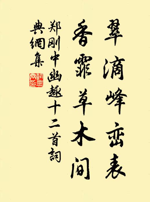 古詩文歷史字典書法欣賞書法字典國語詞典說文解字康熙字典古漢語字典翠滴峰巒表,香霏草木間鄭剛中 《幽趣十二首》名句出處出自宋代鄭剛中的《幽趣十二首》全文:幽趣無人會,欣然自解顏。雨來飛鳥急,沙靜小魚閒。翠滴峰巒表,香霏草木間。吾心久忘物,物意苦相關。名句書法欣賞翠滴峰巒表,香霏草木間書法作品鄭剛中名句,幽趣十二首名句名句推薦獨自倚危欄,欲向荷花語張孝祥《卜運算元》筆尾病來猶壯健,詩情老去更清新張耒《挽李少卿》未及親舊語,遽隨犬羊奔童蒙《宿青綏鋪》舊物不盡記,故人難得逢邵雍《老翁吟》欹枕清無寐,扒窗獨起看舒岳祥《正仲思歸作篆畦今夜月十詩非篆畦月乃雁蒼月》相會瑤池宴,時復醉金波劉志淵《水調歌頭》弭棹歷塵跡,悄然關我情歐陽詹《題嚴光釣台》一官雖漫與,頗知民苦疾晁說之《忽蒙秀實內黃賢尉寄書期許稠至有經世之語輒》事關氣數君知否,麥到秋時天又寒戴復古《聞時事》荷君心見許,雇我道非長戴仔《答友人二首》遙知湯餅局,歡傳溪上村王灼《次韻韶美義夫兩家舉孫》歲律忽其周,陰風慘遼敻歐陽修《還述懷》罩翠靄、上壽煙曹勛《玉連環(天申壽詞)》弱水元無三萬里,此心安處是蓬萊方回《丁酉生日二首》未成三徑已荒蕪,勞動先生枉棹過薛師石《水心先生惠雇瓜廬》詩詞推薦寄元均石介〔宋代〕君為儒者豈知兵,何事欣隨壁馬行。裴度樽前坐韓愈,趙成帳下立荀卿。御戎誰道全無策,對壘寧妨一下枰。須信和答趙生師白見寄孫應時〔宋代〕休論吾昔與吾今,窗下婆娑有學林。會意書非求甚解,無弦琴豈要知音。是中截斷談天口,何處尋來立雪心。永日題龍眠十八尊者劉克莊〔宋代〕嘗聞天台境,肉身往無從。仁夫示此圖,恍惚游其中。應真一一若舊識,或踞怪石臨飛淙。山鬼投牒何敬恭,天女哭陳伯求舒岳祥〔宋代〕早總淮西餉,晚為刑部郎,艱危身九隕,漂泊淚千行。天地孤忠在,山河遺恨長。寡妻隨季女,猶得在鄞鄉。寄滿子權王令〔宋代〕西北風吹數紙詩,神門樞鑰鬼關機。九原黃土英靈活,萬古青天霹靂飛。我是懦夫無壯志,近思近日竊餘輝。高樓寒拾贊釋了惠〔宋代〕五台為床,峨嵋作枕。眠似不眠,惺如不惺。喚起來,三十苕帚柄。處州水南庵二首秦觀〔宋代〕竹柏蕭森溪水南,道人為作小圓庵。市區收罷魚豚稅,來與彌陀共一龕。將欲南行陪崔八宴海榴亭許渾〔唐代〕朝宴華堂暮未休,幾人偏得謝公留。風傳鼓角霜侵戟,雲卷笙歌月上樓。賓館盡開徐稚榻,客帆空戀李膺舟。謾夸福先寺雪中餞劉蘇州白居易〔唐代〕送君何處展離筵,大梵王宮大雪天。庾嶺梅花落歌管,謝家柳絮撲金田。亂從紈袖交加舞,醉入籃輿取次眠。卻笑重陽次日登城山林亦之〔宋代〕城山飲罷冷侵衣,湖上重來月滿卮。未愛疎籬 * 日,最憐秋水白雲時。