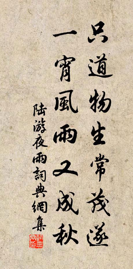 古詩文歷史字典書法欣賞書法字典國語詞典說文解字康熙字典古漢語字典只道物生常茂遂,一宵風雨又成秋陸游 《夜雨》名句出處出自宋代陸游的《夜雨》全文:藩籬處處蔓牽牛,薏苡叢深稗穗抽。只道物生常茂遂,一宵風雨又成秋。陸游詩詞大全名句書法欣賞只道物生常茂遂,一宵風雨又成秋書法作品陸游名句,夜雨名句名句推薦搔首風塵雙短鬢,側身天地一儒冠趙孟頫《和姚子敬秋懷》蒼林翠碧龍巖寺,縣令三年兩度來孫懋《龍巖寺》歷騁禪扉到暮鍾,苦無勝事可深窮徐良弼《桃花洲》細看門外村,幾換寺中人儲泳《亭下》遇事無心心自放,如今心事放尤難舒岳祥《正仲入鄞敘懷送別二首1》君意已吳越,我行無去留蘇軾《用前韻再和霍大夫》一勞可永逸,所欲已稱遂高斯得《要君》水落才余半篙綠,霜高初染一林丹陸游《秋興》身世已如風六鷁,文章仍似閏黃楊陸游《春晚村居》貧病休何日,艱難過此身耿湋《贈興平鄭明府》蜂蝶含餘意,徘徊繞舊枝強至《落花》粉蕊丹青描不得歐陽修《漁家傲》陶熔存庶匯,霖雨潤寰區王禹偁《太師中書令魏國公冊贈尚書令追封真定王趙挽》我自不歸歸便得,故園早晚早梅開柴望《富陽道中》二十年間嗟契闊,八千里外得團欒袁說友《端叔奉詔還朝二首》詩詞推薦訾家洲二首劉克莊〔宋代〕遺基只有蛬鳴雨,往事全如鳥印空。谿水無情流虢虢,海山依舊碧叢叢。斷碑莫怪千回讀,今代何人筆力同。隔竹葉夢鼎〔宋代〕隔竹斜陽喚小舟,寥寥天柱訪仙遊。風聲樹杪疑笙鶴,雲氣峰頭見翠虬。凡骨面岩那可蛻,塵容鏡水只包羞。幾時夜登城樓陸游〔宋代〕上天何蒼蒼,四序浩旋斡。異哉今年熱,炊鬻不可活。夜分睡復起,搖箑腕欲脫。強登城西樓,月露渺空闊。憑欄臨江仙 贈送蘇軾〔宋代〕詩句端來磨我鈍,鈍錐不解生鋩。歡顏為我解冰霜。酒闌清夢覺,春草滿池塘。應念雪堂坡下老,昔年共采芸香。游齊山寺梅詢〔宋代〕鳳剎岧嶢掛斷霓,鳧雲渚洳暗窗扉。江風曉定釣人出,山月夜高禪客歸。牆外蔓藤移過密,院中杉子落來稀。老僧南鄉子薛燧〔宋代〕柳色鎖重樓。樓上輕寒不滿鉤。堆徑落紅深半指,悠悠。飛絮簾櫳幾許愁。逐日望歸舟。暖藕全寬玉臂韝。待得君偶成黃大受〔宋代〕綠草何自來,蔓延滿中庭。前朝方芟夷,茲視忽已盈。竹間幽蘭花,數四移乃成。龍山野釋永頤〔宋代〕聞說西潘桑枯少,舊來多川紫櫻桃。龍山春晚聊舒望,雪白梨花一丈高。華生篇司馬光〔宋代〕涼風淨掃雲無跡,海月未生星曆歷。貝聊珠貫拱北辰,三五縱橫此何夕。重樓疊榭出秋空,鳷鵲露寒連桂宮。瑤井恭次家大人初抵季弟海陵官舍之韻孫應求〔宋代〕舟渡金山過廣陵,灣頭略可計淮程。回瞻建業祥煙繞,北望長安落日明。野曠春農虛地力,霜清曉角動邊聲。中原