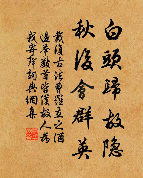 古詩文歷史字典書法欣賞書法字典國語詞典說文解字康熙字典古漢語字典白頭歸故隱,秋後會群英戴復古 《法曹羅立之酒邊舉數首皆仆故人為我寄聲》名句出處出自宋代戴復古的《法曹羅立之酒邊舉數首皆仆故人為我寄聲》全文:佳士欣相識,吟邊問姓名。官為三語掾,詩到五言城。野客可憐我,故人煩寄聲。白頭歸故隱,秋後會群英。名句書法欣賞白頭歸故隱,秋後會群英書法作品戴復古名句,法曹羅立之酒邊舉數首皆仆故人為我寄聲名句名句推薦客棹秋瀧水,官郵暮嶺雲宋庠《同年龐汝弼赴宰臨賀見過敘別因成感詠》雁聯鴛序立,彩戲袞衣新佚名《臨江仙》風驅雲將來,市聲落幾格周邦彥《游定夫見過晡飯既去燭下目昏不能閱書感而賦》宰相從來號讀書,晚年似欲俲痴兒劉黻《餞潘吳二察院去國五首》萊子長年榮彩服,衛公雅意樂平泉祖無擇《題尚書余襄公西園》慣作山林客,聊遊戲劇場溫革《鳳凰山》晴出寺門驚往事,古松千尺半蒼苔齊己《自貽》吹罷玉簫香霧濕,殘月墜,亂峰寒劉仙倫《江神子/江城子》潛池隱復直謝朓《答張齊興詩》舊壘銷烽火,新營辨井泉權德輿《送靈武范司空》白雪拜嘉仍袖手,汗顏終恐坐雷同陳造《次韻趙帥登平山堂》大船辟艦容萬斛,小船飛鶻何翩翩周麟之《中原民謠造海船》到處朝山拜岳,長是爭籌賭賽,四海把名傳佚名《水調歌頭》落日晴江里,荊歌艷楚腰劉方平《採蓮曲》嗟嗟願公寶此劍,更煩借截奸臣頭趙孟堅《斬偶行》詩詞推薦獻臣學士與余通書因成感詠宋庠〔宋代〕夫君班揚儔,抱槧群玉府。久讀未見書,躬抽擊年譜。墜緒獲先秦,亡篇出東魯。上泝三皇墳,旁探百家語。怪牒青林岩楊蟠〔宋代〕鳥外無行跡,寒林引薜蘿。山中僧已老,不信雪霜多。冬夜讀史有感陸游〔宋代〕短檠膏涸夜將殘,感事懷人興未闌。酌酒淺深須自度,圍棋成敗有傍觀。斷粞作飯終年飽,大布裁袍稱意寬。世上寒食客中有懷崔道融〔唐代〕江上聞鶯禁火時,百花開盡柳依依。故園兄弟別來久,應到清明猶望歸。送李全甫李處權〔宋代〕已斲長篇餞女生,君猶從我覓詩行。窮途白眼何須怪,亂世蒼顏不足驚。南國旌旗猶滅沒,中原豺虎正縱橫。蘇湖攜家游南山吳則禮〔宋代〕都梁山色楊柳青,天乞覉臣如許情。不嫌野褐垂垂好,故作春風踽踽行。幽花傍水有孤笑,好鳥隨人時一鳴。晚飯句李維〔宋代〕謫去賈生身健否,秋來潘岳鬢斑無。和答孫推官入病新起見過錢塘之什二首蔡襄〔宋代〕於世無機是海翁,客情醒醉任鄰鍾。廉纖雨意還侵夜,料峭春期未減冬。寶氣上浮難掩玉,歲寒中立不凋松。君王句范祖禹〔宋代〕蘚色通行徑,松陰叩隱關。喜譚德稱歸陸游〔宋代〕少鄙章句學,所慕在經世,諸公薦文章,頗恨非素志。一朝落江湖,爛熳得自恣,討論極王霸,事業窺莘渭,孔明