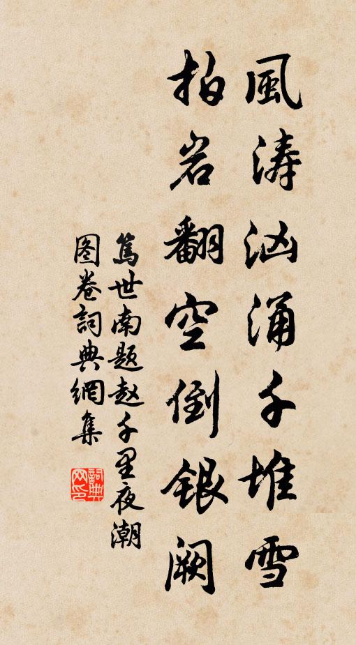 古詩文歷史字典書法欣賞書法字典國語詞典說文解字康熙字典古漢語字典風濤洶湧千堆雪,拍岩翻空倒銀闕篤世南 《題趙千里夜潮圖卷》名句出處出自宋代篤世南的《題趙千里夜潮圖卷》全文:風濤洶湧千堆雪,拍岩翻空倒銀闕。雁聲驚起一江秋,萬里無雲掛明月。篤世南詩詞大全名句書法欣賞風濤洶湧千堆雪,拍岩翻空倒銀闕書法作品篤世南名句,題趙千里夜潮圖卷名句名句推薦回首鷺盟寒陳允平《木蘭花慢(和李篔房題張寄閒家圃韻)》多情卻被無情惱,今夜還如昨夜長。元好問《鷓鴣天·候館燈昏雨送涼》六代繁華,春去也,更無訊息薩都剌《滿江紅》歸來獻明主,歌舞隘春城盧綸《雜曲歌辭皇帝感詞》閉門獨睡空愁絕陳德武《憶秦娥》鴻蒙插樓台,毫髮數動植蘇轍《次韻張禹直開元寺觀畫壁兼簡李德素》又為平羌游,素月沉煙波陸游《臨川絕無佳酒時得一醉戲書》唯應清都境李白《古風其四》生申降甫何穹崇,赤昂太白來虛空項安世《用韻為席婿壽》綠暗紅稀春已暮,燕子銜泥,飛入垂楊處。葛長庚《鳳棲梧·綠暗紅稀春已暮》六月雲初,人爭議公,公無阻傷黃機《沁園春(壽)》伏枕漫書空,到曉愁難說朱敦儒《生查子》積雨山川晦,新晴氛霧除翁卷《送劉幾道》願酬明主惠,行矣豈徒歟張九齡《初發道中贈王司馬兼寄諸公》西鄰鄭夫子,乘興幾時來強至《偶書呈公勝》詩詞推薦齊謳行陸機〔魏晉〕營丘負海曲。沃野爽且平。洪川控河濟。崇山入高冥。東被姑尤側。南界聊攝城。海物錯萬類。陸產尚千名。孟諸哭張玉父劉克莊〔宋代〕華發客朱門,文高道又尊。十分窮不屈,一片氣長存。籬掩湖邊宅,墳依郭外村。二孤彈舊鋏,泣感孟嘗恩。旦景黃庚〔宋代〕雞鳴起濯發,披衣出戶牖。自汲古澗泉,落月猶在手。三漱吞朝霞,餘光散花柳。茲意難語人,延佇忽良久。將游東都留別包諫議戴叔倫〔唐代〕衰客慚墨綬,素舸逐秋風。雲雨恩難報,江湖意已終。縣當仙洞口,路出故園東。唯有新離恨,長留夢寐中。有感 其四王冕〔元代〕依違思故里,吟嘯倚闌乾。野水隨潮漲,山雲帶雨寒。歸鴻悲別漵,羈客呆長安。何日干戈息?山林樂考□。秋晚陸游〔宋代〕春粳入甑香炊玉,壓酒鳴槽滴碎珠。甲第朱門漫豪侈,山家風味定應無。寒食夜蘇二宅杜甫〔唐代〕寒食明堪坐,春參夕已垂。好風經柳葉,清風照花枝。客淚聞歌掩,歸心畏酒知。佳辰邀賞遍,忽忽更何為? 入德慶舟中看雨曾豐〔宋代〕雲合蒼天怒,風生老木號。雨跳珠點急,浪涌雪花高。作爽輕頭目,俄寒豎發毛。頑軀金氣盛,敢與瘴相鏖。嘲壟彥和鄒浩〔宋代〕衣領從教虱子緣,夜深拜得蓆兒穿。道鄉活計君知否,飢即須餐困即眠。吳下同年會詩王藝〔宋代〕瓊林春暖記分違,敘好如公在昔稀。魚腹一書勞遠寄,鵲枝三匝幸相依。初筵雖負兵廚約,餘愛終分趙日暉。從此