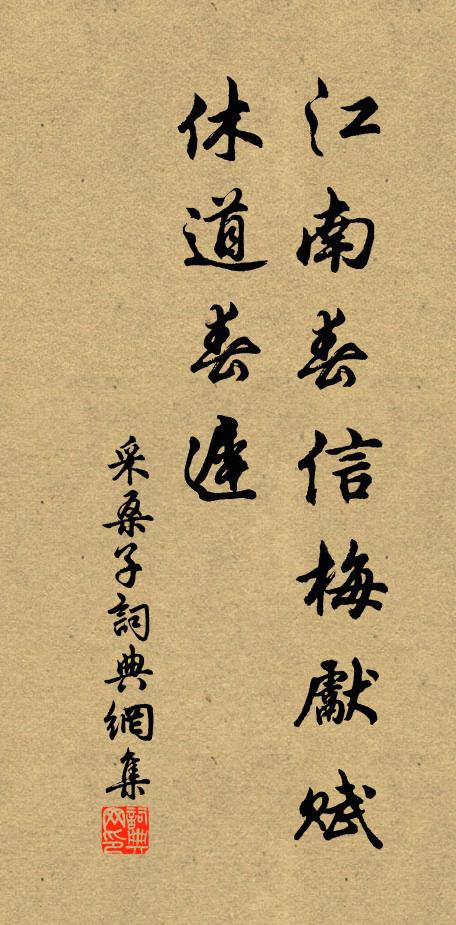古詩文歷史字典書法欣賞書法字典國語詞典說文解字康熙字典古漢語字典江南春信梅先賦,休道春遲佚名 《採桑子》名句出處出自宋代佚名的《採桑子》全文:江南春信梅先賦,休道春遲。映竹開時。姑射仙人雪作肌。青樓且莫吹羌管,留勸金卮。折取高枝。香滿名園蝶未知。佚名詩詞大全名句書法欣賞江南春信梅先賦,休道春遲書法作品佚名名句,採桑子名句名句推薦十里旌旗明照日,九衢鼓吹鬧喧天吳芾《大閱即事書懷》韶陽拄杖頭邊眼,供佛燒香不在多釋心月《偈頌一百五十首》豪右貪威愛,紆繁德簡通暢當《奉送杜中丞赴洪州》長育恩難報,攀號自失聲宋天則《挽呂東萊先生》長笛吹梅花,月色滿營屋董嗣杲《江上晚眺》還似山中日,柴門更不開貫休《秋居寄王相公三首》賤子匹馬來,邂逅一相晤強至《依韻答吳殿丞應之見寄》況復黃絹碑,光耀荊溪邊仲並《和何樞密題楚頌亭韻》紫素全如玉琢,清音不假金妝范智聞《西江月》驅我天閒入鼠穴,八坊奇產空無餘家鉉翁《元和修復馬政圖》弔古何時過梁宋?題詩且欲遍衡廬陸游《閒遊》自言甘旨急,毋失舊館期程珌《送夏明叔歸建寧》徘徊不忍去,我懷誰為陳張栻《齊山石壁間見林擇之題字緬懷其人賦此》不回霜雪不應惜,未得風雲眾忍摧曾鞏《寄王樂道》那知卉木無情物,牽動長江萬里愁謝驛《杭州》詩詞推薦岳陽樓李商隱〔唐代〕欲為平生一散愁,洞庭湖上岳陽樓。可憐萬里堪乘興,枉是蛟龍解覆舟。新堂望樊山張耒〔宋代〕幽人井臼兩山間,鄰里樵漁盡往還。興發登臨窮眼界,江南秀色碧雲鬟。城西即事王琮〔宋代〕清曉離家去路遙,絕憐寒景太蕭條。松深漸覺風聲緊,雲坳還知雪意銷。沙嘴客擔魚種賣,山頭人拾樹枝燒。梅華醉花陰(木犀)丘崈〔宋代〕碧玉槎椏金粟小。山路驚秋老。倒倚濕寒煙,似怯秋風,閣淚啼清曉。銅壺冷浸宜深窈。人試新妝巧。雲鬢一枝斜巫山蘇拯〔唐代〕昔時亦云雨,今時亦云雨。自是荒淫多,夢得巫山女。從來聖明君,可聽妖魅語。只今峰上雲,徒自生容與。海口三首劉克莊〔宋代〕暫游不得久婆娑,柰此龍江景物何。天勢去隨帆際盡,海聲來傍枕邊多。昏窗微見燈明嶼,霽閣遙看日浴波。定有駕御帶欲載糯米入城先以詩敘情因次韻只此便虞儔〔宋代〕種術詩人也未窮,百篇欲就醉顏紅。卻思白墮相逢晚,不分青銅一笑空。臥甕更須防吏部,抱琴應不問新豐。何當四賓主賓中賓釋正覺〔宋代〕平生心事結眉頭,滿面風埃鬢已秋。大底出門無伎術,奈何今日路貧愁。銀山磧西館岑參〔唐代〕銀山磧口風似箭,鐵門關西月如練。雙雙愁淚沾馬毛,颯颯胡沙迸人面。丈夫三十未富貴,安能終日守筆硯。對酒陸游〔宋代〕密筱持苫屋,寒蘆用織簾。彘肩柴熟罨,蓴菜豉初添。黃甲如盤大,紅丁似密甜。街頭桑葉落,相喚指青簾。