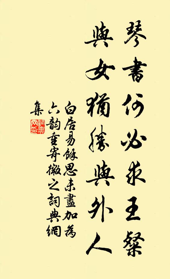古詩文歷史字典書法欣賞書法字典國語詞典說文解字康熙字典古漢語字典琴書何必求王粲,與女猶勝與外人白居易 《餘思未盡,加為六韻,重寄微之》名句出處出自唐代白居易的《餘思未盡,加為六韻,重寄微之》全文:海內聲華並在身,篋中文字絕無倫。遙知獨對封章草,忽憶同為獻納臣。走筆往來盈捲軸,除官遞互掌絲綸。制從長慶辭高古,詩到元和體變新。各有文姬才稚齒,俱無通子繼余塵。琴書何必求王粲,與女猶勝與外人。名句書法欣賞琴書何必求王粲,與女猶勝與外人書法作品白居易名句,餘思未盡,加為六韻,重寄微之名句名句推薦猶帶孤山光景程文海《鵲橋仙 次中庵韻題解安卿盆梅 中庵有奇石名》休話元談有十,未論前後俱三薛公肅《和秉國壁間韻》毛穎從來意最深王哲《浣溪沙 詠筆》更將出處均天分,荀鳳莊鵬各有池宋庠《次韻和張太傅寄集賢相公》江水九道來,雲端遙明沒李白《登梅岡望金陵贈族侄高座寺僧中孚》一榻渾無物,孤琴對病容王禹偁《病中書事上集賢錢侍郎》望斷雲山多少路歐陽修《玉樓春》玉東西,歌宛轉王澡《祝英台近》泯然自盡,一種平懷釋祖欽《偈頌七十二首》弼教坊前,草橋門上,往事堪追溯柳亞子《百字令 巢南以詞見示,用世不售,乃慨然有》委質小池內,爭食群雞前白居易《感鶴》柄臣全似逢崔胤,座主徒勞識李程方回《七十翁吟七言十首》滿目路岐拋似夢,一船風雨去如飛羅隱《覽晉史(張翰思吳中鱸鱠蓴羹)》此友人張叔夏贈余之作也陸行直《清平樂 重題碧梧蒼石圖候 淒斷。人語西風》堙籠小合猶疑雨,日射東窗頓作晴陸游《晨起》詩詞推薦偈頌三十八首釋如淨〔宋代〕煙濛濛,雨濛濛,芍藥花開濕嫩紅。我今灌沐諸如來,人間天上起清風。夢陳和仲如平生交有三言覺而記其一曰錯後亂方岳〔宋代〕睡殘寒月海東頭,不起斯人孰與游。天下事寧堪幾錯,夢中語亦戒前籌。江湖浩浩二三字,風雨寥寥十五秋。莫向五月一日薄暮至三水倚檣欹枕曾豐〔宋代〕皓月三江口,青苹四岸邊。風頭橫立海,水面上浮天。陰氣猶能雜,陽威不敢燃。夏行秋月令,造物相吾眠。塞垣春方千里〔宋代〕四遠天垂野。向晚景,雕鞍卸。吳藍滴草,塞錦藏柳,風物堪畫。對雨收霧霽初晴也。正陌上、煙光灑。聽黃鸝、成安秋望寇準〔宋代〕八月西風蟬噪時,蕭蕭疏葉已辭枝。煙村物景都無賴,況是登臨有所思。入村方岳〔宋代〕宿雨初晴曉日晶,彌川滿谷白雲平。燦銀堆裹素螺髻,畫出江潮萬里橫。遞呈餘干郭主簿子敬曾豐〔宋代〕佛來非墮有,仙去豈超無。寧可死歸潔,莫教生合污。出余純白在,入與太清俱。百世下回首,高風立懦夫。送馬擴詣行在趙榛〔宋代〕全趙收燕至太平,朔方寸土比千金。氛祲一掃鑾輿返,若個將軍肯用心。和剡縣陳明府登縣樓方乾〔唐代〕郭里人家如掌上,檐前樹木映窗欞。煙霞若接天台地,分野應侵婺女星。驛路古今通北闕,仙溪日夜入東溟。彩衣水調歌頭佚名〔宋代〕早是玉堂客,猶著侍臣冠。便為霖去亦晚,何況此身閒。胸次光風霽月,意味滿庭芳草,體用兩相關。坐對粵山好