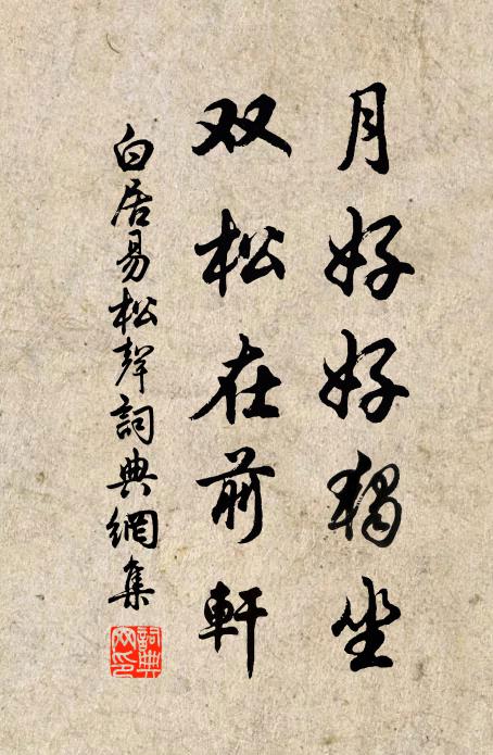 古詩文歷史字典書法欣賞書法字典國語詞典說文解字康熙字典古漢語字典月好好獨坐,雙松在前軒白居易 《松聲》名句出處出自唐代白居易的《松聲》全文:月好好獨坐,雙松在前軒。西南微風來,潛入枝葉間。蕭寥發為聲,半夜明月前。寒山颯颯雨,秋琴泠泠弦。一聞滌炎暑,再聽破昏煩。竟夕遂不寐,心體俱翛然。南陌車馬動,西鄰歌吹繁。誰知茲檐下,滿耳不為喧。名句書法欣賞月好好獨坐,雙松在前軒書法作品白居易名句,松聲名句名句推薦死難令北面,囚尚著南冠劉克莊《挽林韶州》仙經無限意,龍虎返丹砂宋太宗《逍遙詠》迨此從君游,始脫百憂繁許翰《三友篇贈珪老》與汝周旋久,流年捷飛梭,生當老病死,求脫理則那陸游《晨鏡》此皆騎戰一敵萬,縞素漠漠開風沙杜甫《韋諷錄事宅觀曹將軍畫馬圖》任侯門海陸,雜陳珍錯李曾伯《滿江紅》成物象,五轉辨微茫陳楠《望江南/憶江南》巫峰又郁起,赤甲方橫騫洪咨夔《答及甫和》芳蓮墜粉,疏桐吹綠,庭院暗雨乍歇姜夔《八歸·湘中送胡德華》山城日日望春榜,莫遣南來音信疏楊億《送章安世赴舉》工匠同流須至敬王處一《蘇幕遮 丹陽祠堂》云何西風至,忽已落大星孫應時《定軍山嘆》樽中有酒時,且飲復且歌邵雍《閒吟四首》好向溪頭尋釣侶,小溪邊夕漲清波徐璣《壬戌二月》垂竿動天象,煊策茹商芝薛嵎《閒居雜興十首》詩詞推薦瀟湘八景詩平沙落雁張經〔宋代〕喚侶下寒汀,爭宿蘆花萼。夜半漁翁過,驚起還飛落。浪淘沙(辛未中秋與文尉達可飲)王炎〔宋代〕月色十分圓。風露娟娟。木犀香里憑闌乾。河漢橫斜天似水,玉鑒光寒。草草具杯盤。相對蒼顏。素娥莫惜少留連風雨兼旬繼之以雪作惜梅嘆趙蕃〔宋代〕至寶橫道驚路人,明珠白璧天不珍。風饕雪虐雨更打,委珠碎璧同泥塵。天生人材怨不以,天亦何心及於爾。不然蔡景繁官舍小閣蘇軾〔宋代〕使君不獨東南美,典型長記先君子。戲嘲王叟短轅車,肯為徐郎書紙尾。三年弭節江湖上,千首放懷風月里。手開中秋病中不飲二首,後一首用轆轤體二首楊萬里〔宋代〕去年兩浙浙西州,今夕南溪溪上頭。滿著玻璃一盆水,洗開玉鏡十分秋。病來不飲非無酒,老去追驩摠是愁。自笑過鑑湖陳著〔宋代〕越城勝境素來夸,才入東關分外嘉。八百頃荷西子態,幾千餘寺賀君家。畫屏山色饒煙水,麗錦天光落晚霞。惜景三峽橋錢聞詩〔宋代〕生平有志在山水,得紱此邦非偶爾。行行白鹿書院來,小輿竹逕松陰里。輕雷急鼓山前聞,飛梁截截水下噴。有如和孫先生彥及棣肅華堂詩吳儆〔宋代〕大雅久不作,聲我淫鄭紫。古來非一秦。焚厄故如此。西都盛經學,聚訟自茲始。建安委道真,典香事玄理。錦谷禪人並化主寫真求贊釋正覺〔宋代〕赤肉一團,疏通數竅。惟色惟聲,乃聽乃眺。不借應而即真,不外虛而常照。長時默坐亡世機,萬里青天絕飛鳥。日本源侍者游台雁釋智愚〔宋代〕師道嚴明善應酬,石橋過了問龍湫。一花一草人皆見,是子知機獨點頭。