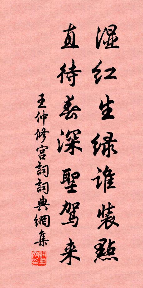 古詩文歷史字典書法欣賞書法字典國語詞典說文解字康熙字典古漢語字典濕紅生綠誰裝點,直待春深聖駕來王仲修 《宮詞》名句出處出自宋代王仲修的《宮詞》全文:二月瓊林花未開,風煙冪冪鎖樓台。濕紅生綠誰裝點,直待春深聖駕來。王仲修詩詞大全名句書法欣賞濕紅生綠誰裝點,直待春深聖駕來書法作品王仲修名句,宮詞名句名句推薦憶溷鄂王城,得子好兄弟陳三立《贈汪社耆》三陽不與寒威盡,一氣還從暖律回度正《送博寺丞》罪籍半除猶望赦,漁陽遺種被恩光晁說之《至日早雪時郊祀畢壬寅之一》宮中聖人奏雲門,天下朋友皆膠漆杜甫《憶昔二首》覩遺物兮心崩摧嵇康《思親詩》子夜天無雲,稀星耿頑碧秦觀《清夜》久與林壑辭,及來松杉大岑參《終南山雙峰草堂作》心回元化位天地,手挈魁柄扶邦家度正《壽制置吳侍郎》門掩小蓬萊張可久《太常引 永嘉林熙翁城南舊院》文章詩最豪,溟漲助筆力黃庭堅《送蒲元禮南歸》傑閣同禪院,懸河有辯才戴表元《登崇寧閣》誰家千金郎,車馬塞閭里汪應辰《題鄭氏籯金堂》父疾亦云篤,如何豁爾平林同《賢者之孝二百四十首徐份》明知近前店,暗覺展修途楊萬里《甯橋小渡》雨色凋湘樹,灘聲下塞禽杜荀鶴《湘中秋日呈所知》詩詞推薦次張守韻四首劉子翬〔宋代〕久分閩郡竹,屢賜漢庭金。才刃硎新發,恩波海並深。冠銷乘間禍,民有不欺心。祗恐鋒車起,雲霄路莫尋。福州古田宰李堪楊億〔宋代〕由來百里應華星,何況牛刀乍發硎。五柳不須輕印綬,七閩聊且訪圖經。雪天暢飲連浮白,海縣抄書剩殺青。公暇酒中十詠酒篘皮日休〔唐代〕翠篾初織來,或如古魚器。新從山下買,靜向甔中試。輕可網金醅,疏能容玉蟻。自此好成功,無貽我罍恥。思齊化士釋崇岳〔宋代〕拔劍紅塵斬萬機,直教佛祖浪頭低。我儂贏得呵呵笑,老倒思賢愧不齊。憶別張載〔宋代〕柳絮飛時與君別,南樓把酒看明月。月似當年離別時,柳絮如君何處飛。千書百書要相就,思君不見令人瘦。念君雨中臥病有感陸游〔宋代〕病臥窮山白髮新,不堪風雨過中春。歌呼空倚一尊酒,零落漸無吾輩人。千載詩書成長物,兩京宮闕委胡塵。非熊禮香山湯禪師釋紹曇〔宋代〕寂寞空山宴坐時,千鈞重寄一絲危。直饒雙眼頻開合,著處由來不自知。南池雜詠五首寒山皎然〔唐代〕侵空撩亂色,獨愛我中峰。無事負輕策,閒行躡幽蹤。眾山搖落盡,寒翠更重重。將往襄陽一日大雨項安世〔宋代〕誰報江神我欲西,怕傳新句落檀溪。江頭一雨泥三尺,車沒雙論馬沒蹄。李遙買杖沈括〔宋代〕隨州大洪山作人李遙, * 亡命。逾年,至秭歸,因出市,見鬻柱杖者,等閒以數十錢買之。是時,秭歸適又有邑