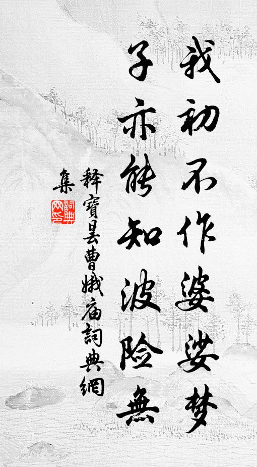 古詩文歷史字典書法欣賞書法字典國語詞典說文解字康熙字典古漢語字典我初不作婆娑夢,子亦能知波險無釋寶曇 《曹娥廟》名句出處出自宋代釋寶曇的《曹娥廟》全文:我初不作婆娑夢,子亦能知波險無。風卷潮來壯魂在,行人釃酒濕庭梧。釋寶曇詩詞大全名句書法欣賞我初不作婆娑夢,子亦能知波險無書法作品釋寶曇名句,曹娥廟名句名句推薦交手當家親父子,為君別本記傳燈陳造《再次韻贈張德恭》相趁入寒竹,自收當晚闈梅堯臣《秋日家居》野橋沖臘寒梅白,莫要登臨憶侍郎林光朝《送別陳侍郎應求知泉州》去時莫待淋頭雨,歸日須防徹骨寒邵經國《上樓參政》隱几無言無有得,南窗晴日暖侵軒蘇轍《次韻毛君山房即事十首》繞湖秋色去茫茫,塔立峰端表自強葉適《次韻喻叔奇九日》自憐白髮衰如許,空對花前憶故人李曾伯《又用韻》想在日,勸他家學道,不肯回頭馬鈺《滿庭芳 嘆骷髏》別有真天趣,月寒秋夜深方回《冷泉亭》來此勸農申告誡,要渠僇力事耕鋤林采《勸耕》獨上層樓意已闌,欄乾倚遍悄無言洪皓《重九彥清出獵獨處無聊》問知人苦樂,米價不多高黃庶《和劉卿材十詠草市》滿盪荷開從北看,危欄塔立向西瞻張鎡《七夕前一夜翠樾堂設醮》夜盡醉弦歌,日高臥煙樹司馬扎《美劉太保》寄言賞心客沈約《游沈道士館詩》詩詞推薦詠鐵馬同雲臣賦陳維崧〔清代〕赤兔無成,烏騅不逝,屈作小廊檐馬。碎珮琮琤,叢鈴戛(王+吉),依稀客窗閒話。更烏鵲時相觸,霜欺兼雨打新年五首蘇軾〔宋代〕海國空自暖,春山無限清。冰溪結瘴雨,雪菌到江城。更待輕雷發,先催凍筍生。豐湖有藤菜,似可敵蓴羹。句吳璋〔宋代〕龍肝雉尾瓜蓴好,玉核金槌棗柰香。只有牛心猶未割,願如逸少得先嘗。蒲門戍觀海作陳陶〔唐代〕廓落溟漲曉,蒲門郁蒼蒼。登樓禮東君,旭日生扶桑。毫釐見蓬瀛,含吐金銀光。草木露未晞,蜃樓氣若藏。欲游春晚雜興十二首方回〔宋代〕城市塵埃不見詩,西村東塢可尋誰。夏前十日嘗新麥,政是江南最好時。題劉正之少陵像二首趙蕃〔宋代〕我今即有湖南役,準擬扁舟泊耒陽。敬謝此圖非久別,會傾桂酒奠椒漿。京口喜雨樓落成呈史固叔侍郎戴復古〔宋代〕京口畫樓三百所,第一新樓名喜雨。大鵬展翼到中天,化作檐楹不飛去。一日登臨天下奇,華燈照夜萬琉璃。上與詠梅石延年〔宋代〕柔梢繁白玉鈿封,忍盡嬌心恨幾重。姑射真人冰作體,廣寒仙女月為容。江南春信香猶在,樓上晨妝粉不供。可惜和邢惇夫秋懷十首黃庭堅〔宋代〕殘暑已俶裝,好風方來歸。未能疏團扇,且複製秋衣。高蟬遂如許,長吟送落暉。相戒趣女功,莎蟲能表微。隱居秋日林逋〔宋代〕行藥歸來即杜門,嘯台秋色背人群。幽蟲傍草晚相映,遠水著煙寒未分。高亢可能稱獨行,窮空猶擬賴斯文。過從