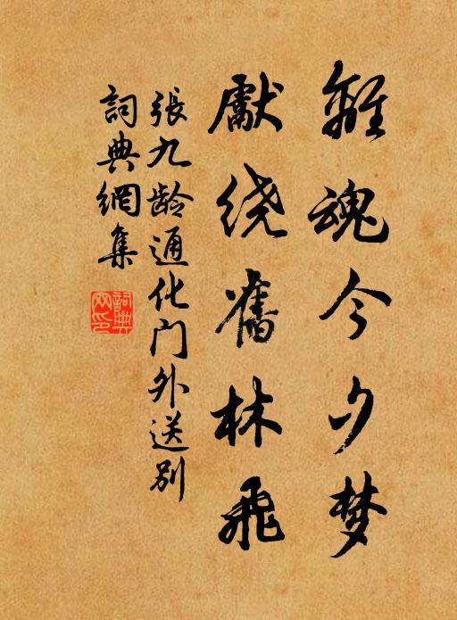 古詩文歷史字典書法欣賞書法字典國語詞典說文解字康熙字典古漢語字典離魂今夕夢,先繞舊林飛張九齡 《通化門外送別》名句出處出自唐代張九齡的《通化門外送別》全文:屢別容華改,長愁意緒微。義將私愛隔,情與故人歸。薄宦無時賞,勞生有事機。離魂今夕夢,先繞舊林飛。張九齡詩詞大全名句書法欣賞離魂今夕夢,先繞舊林飛書法作品張九齡名句,通化門外送別名句名句推薦口中調簧定何益,下啄蚯蚓孰曰清梅堯臣《和歐陽永叔啼鳥十八韻》酒惡病成惱,春深愁轉加袁說友《晚春過雨》願風與良便,吹入神仙宅皮日休《太湖詩。初入太湖(自胥口入,去州五十里)》詩欲少吟,不如不吟邵雍《答傅欽之》有時閒客散,始覺細泉流齊己《題張氏池亭》河魚竟中潰,午枕猶扶頭沈與求《子修步屧相過屬疾不能倒屣戲贈》風物更清幽韓琦《安陽好/憶江南》昭陵仁聖,與天同功黃庭堅《江氏家藏仁宗皇帝墨跡贊》既得遮些根蒂固,大家搖扇取風涼釋原妙《偈頌六十七首》一杯千歲,嫩涼時節,暑氣雨前收胡祗遹《太常引 為汪奉御夫人壽日》寄語鄰牆客,茲非行樂時賀鑄《和錢適德循寓懷二首》三日奉齋潔,百骸祛垢氛王禹偁《太一宮祭回馬上偶作寄韓德純道士》諒彼漢陰人,假修匪吾徒楊時《藏春峽老圃亭》紅雲飄緲,清風蕭颯,半醉岸鳥巾許有壬《太常引》振其鞀鼓,潔以鉶羹佚名《郊廟歌辭。周宗廟樂舞辭。禋順》詩詞推薦和應之盛夏張耒〔宋代〕驅馬畏炎暑,杜門常鮮歡。吳綃朝扇薄,越布夜衾單。飲沼山禽渴,沾泥雨果殘。二年薇與蕨,實厭野人餐。論語絕句一百首張九成〔宋代〕哀公真自不尋常,雖是年飢亦較量。二猶不足如何徹,紬繹斯言味更長。金陵雜興二百首蘇泂〔宋代〕兵機將略總如神,儒術仍參席上珍。補得國風成百詠,不妨幕府有詩人。黃檗釋安永〔宋代〕生緣不在北門村,行腳何曾參百丈。夢裹思歸黃檗山,無端平地堆青嶂。柳梢青(趙端禮生日)李彌遜〔宋代〕壽煙籠席。採蓮新按,舞腰無力。占盡風光,人間天上,今夕何夕。藍袍換了萊衣,慶歲歲、君恩屢錫。連夜歡聲送董守郭印〔宋代〕房相風流遠,寥寥四百年。西湖有陳跡,水竹尚蒼然。公來刺是邦,魚鳥亦安全。官閒得放曠,樂事踵前賢。亭台賦將軍木王執禮〔宋代〕脫急曾聞匿異人,論功僅得號將軍。長身已逐雲煙去,賴有孫枝記舊勛。侯家胡宿〔唐代〕洞戶春遲漏箭長,短轅初返雒陽傍。彩雲按曲青岑醴,瀋水薰衣白璧堂。前檻蘭苕依玉樹,後園桐葉護銀床。宴殘漁家傲歐陽修〔宋代〕暖日遲遲花裊裊。人將紅粉爭花好。花不能言惟解笑。金壺倒。花開未老人年少。車馬九門來擾擾。行人莫羨長安偈釋彥充〔宋代〕世尊不說說,迦葉不聞聞。水流黃葉來何處,牛帶寒鴉過遠村。
