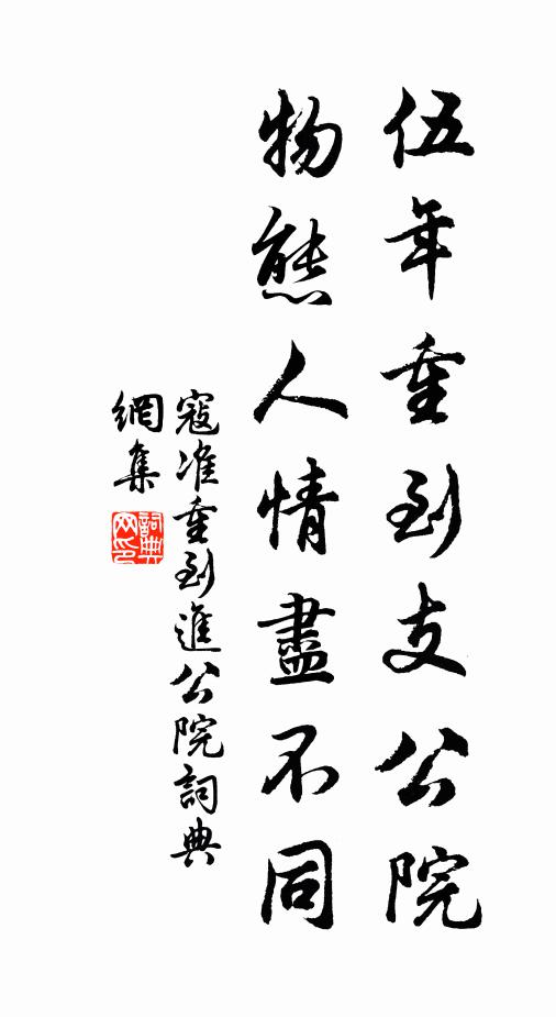 古詩文歷史字典書法欣賞書法字典國語詞典說文解字康熙字典古漢語字典伍年重到支公院,物態人情盡不同寇準 《重到進公院》名句出處出自宋代寇準的《重到進公院》全文:伍年重到支公院,物態人情盡不同。唯有寒檉暗秋色,依然蟬噪夕陽中。寇準詩詞大全名句書法欣賞伍年重到支公院,物態人情盡不同書法作品寇準名句,重到進公院名句名句推薦生前住在何處馬鈺《滿庭芳 贈塗山於先生》故人青雲端,或在江海涯林景熙《贈蘭坡星翁》夢回一笑知何有,穩臥家山寂寞濱劉應時《義上人歸自武林戲作四偈》我聞曾嚴黎,蓋自入學初趙蕃《呈嚴黎二師並寄韓季蕭》堯樽列鐘鼓,漢闕辟鉤陳崔國輔《九日侍宴應制》陋巷孤寒士,出門苦棲棲白居易《傷友 又雲傷苦節士。》歲事今無幾,清霜苦見侵蔡宰《望洞陽》青霓叩額通綠章,鴻龍開門宮中香李復《樂章五曲》才愧文章士,名當諫諍臣崔峒《初除拾遺酬丘二十二見寄(一作初拜命酬丘丹見贈)》風散花意謝,鳥還山光夕韋應物《過昭國里故第》未能江海去,聊作稻粱謀喻良能《有感二首》赫赫容台上,千祀耀平津任希古《和左僕射燕公春日端居述懷》西園斗結鞦韆了陳允平《玉樓春》爭似炎爐頭柮榾高燒,紙衾包卻暖烘烘釋紹曇《偈頌一百零四首》收視而返聽,自得於見聞李處權《潛心齋》詩詞推薦黃金縷秦覯〔宋代〕妾本錢塘江上住,花落花開,不管流年度。燕子銜將春色去,紗窗幾陣黃梅雨。 斜插犀梳雲半吐,檀板輕敲,唱送端上人游天台施肩吾〔唐代〕師今欲向天台去,來說天台意最真。溪過石橋為險處,路逢毛褐是真人。雲邊望字鐘聲遠,雪裡尋僧腳跡新。只可帥節留先生兩年粵服氓獠安之一日疏十宜欲袖陳元晉〔宋代〕手疏宜歸十,心知昨夢非。鴻冥空費弋,鷗舞早知機。風急推潮落,雲閒剩雨歸。攀轅多少淚,海岩濕斜暉。地爐姜特立〔宋代〕穴處嘗聞太古時,規爐鑿地亦幾希。便成簡易真淳俗,坐喚兒孫共打圍。呈萬菴十章歸山白玉蟾〔宋代〕生死輪迴第幾番,塵塵劫劫不曾閒。一潭湛綠是非海,千尺粉青人我山。性地靈苗思水國,心天明月掩雲關。衣中歲暮度朋山嶺登山庵追慕先人不勝悲愴因用楊蒲壽宬〔宋代〕歲寒霜露感,況復度高深。雲木猶如此,苔磯不忍臨。溪流一線碧,門對兩山岑。含涕危亭曲,遺言尚可尋。依韻奉和永叔感興五首梅堯臣〔宋代〕既負天下望,必憂天下責。每聞諫諍辭,苦意多矯激。心存義勇赤,氣與虹霓白。所論言必從,豈若水投石?陰邪次韻送郝同知還閩二首方回〔宋代〕平生奔走遍區中,老尚流離作寓公。合坐黃堂稱太守,願求丹劑學仙翁。繄誰虎豹占文變,何限貂蟬出武功。可似雪後楊冠卿〔宋代〕野日茅茨短,荒村霰雪余。溪流山足裂。谷迥鳥聲虛。矯首懷新隱,歸窗有舊書。殘年甘飽飯,何必事名譽。揚州慢·淮左名都姜夔〔宋代〕淳熙丙申至日,予過維揚。夜雪初霽,薺麥彌望。入其城,則四顧蕭條,寒水自碧,暮色漸起,戍角悲吟。予懷愴