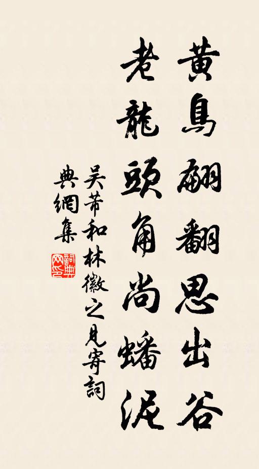 古詩文歷史字典書法欣賞書法字典國語詞典說文解字康熙字典古漢語字典黃鳥翩翻思出谷,老龍頭角尚蟠泥吳芾 《和林徽之見寄》名句出處出自宋代吳芾的《和林徽之見寄》全文:涉世無堪足亂難,蕭蕭風雨一聲雞。故人別後乾坤窄,三徑歸來草木迷。黃鳥翩翻思出谷,老龍頭角尚蟠泥。一尊濁酒無人共,又是悲吟到日西。名句書法欣賞黃鳥翩翻思出谷,老龍頭角尚蟠泥書法作品吳芾名句,和林徽之見寄名句名句推薦無因送丹旐,老淚灑西風樓鑰《趙提荊輓詞》排難知臣節,攻疑定國章皎然《因游支硎寺寄邢端公》聊且夜行游曹植《贈徐幹詩》若使此山身可隱,上皇不作遠行人汪元量《花石綱》朝陽林畔,切切痛哀聲山主《臨江仙》妖氣欲昏唐社稷,夕陽空照漢山川韋莊《中渡晚眺》萬里雙芒屩,終年一布裘陸游《晚雨》入直承明凡幾年,天上奇書盡曾見壑大《西湖為陳世崇餞行》寒沙漠漠鳥飛去,野路悠悠人自還曾鞏《北渚亭雨中》從橫紗用劍兩枝,出入無方馬一雙徐端《丙申元日》心情多少在,六十二三人白居易《感春》君不見長安公侯家,六月不如暑劉子翬《夏日吟》正教流通千載遇尹志平《鳳棲梧 秋陽觀作》此理從來自不疑,奈何於此不投時張九成《論語絕句一百首》自在逍遙也王哲《黃鶴洞中仙》詩詞推薦歲暮自廣江至新興往復中題峽山寺四首許渾〔唐代〕夜醉晨方醒,孤吟恐失群。海鰌潮上見,江鵠霧中聞。未臘梅先實,經冬草自薰。樹隨山崦合,泉到石棱分。虎跡和吏部李侍郎見示秋夜望月憶諸侍郎之什…因命仆繼作張九齡〔唐代〕清秋發高興,涼月復閒宵。光逐露華滿,情因水鏡搖。同時亦所見,異路無相招。美景向空盡,歡言隨事銷。忽聽宿濠州高唐館閻欽愛〔宋代〕借問襄王安在哉,山川此地勝陽台。今朝寓宿高唐館,神女何曾入夢來。寄谷老胡仲弓〔宋代〕抖擻征衣著,京塵點涴深。羨君有丘壑,愧我未山林。卜隱中年事,懷人靜夜心。何時遂歸興,杯酒共清吟。偈頌五十一首釋大觀〔宋代〕淮雲慘澹,淮水枯竭。徑山老子無言說,喝得岩崖成百裂,末後全提太親切。笑不徹,哭不徹,憍梵缽提驚吐舌。古驛陸游〔宋代〕古驛橋邊艇子橫,每因羈旅愜幽情。窗間月落無花影,枕上潮來有櫓聲。舊友凋零歸夢想,新詩邂逅得天成。今朝送懷英訪廬山曹勛〔宋代〕台岳相逢麋鹿墟,識公風骨秀而癯。山林訪道誠多切,雲水期真進所如。爐鼎丹砂知煉己,關河霜霰不妨渠。它時長至前夕書寄陸嚴州張鎡〔宋代〕銅爐熟火暖無煙,一盞清燈紙帳邊。遲睡頗如除夜景,新陽方幸好晴天。詩成水閣梅堪折,信斷山城雁不傳。莫待游長安諸寺聯句。平康坊菩薩寺。書事聯句段成式〔唐代〕悉為無事者,任被俗流憎。 ——鄭符客異愛竹歌鄭思肖〔宋代〕此君氣節極偉特,令人愛之捨不得。遍造山水有竹處,不問主人識不識。朝朝暮暮看不足,感得碧光透雙目。一旦