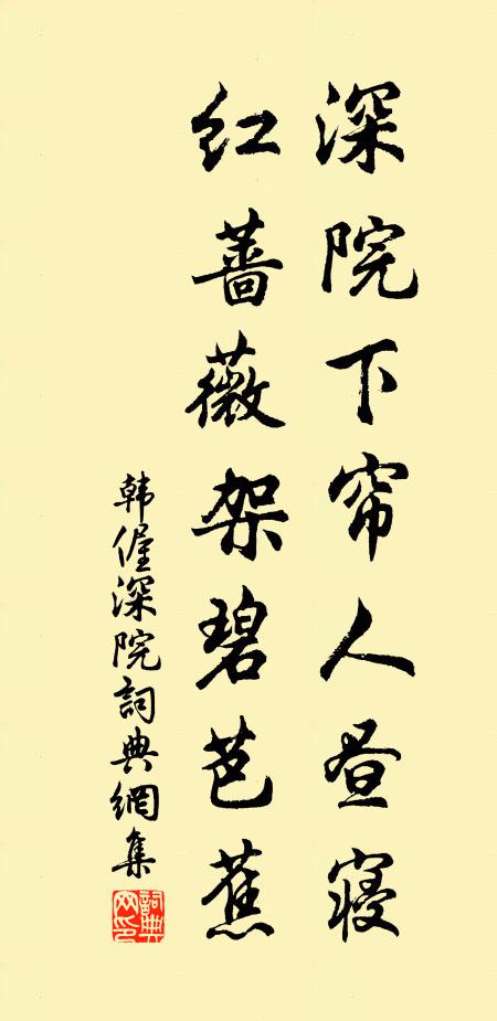 古詩文歷史字典書法欣賞書法字典國語詞典說文解字康熙字典古漢語字典深院下簾人晝寢,紅薔薇架碧芭蕉韓偓 《深院》名句出處出自唐代韓偓的《深院》全文:鵝兒唼喋梔黃嘴, 鳳子輕盈膩粉腰。深院下簾人晝寢, 紅薔薇架碧芭蕉。韓偓詩詞大全名句書法欣賞深院下簾人晝寢,紅薔薇架碧芭蕉書法作品韓偓名句,深院名句名句推薦白雲無心間泫水,清風何意自開花。陽枋《句》風波一震盪,飄流安可任張嵲《秋懷》隨潮吳榜駛,轉浦楚山微梅堯臣《明州推官鄭先輩》自裹自題還自愧,揠苗應笑宋人然蔡挺《南京種山藥法》綺羅諸院夜,鞍馬五陵秋張耒《少年》我行離邑已萬里鮑照《擬行路難》我皇膺運太平年,四海朝宗會百川佚名《雜曲歌辭。太和第五徹》關吏不勞重借問,棄繻生擬入耶溪皮日休《題潼關蘭若》艷女皆妒色,靜女獨檢蹤孟郊《靜女吟》雷電歸驅使,雲天託庇庥何異《大華山》知君懷百憂,雖出難久客薛師石《喜翁卷歸》孜孜戒吾屬,天物不可暴陸龜蒙《南涇漁父》東風自送歸帆去,吹得亂紅沾袖劉辰翁《摸魚兒》自作銘詩差實錄,免教人謗退之諛劉克莊《戲題山庵二首》仰視白日光,浩蕩浮雲流司馬光《秋懷呈景仁》詩詞推薦車駕幸玉津園晚歸進詩洪邁〔宋代〕五更猶自雨如訂,無限都人仰翠華。翻手作雲方悵望,舉頭見日共驚嗟。天公的有施生妙,帝力堪同造物夸。上苑三山亭李昴英〔宋代〕山中招提鼎足踞,路如丁字分頭入。還看港漢紛長繩,俯見阜丘才小笠。班荊坐仆縱之息,爭解綠荷撮紅粒。群然田園作孟浩然〔唐代〕弊廬隔塵喧,惟先養恬素。卜鄰近三徑,植果盈千樹。②粵余任推遷,三十猶未遇。書劍時將晚,丘園日已暮。③壺山二首陳藻〔宋代〕萬古凌空孤拄軒,百年那得此身存。醉醒欲掃雲開眼,興逸誰歸月掩門。走遍莆陽隨處有,游觀天下見人論。細瞻送林知錄觀劉克莊〔宋代〕除卻留耕知己外,其他蹊徑不曾鑽。泉人浪自誇清史,冰氏安能動熱官。一鶴隨身來去易,匹雛無力挽攤難。東風適越留別朱新仲曾幾〔宋代〕扁舟綠漲漕渠時,解釋離懷政用詩。管鮑交朋無變態,朱陳嫁娶有佳期。長洲茂苑著身久,秦望鏡湖行腳宜。二浙送王梅州二首劉克莊〔宋代〕州境與潮鄰,徐行止浹旬。瘴鄉元一氣,鹽子亦吾民。日晏煙嵐斂,兵餘戶口貧。定將田裡事,閉合細條陳。秋晚歸廬山留別道友周賀〔唐代〕病起陵陽思翠微,秋風動後著行衣。月生石齒人同見,霜落木梢愁獨歸。已許衲僧修靜社,便將樵叟對閒扉。不嫌蒼水黃宗羲〔清代〕少年苦節何人似?得此全歸亦稱情。廢寺醵錢收棄骨,老生禿筆記琴聲。遙空摩影狂相得,群水穿礁浩未平。兩世詠梅五十首呈史尚書釋紹嵩〔宋代〕梅花兩樹照春陰,花徑吹香可細尋。疏影橫斜水清淺,平生和靖最知音。
