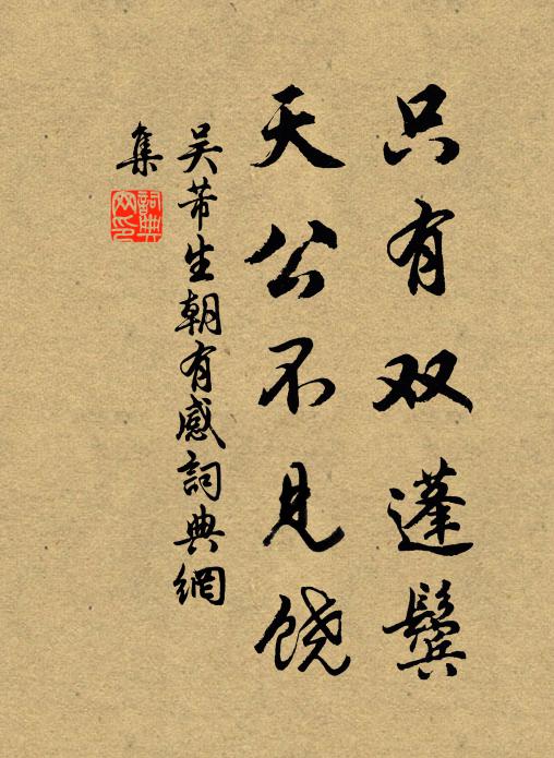 古詩文歷史字典書法欣賞書法字典國語詞典說文解字康熙字典古漢語字典只有雙蓬鬢,天公不見饒吳芾 《生朝有感》名句出處出自宋代吳芾的《生朝有感》全文:姑溪來幾日,兩度見生朝。親舊三年隔,鄉關千里遙。梅還開舊樹,柳更長新條。只有雙蓬鬢,天公不見饒。名句書法欣賞只有雙蓬鬢,天公不見饒書法作品吳芾名句,生朝有感名句名句推薦梅花飛雪滿霜洲,洲上行人去莫留華岳《送趙右秋二首》政教豈殊途,飾吏貴儒術熊禾《興程縣尹》黃間遙想前驅弩,白下空攀遠別枝周必大《送別邢懷正直閣赴江西提舉二首》歸業臥華堂,瑣窗承文楣徐鉉《詠史》微風時動牖,殘燈尚留壁韋應物《秋夜二首》翠袖擁雲扶不起,玉簫吹過小樓東王冕《紅梅 十三》調聲不用琴庾信《夜聽搗衣詩》仍聞薄宦者,還事田家衣李頎《東京寄萬楚》車馬城中早上忙,子城內里看星郎劉過《上袁文昌知平江五首》點檢召棠遺愛,醞釀潘輿喜色,英裔蔚文彪張榘《凱歌(為壑相壽)》江湖芥舟小,歲月翎箭疾戴表元《朱使君家諸郎將別十一韻》花開不逐春庾信《鏡詩》古道微如線,吾儕各勉旃劉克莊《贈高九萬並寄孫季蕃二首》笑憐從事落烏紗令狐楚《奉和嚴司空重陽日同崔常侍崔郎及諸公登龍山落帽台佳宴》曠士慕林谷,羈人辱泥塗陳師道《謝傅監》詩詞推薦句釋惠崇〔宋代〕景霽雲回合,秋生樹動搖。詠史下王荊公陳普〔宋代〕兩鳥相酬聲沸天,治平重新一啼鵑。鴛鸞鷗鷺無棲處,緘口於今三百年。觀邵不疑學士所藏名書古畫梅堯臣〔宋代〕野性好書畫,無力能自致。每遇高趣人,常許出以視。邵侯多奇玩,留我特開笥。首觀阮與杜,驢上瞑目醉。韓乾次韻宗偉閱番樂范成大〔宋代〕十日閒愁晝掩關,起尋一笑共清歡。罷休詩社工夫淡,先淨書生氣味酸。盡遣余錢付桑落,莫隨短夢到槐安。繡靴鶴褚載〔唐代〕欲洗霜翎下澗邊,卻嫌菱刺污香泉。沙鷗浦雁應驚訝,一舉扶搖直上天。聞搗衣趙孟頫〔元代〕露下碧梧秋滿天,砧聲不斷思綿綿。北來風俗猶存古,南渡衣冠不後前。苜蓿總肥宛騕□[1],琵琶曾泣漢嬋娟登曠軒劉過〔宋代〕去春曾與客,攜手過橋來。寺陰松極美,塢深桃不開。紅塵萬里去,白首一年回。淨洗曠軒眼,雪天間看梅。浣溪沙晏幾道〔宋代〕小杏春聲學浪仙。疏梅清唱替哀弦。似花如雪繞瓊筵。腮粉月痕妝罷後,臉紅蓮艷酒醒前。今年水調得人憐。夜合花孫惟信〔宋代〕風葉敲窗,露蛩吟瓮,謝娘庭院秋宵。鳳屏半掩,釵花映燭紅搖。潤玉暖,膩雲嬌。染芳情、香透鮫綃。斷魂留夢卜運算元(重陽後數日避亂行雙源山間,見菊復用前韻。時以九江郡懇辭未報)向子諲〔宋代〕時菊碎榛叢,地僻柴門靜。誰道村中好客稀,明月和清影。天地一蘧廬,夢事慵思省。若個知余懶是真,心已如灰