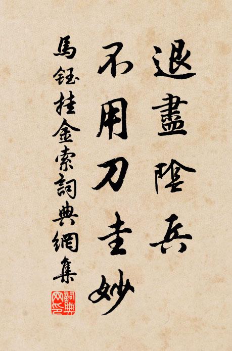 古詩文歷史字典書法欣賞書法字典國語詞典說文解字康熙字典古漢語字典退盡陰兵,不用刀圭妙馬鈺 《掛金索》名句出處出自元代馬鈺的《掛金索》全文:三更里,明月正把乾坤照。嚇得邪魔,千里不見了。退盡陰兵,不用刀圭妙。海底龜蛇,自然相盤繞。馬鈺詩詞大全名句書法欣賞退盡陰兵,不用刀圭妙書法作品馬鈺名句,掛金索名句名句推薦波神信雄桀,灝漾方無垠張嵲《四月旦大雨晝夜不止者兩日微水一夕暴漲》去序三朝聖,行崩萬國天王安石《仁宗皇帝輓辭四首》大雅次翁,用心不忘黃庭堅《贈別李次翁》浩浩資深源汲汲,翹松野鶴表吾師釋印肅《偈頌十四首》我懷吾自會,惡句莫多傳張鎡《老筆贈銛上人二首》幾日北風江海立胡舜陟《漁家傲(江行阻風)》洛陽舊有神明宰,輦轂由來天地中沈佺期《餞唐永昌(一作餞唐郎中洛陽令)》亦欲署門還嬾去,死生貴賤本悠悠陸游《老病謝客或者非之戲作》招朋一飲舒清興,要須脫畧任天真章甫《放歌招孫祖訓俞國寶飲》芳天新霽惠風和,軟錄平堤凝不波張蘊《西湖清明》艷冶青樓女,風流似楚真孫光憲《南歌子》竹上斕斑,總是相思淚趙令畤《蝶戀花》旱澇政本農,偏惠及閒架薛師石《梅雨》不入翹材館,甘為老抱關劉克莊《題坡公贈鄭介夫詩三首》紙尾書名大,松邊得句遲劉植《送周知丞之官桐廬》詩詞推薦漫書五首司空圖〔唐代〕長擬求閒未得閒,又勞行役出秦關。逢人漸覺鄉音異,卻恨鶯聲似故山。溪邊隨事有桑麻,盡日山程十數家。莫怪至節寄家信趙必象〔宋代〕薄宦駸駸已及瓜,寒梅羞見舊時花。年來吟苦形成鶴,客里愁多鬢減鴉。浮世有身元大患,此生何處是真家。白雲慶塗權尉三首陳元晉〔宋代〕朝憂猛虎夕長蛇,吊戰場方憶李華。自笑病來寬頻眼,那能老去植幢牙。如君政合登東閣,顧我惟堪老北涯。賓主湘弦怨孟郊〔唐代〕昧者理芳草,蒿蘭同一鋤。狂飆怒秋林,曲直同一枯。嘉木忌深蠹,哲人悲巧誣。靈均入回流,靳尚為良謨。我願念奴嬌(梅)趙長卿〔宋代〕蘭枯菊槁。是返魂香入,江南春早。谷靜林幽人不見,夢與梨花顛倒。雪刻檀心,玉勻豐頰,妝趁嚴鍾曉。海山么【正宮】醉太平_寒食珠簾外王元鼎〔元代〕寒食珠簾外燕飛,喬木上鶯啼,鶯鶯燕燕正寒食,想人生有幾。有花無酒難成配,無花有酒難成對。今日有花有酒邛杖劉克莊〔宋代〕珍重邛山鶴膝枝,十年南北慣攜持。扶登右壁寧嫌峻,拄過溪橋肯避危。昔涉畏途麾不去,今行平地棄如遺。主人如夢令(題漁樂圖)張炎〔宋代〕不是瀟湘風雨。不是洞庭煙樹。醉倒古乾坤,人在孤篷來處。休去。休去。見說桃源無路。菩薩蠻(採蓮女)王之道〔宋代〕藕絲衫剪輕紅窄。衫輕不礙瓊膚白。縵鬢小橫波。花樓東是家。上湖閒蕩槳。粉艷芙蓉榜。湖水亦多情。照妝天底琴曲歌辭。琴歌顧況〔唐代〕琴調秋些,胡風繞雪。峽泉聲咽,佳人愁些。