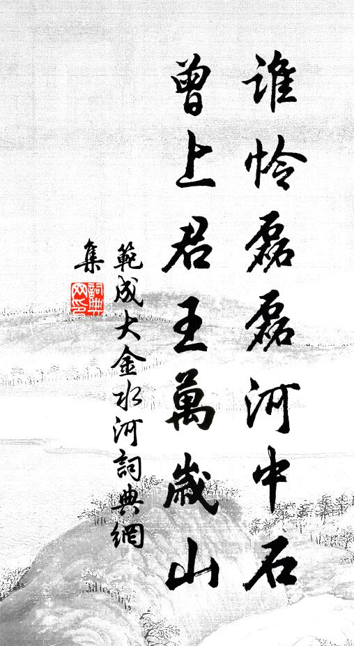 古詩文歷史字典書法欣賞書法字典國語詞典說文解字康熙字典古漢語字典誰憐磊磊河中石,曾上君王萬歲山范成大 《金水河》名句出處出自宋代范成大的《金水河》全文:菜市橋西一水環,宮牆依舊俯清灣。誰憐磊磊河中石,曾上君王萬歲山。范成大詩詞大全名句書法欣賞誰憐磊磊河中石,曾上君王萬歲山書法作品范成大名句,金水河名句名句推薦屈指吾生餘幾,多病故人痛飲,此事正愁餘辛棄疾《水調歌頭(送太守王秉)》重陽登閏序,上界葉時巡劉憲《閏九月九日幸總持寺登浮圖應制》淮陽名都會,爽塏太昊墟張耒《冬日放言二十一首》重門寂寂經初夏,盡日垂簾細雨中寇準《初夏雨中》那知鐵馬浮江日,卻是神僧建塔功羅公升《燕城讀史》湔裙獨上小漁磯,襪羅微濺春泥顧貞觀《畫堂春·湔裙獨上小漁磯》憑誰同把酒,清興窅相望司馬光《館宿遇雨懷諸同舍》彩雲空洞穴,古木上藤蘿郭印《游酆都觀二首》飲罷襟懷還寂寞,歡余情緒卻無聊邵雍《和商守新歲》自此春秋筆,還書大有年宋祁《南郊祠所上章攝事二首》又見雁南飛,行人幾風歸胡宏《憶伯氏三首》處世若大夢,胡為勞其生李白《春日醉起言志》已驚弱柳萬絲垂,尚有殘梅一枝亞蘇軾《定惠院寓居月夜偶出》觀上又分明月影,漫漫長夜與誰論王奕《見陳月觀二首》北禪釋子應相笑,樹癭多年變木鵝李廌《楊十三虞卿在希顏上人房納涼余時在村舍歸和》詩詞推薦赤壁詞(招韓無咎游金山)陸游〔宋代〕禁門鍾曉,憶君來朝路,初翔鸞鵠。西府中台推獨步,行對金蓮宮燭。蹙繡華韉,仙葩寶帶,看即飛騰速。人生難左目痛六言九首劉克莊〔宋代〕詩到歌行尤妙,傳與國語並行。艱辛張籍病瞎,浮誇左丘失明。句諶祜〔宋代〕五更歷轉花紅在,萬里晴光草綠敷。和鄭校書夏日游鄭泉劉得仁〔唐代〕太虛懸畏景,古木蔽清陰。爰有泉堪挹,閒思日可尋。來聞鳴滴滴,照竦碧沈沈。幾脈成溪壑,何人測淺深。澄時長安悶作李涉〔唐代〕宵分獨坐到天明,又策羸驂信腳行。每日除書空滿紙,不曾聞有介推名。庚午蛾眉亭張埴〔宋代〕漠漠西淮雲散,滔滔東海潮歸。鷗鳥飛來石壁,柳花撲上人衣。黃太守元授輓詞二首楊萬里〔宋代〕我忝通家子,公如父行親。一書雖不欠,半面遂無因。旅櫬千江遠,銘旌兩竹新。慶門寧有此,造物豈其仁。諸公載酒賀余休致水村農卿有詩次韻劉克莊〔宋代〕目眚陳編懶更窺,博通似恐泄天機。大愚苦要騎麟下,小黠猶能化鶴歸。覓句瘦肩兩山聳,絕糧乾咽上池肥。平生感寓三首戴復古〔宋代〕古今通一理,趨鄉自多門。賢士玉成美,貪夫金注昏。誰知身是患,人以道為尊。前輩□□死,姓名千載存。偈頌一百三十六首釋惟一〔宋代〕秋風捲地,秋水連天。千山影瘦,萬木蕭然。漁笛數聲江上月,樵歌一曲嶺頭煙。