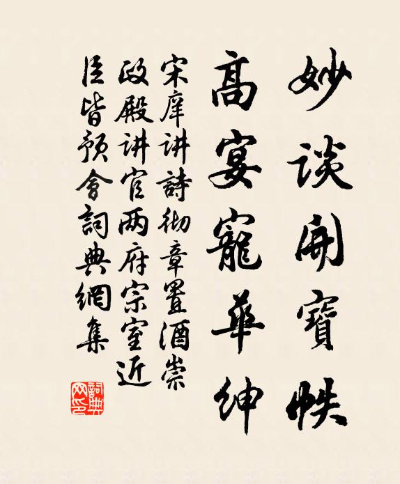 古詩文歷史字典書法欣賞書法字典國語詞典說文解字康熙字典古漢語字典妙談開寶帙,高宴寵華紳宋庠 《講詩徹章置酒崇政殿講官兩府宗室近臣皆預會》名句出處出自宋代宋庠的《講詩徹章置酒崇政殿講官兩府宗室近臣皆預會》全文:經藝尊詩學,書林眷講臣。禮將恩並渥,道與日俱新。聖問臨篇裕,王風即席淳。妙談開寶帙,高宴寵華紳。朝笏儀庭鷺,宗藩瑞世麟。天漿聊挹斗,帝曲豫回春。惠洽需占象,歡留景駐輪。諸儒稽古力,千載頌逢辰。名句書法欣賞妙談開寶帙,高宴寵華紳書法作品宋庠名句,講詩徹章置酒崇政殿講官兩府宗室近臣皆預會名句名句推薦碧雲深處望湖山,時步松門獨往還釋亮《碧雲寄華藏故舊》良辰便契約沉醉,且置陽關疊後聲陳造《到任交權州事筵致語口號》倚杖望晴雪,溪雲幾萬重賈島《雪晴晚望》沖雪登長道,吾兒更勉旃章潁《送長子琳連州史入覲》熾炭酒行懷往昔,老枝詩句詔來今潛說友《和賈魏公冬大雪詩》久要見襟抱,意態謝炎冷胡寅《贈邢子友》尚繼其志,而世其聲金履祥《鄭北山之元孫扁其樓王適莊為書北山之英四字》青衫白髮不自嘆,富貴在天那得忙蘇軾《送劉道原歸覲南康》從教野草爭先長,勒住名花莫浪開姚勉《丁巳 * 巨浸屢至小民艱食郡侯請諸寓貴》遙識齊侯鼎,新過王母廬王維《贈東嶽焦鍊師》重上逋山,詩清月瘦昏黃吳文英《高陽台(送王歷陽以右曹赴闕)》癸水繞東城,刀兵不用憂翟傑《癸水》久雨村仍暝,新晴物自欣方岳《新晴》多謝君恩許引年,容親白石與清泉吳芾《和蔣無退懷湖山》縱調為野吟,徐徐下雲磴陸龜蒙《樵人十詠樵歌》詩詞推薦水調歌頭(隱括楚詞答朱實甫)馬廷鸞〔宋代〕把酒對湘浦,獨吊大夫醒。當年皇覽初度,飲露更餐英。服以高冠長佩,扈以江蘺薜芷,御氣獨乘清。誰意椒蘭輩與葉淳老、侯敦夫、張秉道同相視新河,秉道蘇軾〔宋代〕荊溪父老愁三害,下斬長蛟本無賴。平生倔強韓退之,文字猶為鱷魚戒。石門之役萬金耳,首鼠不為吾已隘。江湖偈頌一百零二首釋紹曇〔宋代〕以大圓覺,為我伽藍。牛頭向北,馬頭向南。身心安居,平等性智。北負須彌,無息肩地。釋迦老子,不善用心,虞美人(九日和董彥遠)謝薖〔宋代〕金釵盡醉何須伴。萸糝浮杯亂。黃花香返嶺梅魂。好把一枝斜插、向烏雲。坡詞欲唱無人會。桃葉知何在。與君同讀謝幼槃集趙蕃〔宋代〕自汲清泉除硯垢,樹陰微息晚涼初。箇中得意誰知我,筆下忘言我羨渠。秋日仙遊觀贈道士(一作駱賓王詩)王勃〔唐代〕石圖分帝宇,銀牒洞靈宮。回丹縈岫空,復翠上岩櫳。霧濃金灶靜,雲暗玉壇空。野花常捧露,山葉自吟風。林泉讀史二首周必大〔宋代〕舜作九成樂,丹鳳儀其宮。周備既醉福,高岡始鳴桐。區區漢宣帝,雜羈期群聾。惲誅廣漢族,一變高文風。德教與微之唱和來去常以竹筒貯詩陳協律美而成篇因以此答白居易〔唐代〕揀得琅玕截作筒,緘題章句寫心胸。隨風每喜飛如鳥,渡水常憂化作龍。粉節堅如太守信,霜筠冷稱大夫容。煩君避地山中和楊推夜寒韻二首趙必象〔宋代〕山藏皇恐色,溪訴不平聲。落葉啼猿怨,危枝宿鳥驚。林疏風四面,霜冷月三更。酒醒愁無寐,燒松炙到明。【雙調】雁兒落過得勝令杜仁傑〔元代〕美色他生得柳似眉蓮似腮,櫻桃口芙蓉額。不將朱粉施,自有天然態。半折慢弓鞋,一搦俏形骸。粉腕黃金釧,烏