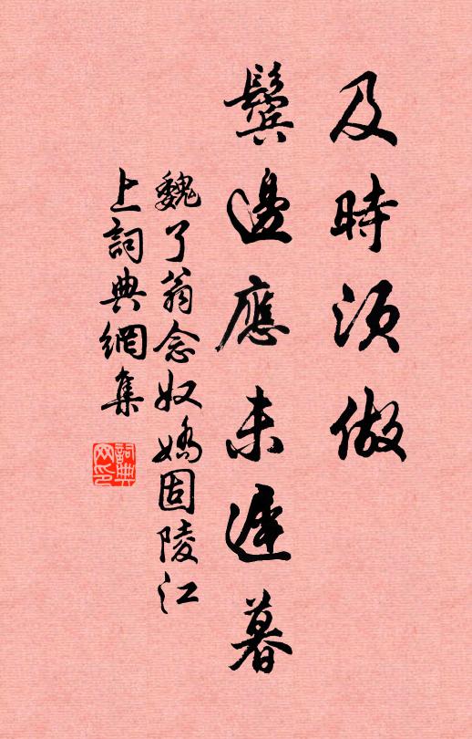 古詩文歷史字典書法欣賞書法字典國語詞典說文解字康熙字典古漢語字典及時須做,鬢邊應未遲暮魏了翁 《念奴嬌·固陵江上》名句出處出自宋代魏了翁的《念奴嬌·固陵江上》全文:固陵江上,暮雲急、一夜打頭風雨。催送江船上水,笑指□山歸去。靴帽叢中,漁樵席上,總是安行處。惟餘舊話,為公今日拈取。見說家近岷山,翠雲平楚,萬古青如故。要把平生三萬軸,喚取山靈分付。廬阜嵩高,睢陽嶽麓,會與岷為伍。及時須做,鬢邊應未遲暮。名句書法欣賞及時須做,鬢邊應未遲暮書法作品魏了翁名句,念奴嬌·固陵江上名句名句推薦銅腥鐵澀不宜泉,愛此蒼然深且寬蘇軾《次韻周穜惠石銚》未暇論奇字,何堪別最良曹勛《寄吳思道》且恁隨緣豁暢尹志平《西江月 時在天長,正當大暑,歸山後,恰值》一念蓋落人境,蓋世路分崩蓋奔史堯弼《游洛陽寶蓋寺贈長老道瓊》繭館桑陰合,新絲已上機王珪《端午內中帖子詞皇后閣》豈知邂逅宜春郡,皎如玉樹相輝映趙蕃《寄答晁百穀元歸》此福地靈岩,西南天柱,洞府名山劉元《木蘭花慢 和陳思濟 洞霄詩集卷九》恩勤懷薦禰,飄泊久依劉沈繼祖《送楊侍郎帥江陵》石刻蛟螭扶繡柱,金盤龍鳳走雕楹王珪《宮詞》清心仁智翁,妙趣於中足陳淳《名陳憲友清軒》石公來斲鼻端塵,無手人來斧鑿親黃庭堅《寄清新二禪師頌》清曉訪君呼不起,寢門一慟淚沾巾陳俊卿《哭林艾軒》安書蓮幕欣頻到,慶事花城喜屢逢郭應祥《鷓鴣天(乙丑歲壽內子)》過盡重湖復過山,陰凝忽變雪花團李呂《歸自南康寄懷朱使君》無為蹈東海,留作濟川桴黃庭堅《次韻楊明叔四首》詩詞推薦刻清遠道士詩,因而繼作顏真卿〔唐代〕不到東西寺,於今五十春。朅來從舊賞,林壑宛相親。吳子多藏日,秦王厭勝辰。劍池穿萬仞,盤石坐千人。金氣登封龐國博年三十八自雲欲棄官隱嵩山作吏隱司馬光〔宋代〕懋德負長才,全牛不足剸。纏為百里宰,驥足殊未展。齒髮方盛強,趣尚已高遠。結庵睋二室,志欲巢絕巘。賢人促拍滿路花(仙呂調)柳永〔宋代〕香靨融春雪,翠鬢嚲秋煙。楚腰纖細正笄年。鳳幃夜短,偏愛日高眠。起來貪顛耍,只恁殘卻黛眉,不整花鈿。有吳姬曲五首戴表元〔宋代〕吳姬舞,朝看成雲暮看雨。偶然欲笑一回眸,錦段金錢落如土。約二趙棋集雨不果來陳造〔宋代〕客子離群意,蕭齋只睡宜。得無新雨嘆,漫有故人期。日力須棋局,風涼入酒卮。轉頭車婦去,相憶各兒痴。送人南歸李益〔唐代〕人言下江疾,君道下江遲。五月江路惡,南風驚浪時。應知近家喜,還有異鄉悲。無奈孤舟夕,山歌聞竹枝。重到東齋二首項安世〔宋代〕人生底事非前定,我與東齋似有緣。別去風光只如昨,重來花木已經年。曾將問答趨參席,愧把才名據鄭氈。卻憶偈頌一百零一首釋慧性〔宋代〕一即一切,一切即一。拈青玉峽,向焦螟眼中。撮大地來,如粟米粒。會則事同一家,不會則知我受屈。頌釋印肅〔宋代〕一句當天正信希,欲談詞喪懶投機。高峰既遠休尋訪,不惜眉毛為發揮。重九後風雨不止遂作小寒陸游〔宋代〕夜長稚子添書課,霜近衰翁憶醉鄉。盡道吳中時節晚,菊花也有一枝黃。