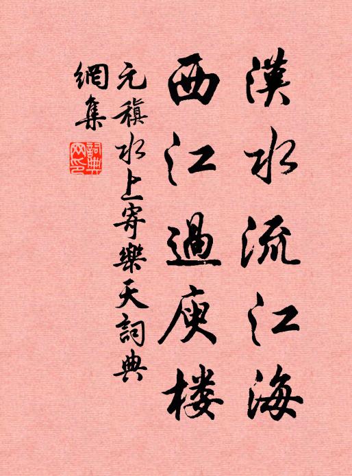 古詩文歷史字典書法欣賞書法字典國語詞典說文解字康熙字典古漢語字典漢水流江海,西江過庾樓元稹 《水上寄樂天》名句出處出自唐代元稹的《水上寄樂天》全文:眼前明月水,先入漢江流。漢水流江海,西江過庾樓。庾樓今夜月,君豈在樓頭。萬一樓頭望,還應望我愁。元稹詩詞大全名句書法欣賞漢水流江海,西江過庾樓書法作品元稹名句,水上寄樂天名句名句推薦臂鷹金殿側,挾彈玉輿旁李嶷《雜曲歌辭少年行三首》湖光千頃白,山色一螺明樓鑰《送陳表道倅岳陽》三字從來月正圓,一麾從此出秦關郭從周《贈何中立》不興短生思,奈此歲月何董嗣杲《感興》遙想易水燕山,有人方醉賞,六花如席王以寧《念奴嬌(淮上雪)》游盡西湖賞盡蓮,玉壺落日泊樓船楊萬里《大司成顏幾聖率同舍招游裴園,泛舟繞孤山賞》沈吟百年事,俛仰萬古情孫應時《子寶東歸以嚶其鳴矣求友聲為韻作古詩七章寬》欲哭難為淚,傷心到盡頭,孤魂當此渡,熱血已東流老舍《哭王禮錫先生》潮聲夜半千岩響,詩句明朝萬口傳蘇軾《孔長源輓詞二首》還家亦無事,隨處送悠悠陸游《野興》玉堂金闕非人世,亦有繁華具盡時孔武仲《碧蘆蓼花在天慶觀》絕粒身彌健,酬杯性轉和魏野《寄逸人陳孟》讀盡一編詩,胸懷消百結王之望《書白氏長慶集》堂堂人物傾曹劉,冰壺玉尺懸清秋蔡戡《送張安國舍人》銀漢會雙星趙可《望海潮 發高麗作》詩詞推薦雨中王安石〔宋代〕尚疑櫻欲吐,已怪菊成漂。紫莧凌風怯,青苔挾雨驕。長閒故有味,多難自無聊。牢落柴荊晚,生涯付一瓢。故絳行杜頠〔唐代〕君不見銅鞮觀,數里城池已蕪漫。君不見萀祁宮,幾重台榭亦微濛。介馬兵車全盛時,歌童舞女妖艷姿。一代繁華持律僧釋文珦〔宋代〕堅持先佛戒,不染世間緣。過午都忘食,終年只坐禪。可曾焚蠹木。長是濾蟲泉。何日能相見,同君話五篇。送幼輿子之官澧浦慈利監稅二首楊萬里〔宋代〕估人耕貨不耕田,也合供輸餉萬屯。若道厚征為報國,厚民卻是負君恩。再賦石翁石婆楊萬里〔宋代〕石翁誰怒猶睥目,石婆多愁鬢先禿。荒山野水四無人,二老對立今幾春。珠襦玉匣化為土,金鴈銀鳧亦飛去。知是天柱謝章〔宋代〕鶯花婉娩天,晴空落紅雨。千里賦遠遊,山水無重數。武夷天下甲,清絕多奇趣。名峰三十六,一一拱天柱。隔岸紹興祀大火十二首佚名〔宋代〕[黃鐘為角]有出相藏,伏見靡常。相我國家,鑒觀四方。視罔不正,終然允藏龍臥虎。神其來格,明德聲香。虞美人劉辰翁〔宋代〕鞓紅乾色無光霽。須是鮮鮮翠。然一點系裙腰。不著人間金屋、恐難銷。英英肯似焉支貴。漫脫紅霞帔。落時且勿金剛隨機無盡頌究竟無我分第十七釋印肅〔宋代〕溈山牛加字,鼻孔皆相似。牧人執杖看,免惹閒公事。和陶淵明飲酒詩滕岑〔宋代〕拿舟漾明月,把酒對青山。月影涵山扉,妙處端難言。回觴勸鷗鷺,吾與爾忘年。適意只自知,詎可他人傳。