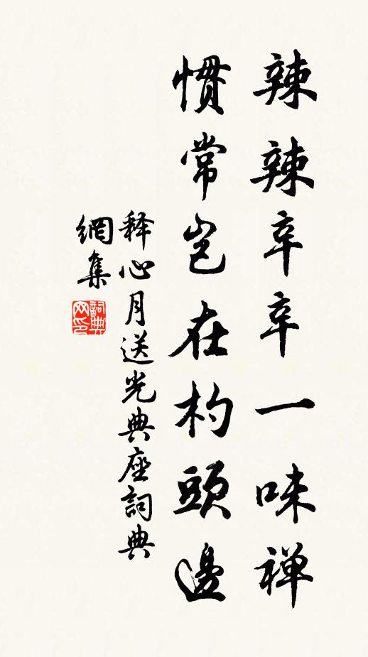 古詩文歷史字典書法欣賞書法字典國語詞典說文解字康熙字典古漢語字典辣辣辛辛一味禪,慣常豈在杓頭邊釋心月 《送光典座》名句出處出自宋代釋心月的《送光典座》全文:辣辣辛辛一味禪,慣常豈在杓頭邊。一千五百善知識,未出門時話已圓。釋心月詩詞大全名句書法欣賞辣辣辛辛一味禪,慣常豈在杓頭邊書法作品釋心月名句,送光典座名句名句推薦一道清風華轡遠,雙江綠水彩衣新文天祥《宴交代權贛州孫提刑致語口號》鐵肝迂叟秉剛腸,只有梅花可比方潘桂《比梅三絕》六橋多少景,盡在倚欄中顧逢《冠勝軒》蒼天默無言,復欲問古先胡宏《簡彪漢明》欲問耳極參透處,曉寒山靜數聲鍾程公許《借宿營錄隱翌旦曉粥後步游上竺》鳴泉亦感上皇意,流下隴頭嗚咽多黃滔《馬嵬二首》歲晚杉楓盡,人歸霧雨愁蘇軾《玉女洞》棄吾馬以取步,降吾車兮足兩履王令《山中詞》舶主辭番遠,棋僧入漢多許渾《送友人罷舉歸東海》何事客天涯李齊賢《巫山一段雲 平沙落雁》不從三峽過,免聽幾猿聲趙師秀《送潘景參赴利路帳乾》琴台延薰風,萬女曳阿錫胡珵《游秀峰寺》寐寤獨言時,畎畝心猶昨葉茵《槃磵》草樹非一香蕭衍《襄陽蹋蹄歌 二》都緣家賊難防備,撥亂乾坤見太平釋道顏《頌古二十首》詩詞推薦偶成曹彥約〔宋代〕此道元來即是心,人人拋卻來求深。不知求地翻成外,若是吾心底用尋。洗山晁說之〔宋代〕公事豈不猥,吾性自有適。驩言春風物,洗山出怪石。何幸此土壤,頑驁壓空碧。嶄岩有天姿,畚鍤不待力。橫如次韻前人壁閒詩陳著〔宋代〕萬宇腥埃風滿山,只饒二十里雲閒。要知人好境不好,最怕身閒心未閒。瑞鶴仙黃人傑〔宋代〕飛花閒院落。漸燕觜泥融,蜂須香薄。風光未全惡。有出林青杏,殿春紅藥。東皇舊約。把餘芳、一時留著。等君自巫山遵陸以避黑石諸灘,大雨不可行,泊驛范成大〔宋代〕巫山信是陽雲台,客行五日雲不開。陰晴何常有朝暮,夜雨少休明復來。今朝水長不知數,沒盡山根蒼石堆。東磯春光好曹勛〔宋代〕十年不見春光好,胡人馬齧長安草。長安草盡人已空,宮館園林跡如掃。東都西洛暗兵塵,晝引狐狸上黃道。長淮聚景園看荷花曹勛〔宋代〕四山收盡一天雲,水色天光冷照人。面面荷花供眼界,頓如身不在凡塵。探梅李洪〔宋代〕甌粵千山外,清愁只個般。澹煙增態度,飛霰斗高寒。鄭圃乘風馭,孤山傍水看。少陵詩興動,題品信知難。即事陳造〔宋代〕江漾晨光入縣門,樓斜晚影到漁村。海聲不為無風靜,山色居常帶霧昏。問俗即今防愒日,來時撫事錯銷魂。浮生和薛田察院詠雪三首魏野〔宋代〕密壓溪筠入戶斜,照開睡眼不須茶。誰言落處無偏黨,牽率詩家比酒家。
