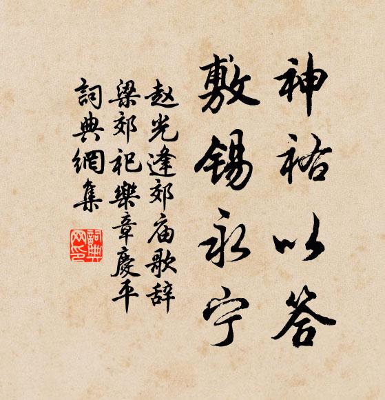 古詩文歷史字典書法欣賞書法字典國語詞典說文解字康熙字典古漢語字典神祐以答,敷錫永寧趙光逢 《郊廟歌辭。梁郊祀樂章。慶平》名句出處出自唐代趙光逢的《郊廟歌辭。梁郊祀樂章。慶平》全文:天命降鑒,帝德惟馨。享祀不忒,禮容孔明。奠璧布幣,薦純獻精。神祐以答,敷錫永寧。趙光逢詩詞大全名句書法欣賞神祐以答,敷錫永寧書法作品趙光逢名句,郊廟歌辭。梁郊祀樂章。慶平名句名句推薦動靜不乾消長事,從教門外雪寒多釋雲岫《偈頌二十三首》葉如青幄花成茵,細腰起舞來送春徐似道《蒲》眉黛暗傳春去恨,臉紅猶帶夜來妝華岳《呈王君庸》秖恐瑤池歸扈宴,不能修禊見深春許安世《游天章寺》火山今始見,突兀蒲昌東岑參《經火山》悲霜雪之俱下兮,聽潮水之相擊。屈原《九章》秋風寒,衣衫單邵定《繅車》江民旱累歲,流冗東就食張耒《十月七日晨起》太行王屋何由動,堪笑愚公不自量陸游《自嘲》五陵松柏兮,蕭蕭秋風岳珂《徽宗皇帝秋賦御書贊》豈如車上瓶,猶掛歸去路曹勛《仆持節朔庭自燕山向北部落以三分為率南人居》閒人相訪有何妨馬鈺《瑞鷓鴣 居庵》玩犀牛,呼小玉釋紹曇《偈頌一百零二首》山風索索鳴林籜,野水洄洄汎槮柴舒岳祥《次韻答胡山甫避地述懷時予有繩茅馬奧之意》定交首尾三十所,晏子狐裘虞老屐鞏豐《為舉子時所用方硯小童滌之誤傷其左角》詩詞推薦呈趙蹈中周南〔宋代〕趙子面白如玉傞,定須逃得文儒餓。經年憶破古人心,近日妹夫初病可。忽然到門已驚駭,令我失喜多兩拜。君來金鳳花張鎡〔宋代〕彩鳳連翩小作群,蕭條門巷獨留春。莫因繁冶生輕鄙,歲歲花開見主人。題李八百洞符載〔唐代〕太極之年混沌坼,此山亦是神仙宅。後世何人來飛升,紫陽真人李八百。訪韋丈叔能於嚴州西溪門外趙蕃〔宋代〕春王正月附人書,踵報祠官賦遂初。到處頻成詢所寓,忽能為說已謀居。蘇州舊日詩無敵,嚴瀨從來畫不如。東館每年家釀留一器以奉何元章今年持往者輒酸黃鄭剛中〔宋代〕吾廬吒窮巷,有酒無佳客。年年家釀香,延首定攀憶。分持遠相遺,豈問杯杓窄。所貴明月前,共此一尊色,去年綠陰亭鄧林〔宋代〕千山橫碧一溪清,白鳥飛邊落照明。吏散庭階無一事,綠陰亭上又詩成。題畫九首唐寅〔明代〕晃漾金銀帆殿開,蕭森杉柳隔紛埃。只容逋客騎驢到,不許朝官引騎來。龍州送裴秀才李洞〔唐代〕違拜旆旗前,松陰路半千。樓沖高雪會,驛閉亂雲眠。榜掛臨江省,名題赴宅筵。人求新蜀賦,應貴浣花箋。春行洪咨夔〔宋代〕百舌梢頭一半春,日長無處著閒心。推枰競欲投機早,結眊誰知用意深。梅子胚胎鹽裹味,桐花擺布蜜邊陰。東皋偈頌十七首釋師範〔宋代〕大地黑如漆,古今無訊息,達磨老臊胡,九年空面壁。