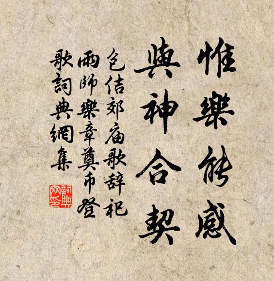 古詩文歷史字典書法欣賞書法字典國語詞典說文解字康熙字典古漢語字典惟樂能感,與神合契包佶 《郊廟歌辭。祀雨師樂章。奠幣登歌》名句出處出自唐代包佶的《郊廟歌辭。祀雨師樂章。奠幣登歌》全文:歲正朱明,禮布元制。惟樂能感,與神合契。陰霧離披,靈馭搖裔。膏澤之慶,期於稔歲。包佶詩詞大全名句書法欣賞惟樂能感,與神合契書法作品包佶名句,郊廟歌辭。祀雨師樂章。奠幣登歌名句名句推薦吾宗高義駕為迂,新詩爛粲慰槁枯陳造《陳學正惠詩酬以長句》悽惶受盡也趙長卿《瑞鶴仙(歸寧都,因成,寄時香諸院)》病骨支離釜粟豐,臥看暾采照牆東宋祁《官舍二首》學舍蕭條官職冷,不知誰與戴姚黃張耒《寄陳州朱教授三首》月在沃洲山上,人歸剡縣溪邊朱放《剡山夜月(一題剡溪舟行)》攙叉鋒刃簇,縷絡釣絲縈牛僧孺《李蘇州遺太湖石奇狀絕倫因題二十韻奉呈夢得、樂天》彩袖殷勤來祝壽郭應祥《減字木蘭花》復此風中琴謝朓《郡內高齋閒望答呂法曹詩》極目吳天征棹遠,渡頭斜日落楓丹釋行海《送壽芳恭三友歸安吉》景物固爾佳,何暇同清談董嗣杲《過琴齋》豈無佳菊,采不盈把仇遠《野飲》隴首雲飛,江邊日晚,煙波滿目憑闌久柳永《曲玉管·隴首雲飛》蠹損歌紈人去久,漫淚沾、香蘭如笑吳文英《珍珠簾(春日客龜溪,過貴人家,隔牆聞簫鼓聲,疑是按舞,佇立久之)》錦軸一編變府稿,雪衾萬桿剡溪藤陳紀《謝謝疊山惠杜詩紙被》無端卻似堂前燕,飛入尋常百姓家賀鑄《第一花/鷓鴣天》詩詞推薦和宋憲乙丑元夕韻何澹〔宋代〕三神山中隔凡塵,簫鼓喧闐午夜聲。十里綺羅開翠幕,一天星斗不層城。也知故國風光麗,尤喜新元谷價平。衰朽題蘭陵王碑陰賀鑄〔宋代〕齊室生武賢,蘭陵乃頗牧。析瓜饗虎士,饜飫比粱肉。金墉免胄戰,破陣何神速。樂府有遺聲,當歌凱旋曲。盤宗內人斜二首張嵲〔宋代〕山色依依水自流,內人斜畔最堪愁。荒榛蔓草縈寒骨,更有何人吊杜秋。長安夜坐寄懷湖外嵇處士鄭谷〔唐代〕萬里念江海,浩然天地秋。風高群木落,夜久數星流。鍾絕分宮漏,螢微隔御溝。遙思洞庭上,葦露滴漁舟。聽蛙方君作八老詩效顰各賦一首內三題餘四十劉克莊〔宋代〕少諳刀筆晚尤工,舊貫新條問略通。鬥智固應維鶩輩,論年亦合作狙公。孫魁明有堪瞞處,包老嚴猶在套中。只恐頌十玄談回機釋印肅〔宋代〕陌路相逢沒定期,蛇婆來命怪誰知。四十八人成鱉鼻,急喚頑禪草裹歸。詠華林書院楊億〔宋代〕聞說華林院,名將闕里偕。生徒似東魯,書籍勝西齋。俎豆儒風盛,塤箎樂韻諧。門閭雙桂茂,編秩九流排。講學漁家傲梵琦〔元代〕聽說西方無量樂。凡夫淺智難圖度。隨有願度無不獲。何勞縈。珠衣綺饌黃金宅。地似掌平尤廣博。八功德水非穿金剛隨機無盡頌法界通花分第十九釋印肅〔宋代〕田歌答郢歌,露柱中心和。田郢本自無,露柱是什麼。石研詩杜甫〔唐代〕平公今詩伯,秀髮吾所羨。奉使三峽中,長嘯得石研。巨璞禹鑿餘,異狀君獨見。其滑乃波濤,其光或雷電。聯坳