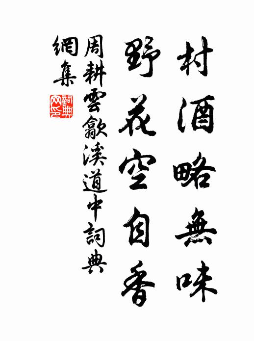 古詩文歷史字典書法欣賞書法字典國語詞典說文解字康熙字典古漢語字典村酒略無味,野花空自香周耕雲 《歙溪道中》名句出處出自宋代周耕雲的《歙溪道中》全文:行行欲少歇,爭奈客途長。村酒略無味,野花空自香。幾家茅屋小,數畝麥田荒。何處堪投宿,林梢已夕陽。周耕雲詩詞大全名句書法欣賞村酒略無味,野花空自香書法作品周耕雲名句,歙溪道中名句名句推薦仄月高寒水石鄉辛棄疾《定風波(再和前韻藥名)》村巷無來客,清羸只自知陸游《初夏》暮投彭澤宿荒草,神驚魄顫何能眠孔武仲《泊趙屯》寂寞焚香後,閒階細草生張喬《題玄哲禪師影堂》船頭獵獵兩旗翻,六月江風灑面寒鄭獬《送曹比部赴袁州》束簡下延閣,買符驅短轅劉禹錫《發華州留別張侍御》今年誰料勝常年,入絹得鹽償本錢郭印《和詩守豐年行》誰言場似樗似蒲,好手居然不解輸王邁《賀工思表兄西上》處困不忙仍不怨,醉來唯是欲傞傞韓偓《雪中過重湖信筆偶題》孤衾不成寐,起坐聽雞號張耒《冬至三首》穉牛先跳逸,兩牛追不及王灼《題游昭畫牛四圖》祖母唯汝愛,無異所生乳李覯《名男曰參魯以時喻之》一語離窠窟,千生出蓋才釋道行《頌古五首》舟車無由徑,岩嶠乃屬天閻防《晚秋石門禮拜(一作禮佛)》開帆直千里,快去曾非漸蔡襄《龜山夜泊書事》詩詞推薦題錢清江喻良能〔宋代〕不受百錢饋,從茲號錢清。至今千載後,猶得仰佳名。贊痴絕和尚釋心月〔宋代〕破蟄之雷,指南之龜。斫圓玉斧,刮膜金篦。噫,非師而誰。同沉右率諸公賦鼓吹曲名 芳樹謝朓〔南北朝〕早翫華池陰。復影滄洲枻椅柅芳若斯。葳蕤紛可結。霜下桂枝銷。怨與飛蓬折。不廁玉盤滋。誰憐終委絕。自普照游二庵蘇軾〔宋代〕長松吟風晚雨細,東庵半掩西庵閉。山行盡日不逢人,浥浥野梅香入袂。居僧笑我戀清景,自厭山深出無計。我雖艷歌佚名〔兩漢〕今日樂上樂,相從步雲衢。天公出美酒,河伯出鯉魚。青龍前鋪席, * 持榼壺。南斗工鼓瑟,北斗吹笙竽。妲娥與道源游西莊遇齊道人同往草堂為齊書此此蘇軾〔宋代〕桑麻已零落,藻荇復銷沉。園宅在人境,歲時傷我心。強穿南埭路,遙望北山岑。欲與道人語,跨鞍聊一尋。大酺 [永昌元年]杜審言〔唐代〕聖后乘乾日,皇明御歷辰。紫宮初啟坐,蒼璧正臨春。雷雨垂膏澤,金錢贈下人。詔酺歡賞遍,交泰睹惟新。方竹杖范成大〔宋代〕竹君面個個團團,此士剛方獨凜然。外貌中心俱壁立,任從痴子削教圓。游浯溪王壺〔宋代〕□□□□□□□,□值淒涼八百秋。入院伽藍先稽首,題詩神鬼暗添愁。幾章鐫石珠璣燦,一帶臨江泉石幽。讀罷題淮陰祠張栻〔宋代〕秦關昔先驅,南鄭豈淹久。夜中丞相歸,平明印垂肘。古來豪傑人,調度出窠臼。登壇一軍驚,六合已在手。從茲