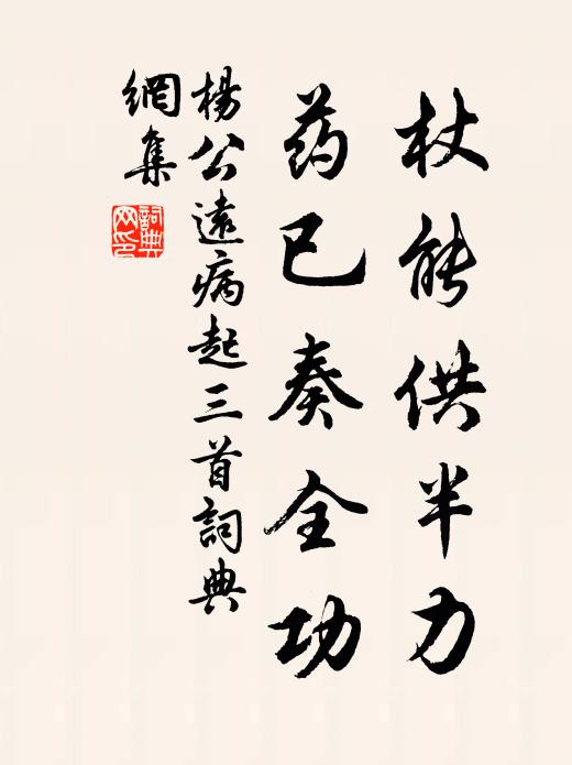 古詩文歷史字典書法欣賞書法字典國語詞典說文解字康熙字典古漢語字典杖能供半力,藥已奏全功楊公遠 《病起三首》名句出處出自宋代楊公遠的《病起三首》全文:病起覺痴聾,徐行腳躡空。杖能供半力,藥已奏全功。整頓身仍健,優遊道未窮。呼兒滌泓穎,拂素貌漁翁。楊公遠詩詞大全名句書法欣賞杖能供半力,藥已奏全功書法作品楊公遠名句,病起三首名句名句推薦相逢添得人留戀張先《蝶戀花(林鐘商)》有時日向晚,灣處閒徙倚張鎡《看澗水自警》寸寸離腸須會取李之儀《蝶戀花(席上代人送客,因載其語)》皇受命而熙洽兮,實千祀而一時秦觀《曾子固哀詞》中庭井闌上,一架獼猴桃岑參《太白東溪張老舍即事,寄舍弟侄等》松源正脈將枯竭,浚發靈源復是誰釋智愚《寄崇福源長老》和玉悲無已,長沙宦不成張說《岳州別姚司馬紹之制許歸侍》不腆酒朵,用伸悃愊佚名《紹興以後祀五方帝六十首》歌闋瓊筵,暗失金貂侶晁補之《惜奴嬌》肯隨俗好惡,議論輕自決王安石《送孫叔康赴御史府》簾卷山流翠,郊虛草自香張玉孃《詠夏雨》臥看孤鶴駕天風陳與義《浣溪沙》而況交柯紫荊樹,東枝憔悴西枝榮高斯得《讀梅福傳有感》花底深朱戶賀鑄《人南渡·蘭芷滿汀洲》赤日紅塵,前日中條路王惲《點絳唇 題絳州花萼堂時大暑回自河中》詩詞推薦戀繡衾趙時奚〔宋代〕江南煙水幾萬重。記玉人、花底舊容。待欲寄、飛鴻信,望前山、夕照冷紅。塞笳月下聲淒楚,怨百花、春事夢空懷舊第一百七文天祥〔宋代〕故園花自發,無復故人來。亂離朋友盡,幽佩為誰哀。貧病丘葵〔宋代〕貧似山僧瘦似猿,病軀只合老山村。空床{左臬右兀}{左兀右危}無氈臥,破褐襤縿有虱捫。作甫里翁垂釣艇,郊行陸游〔宋代〕小雨東郊氣象新,蕭蕭清吹爽衣巾。並溪密竹巧藏寺,爽道新麻高沒人。老厭簿書愁欲睡,病疏杯酌渴生塵。桐君故武衛將軍輓歌三首杜甫〔唐代〕嚴警當寒夜,前軍落大星。壯夫思感決,哀詔惜精靈。王者今無戰,書生已勒銘。封侯意疏闊,編簡為誰青。舞劍和公儀送白鷼於永叔王珪〔唐代〕清風樓古琴三尺,玉蕊花飛酒幾缸。月窟憐君霜兔獨,金莖誇我露禽雙。白鷼浴雪來春檻,古麗涵星關曉窗。悵望寄清曠鄧隱夫艾性夫〔宋代〕去年菊里辱經過,秋思蕭蕭又草坡。兵火東南關氣數,交遊湖海隔風波。書緣辟亂經年少,詩想憂時近日多。倘有和林治中雪詩五首鄭清之〔宋代〕鹽虎模糊懵豹貔,玉峰高並自多奇。春先北菀供花事,夜入西淮奏雅詩。銀闕勢增開雉尾,賀班香近列蛾眉。看君稽古堂詩為曹應祥題馮時行〔宋代〕稽古堂前雨半天,蒙蒙山色思依然。幾多心事催霜鬢,零落梅花又一年。春燕劉兼〔唐代〕多時窗外語呢喃,只要佳人卷繡簾。大廈已成須慶賀,高門頻入莫憎嫌。花間舞蝶和香趁,江畔春泥帶雨銜。棲息