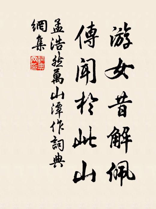 古詩文歷史字典書法欣賞書法字典國語詞典說文解字康熙字典古漢語字典游女昔解佩,傳聞於此山孟浩然 《萬山潭作》名句出處出自唐朝孟浩然的《萬山潭作》原文賞析:垂釣坐盤石,水清心亦閒。魚行潭樹下,猿掛島藤間。游女昔解佩,傳聞於此山。求之不可得,沿月棹歌還。孟浩然詩詞大全名句書法欣賞游女昔解佩,傳聞於此山書法作品孟浩然名句,萬山潭作名句名句推薦玉漏銀壺且莫催,鐵關金鎖徹明開。崔液《上元夜六首·其一》君子之事親孝,故忠可移於君。孔子及其弟子《孝經·廣揚名》細數十年事,十處過中秋。范成大《水調歌頭·細數十年事》執古之道,以御今之有。老子《老子·道經·第十四章》母欺子,子而不信其母,非以成教也。韓非及後人《韓非子·外儲說左上》袨服華妝著處逢,六街燈火鬧兒童。元好問《京都元夕》何因不歸去?淮上有秋山。韋應物《淮上喜會梁川故人 / 淮上喜會梁州故人》拆桐花爛熳,乍疏雨、洗清明。柳永《木蘭花慢·拆桐花爛熳》苕之華,其葉青青。佚名《苕之華》丈夫不能再辱。班固《漢書·傳·李廣蘇建傳》菡萏香連十頃陂,小姑貪戲採蓮遲。皇甫松《採蓮子·菡萏香蓮十頃陂》垂楊低映木蘭舟。半篙春水滑,一段夕陽愁。晁補之《臨江仙·綠暗汀洲三月暮》八月長江萬里晴,千帆一道帶風輕。崔季卿《晴江秋望》雁過孤峰曉,猿啼一樹霜。賈島《送天台僧》一身報國有萬死,雙鬢向人無再青。陸游《夜泊水村》詩詞推薦詠拋毬項安世〔宋代〕彩旗丹柱倚春風,寒日清明罷繡工。千仞驪珠翻錦帶,五紋蛛網麗晴空。百年日月跳丸里,一擲功名唾手中。漠北山中五詠春早皇甫冉〔唐代〕草遍潁陽山,花開武陵水。春色既已同,人心亦相似。句徐似道〔宋代〕葉從秋後變,色向曉來紅。雪中遇直竇群〔唐代〕寒光凝雪彩,限直居粉闈。恍疑白雲上,乍覺金印非。樹色靄虛空,琴聲諧素徽。明晨阻通籍,獨臥掛朝衣。題靈徹上人舊房張祜〔唐代〕寂寞空門支道林,滿堂詩板舊知音。秋風吹葉古廊下,一半繩床燈影深。雜詠一百首尹伯奇劉克莊〔宋代〕不愁兒足凍,第恐母心傷。所以子范子,惟彈一履霜。十二月二十九夜大雪三首楊公遠〔宋代〕六出霏霏餞歲華,終宵撩亂撲窗紗。未言造化工夫巧,且看乾坤景角奢。□□□□□□□,□□□□□□□藥。明游景空寺蘭若孟浩然〔唐代〕龍象經行處,山腰度石關。屢迷青嶂合,時愛綠蘿閒。宴息花林下,高談竹嶼間。寥寥隔麈事,疑是入雞山。送周介之學士通判定州梅堯臣〔宋代〕相公秉文武,視卒如嬰兒。今往佐其軍,豈不重撫綏。我有愚者慮,贈君臨路岐。相公居并州,拓土曾不疑。羌戎爇心香 贈扶風縣楊公馬公馬鈺〔元代〕但願人人,識破浮生。速抽身、猛棄塵情。休妻別子,絕利忘名。便洒然惺,豁然悟,頓然明。虎嘯龍吟,氣爽神
