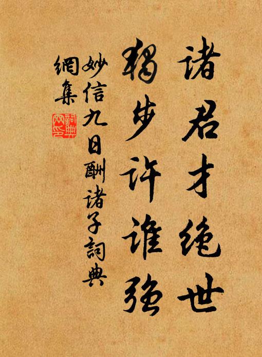 古詩文歷史字典書法欣賞書法字典國語詞典說文解字康熙字典古漢語字典諸君才絕世,獨步許誰強妙信 《九日酬諸子》名句出處出自清朝妙信的《九日酬諸子》原文賞析:不負東籬約,攜尊過草堂。遠天連樹杪,高月薄衣裳。握手經年別,驚心九日霜。諸君才絕世,獨步許誰強。名句書法欣賞諸君才絕世,獨步許誰強書法作品妙信名句,九日酬諸子名句名句推薦野水參差落漲痕,疏林欹倒出霜根。蘇軾《書李世南所畫秋景二首》坐上別愁君未見,歸來欲斷無腸。蘇軾《臨江仙·送王緘》忽見陌頭楊柳色,悔教夫婿覓封侯。王昌齡《閨怨》不仁而富,謂之不幸。牆隙而高,其崩必疾也。范曄《後漢書·列傳·方術列傳上》茅檐低小,溪上青青草。辛棄疾《清平樂·村居》芭蕉不展丁香結, 同向春風各自愁。李商隱《代贈二首》克城以武,戡亂以仁。張廷玉《明史·本紀·卷一》白髮悲明鏡,青春換敝裘。岑參《武威春暮聞宇文判官西使還已到晉昌》跨馬出郊時極目,不堪人事日蕭條杜甫《野望》葉落根偏固,心虛節更高。憨山德清《詠竹五首》火冷燈稀霜露下,昏昏雪意雲垂野。蘇軾《蝶戀花·密州上元》試上超然台上看,半壕春水一城花。蘇軾《望江南·超然台作》數枝門柳低衣桁,一片山花落筆床。岑參《山房春事二首》二月賣新絲,五月糶新谷。聶夷中《詠田家 / 傷田家》又到斷腸回首處,淚偷零。納蘭性德《山花子·風絮飄殘已化萍》詩詞推薦殘花崔塗〔唐代〕遲遲傍曉陰,昨夜色猶深。畢竟終須落,堪悲古與今。明年何處見,盡日此時心。蜂蝶無情極,殘香更不尋。一念陳起〔宋代〕一念無塵雜,三更有夢回。同他石橋老,過水探寒梅。和汪正夫梅鄭獬〔宋代〕劉蕡直氣壓群才,卻束塵衣取次來。開府剛腸破金石,可能刻意賦寒梅。集英殿立侍觀進士唱名六首張鎡〔宋代〕先世親題雁塔名,宦途漂泊最關情。難將此語逢人舉,歸問寒齋舊短檠。題興善寺後池盧綸〔唐代〕隔窗棲白鶴,似與鏡湖鄰。月照何年樹,花逢幾遍人。岸莎青有路,苔徑綠無塵。永願容依止,僧中老此身。挽宋岩老參議陳傅良〔宋代〕少小修藏近市朝,亦非著意混漁樵。不為禦寇猶爭席,好說淵明更折腰。一飯重違凡子約,千金終卻故人招。送車水調歌頭鍾將之〔宋代〕更似南津港,再遇呂公船。禁中春松周存〔唐代〕幾歲含貞節,青青紫禁中。日華留偃蓋,雉尾轉春風。不為繁霜改,那將眾木同。千條攢翠色,百尺澹晴空。影密和劉舍人詠雪李曾伯〔宋代〕怪見漫空萬蝶狂,須臾 * 眩昏黃。風姨知費幾番信,天女才施半面妝。筆底詩徒和冰柱,酒邊舞已失霓裳。梁園騏驥在霜野王安石〔宋代〕騏驥在霜野,低徊向衰草。人櫪聞秋風,悲鳴思長道。黃金作鞭轡,粲粲空外好。人生貴得意,不必恨枯槁。