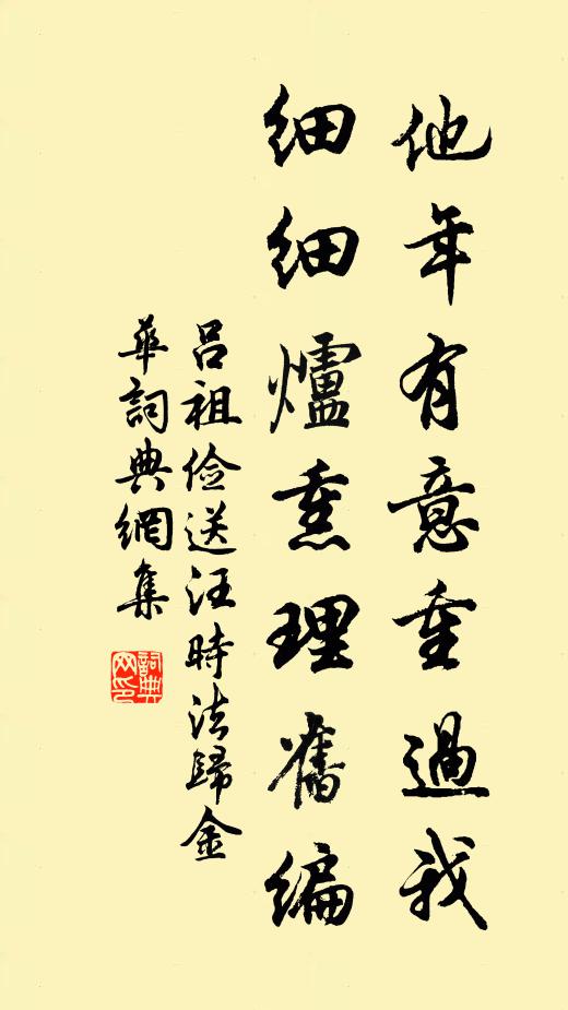 古詩文歷史字典書法欣賞書法字典國語詞典說文解字康熙字典古漢語字典他年有意重過我,細細爐熏理舊編呂祖儉 《送汪時法歸金華》名句出處出自宋代呂祖儉的《送汪時法歸金華》全文:攜手山橋第一軒,誰能結我夢中緣。他年有意重過我,細細爐熏理舊編。呂祖儉詩詞大全名句書法欣賞他年有意重過我,細細爐熏理舊編書法作品呂祖儉名句,送汪時法歸金華名句名句推薦又作三年一夢回,浮云何地是根栽王洋《送法榮師歸吳興榮自清江退院而歸》避風歸去,貯金屋、妝成漢嬌張炎《慶 * (金粟洞天)》晴浦溶溶明斷霞蔣捷《小重山》蓋頭即可居,容膝即可安樂雷發《壺中天歌贈侯明父》陳室可曾掃,陶琴不要弦白居易《新昌新居書事四十韻因寄元郎中張博士》龍文虎脊君當取,有才不用當誰哉汪莘《訪吳安撫竹洲》檐前花覆地,竹外鳥窺人祖詠《清明宴司勛劉郎中別業》主盟君勿讓,賈勇我何堪陸游《寄題季長飾庵》一身生死吒造華,瑣瑣誰能污牙頰鄭剛中《廣南食檳榔先嚼蜆灰蔞藤津遇灰藤則濁吐出一》作霈待時舉,妙化通天心陳洵直《九鎖步虛詞第六龍吟鎖》風標常憶清如鶴,書札頻通細若蠅周必大《華文閣學士沈持要輓詞》翠華寂寞嬋娟沒,野筱空餘紅淚情劉言史《瀟湘游》秋深來舊京,一嘗造君廬釋文珦《寄教西岑》鄉賦鹿鳴篇,君為貢士先耿湋《送郭秀才赴舉》真鉤追古道,方鑿背時風曾豐《久與廣西帥年丈左史張舍人別自瓊罷歸過靜江》詩詞推薦中秋趙希桐〔宋代〕白露溥空萬葉飛,生香深在桂花枝。一千里月正圓夜,九十日秋才半時。湓浦風流元亮興,鄜州牢落少陵詩。不妨謁金門黃機〔宋代〕愁萬疊。春在雨條菸葉。翠袖倚風寒霎霎。傍闌看乳鴨。何處一聲啼鴂。架上荼欲雪。繡被薰香香未歇。可憐音信出古田道中陳宓〔宋代〕盡歷崎嶇到古田,平生未識此攀緣。白雲 * 青嵐見,知有山圍峻屬天。集賢書院成,送張說上集賢學士,賜宴得珍字李隆基〔唐代〕廣學開書院,崇儒引席珍。集賢招袞職,論道命台臣。禮樂沿今古,文章革舊新。獻酬尊俎列,賓主位班陳。節變艾人六言二首劉克莊〔宋代〕欹枕三彭暫去,燒船五鬼俱還。我欲膝行倒屣,君無髮上沖冠。雜興張鎡〔宋代〕細讀南山扣角歌,機鋒投處幾曾多。道人不踏門前路,敝帚其如自愛何。踏莎行 春雨連日吳存〔元代〕夜溜瓶懸,朝陰墨鎖。一年桃李糊塗過。欲留晴賞待清明,晴時只恐清明蹉。倚杖孤吟,焚香默坐。春衫莫把春泥李處士故居王建〔唐代〕露濃煙重草萋萋,樹映闌乾柳拂堤。一院落花無客醉,半窗殘月有鶯啼。芳筵想像情難盡,故榭荒涼路欲迷。風景癸酉臘雪孔武仲〔宋代〕又見同雲合,朝來雪滿天。寒生梁苑席,興在越溪船。不復風鳴屋,應須澤到泉。農家相慶喜,處處畝鍾田。浪淘沙白居易〔唐代〕隨波逐浪到天涯,遷客西還有幾家。卻到帝都重富貴,請君莫忘浪淘沙。