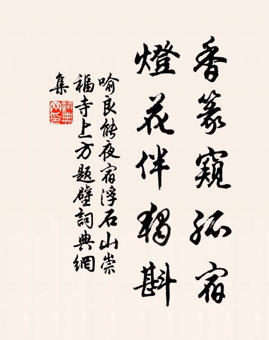 古詩文歷史字典書法欣賞書法字典國語詞典說文解字康熙字典古漢語字典香篆窺孤宿,燈花伴獨斟喻良能 《夜宿浮石山崇福寺上方題壁》名句出處出自宋代喻良能的《夜宿浮石山崇福寺上方題壁》全文:窈窕尋支徑,縈紆度密林。岸回溪更駛,峰轉塢逾深。僧梵雲邊寺,鍾魚竹里音。解鞍生妙興,倚檻淨煩襟。永夜涼飆動,初秋爽氣侵。岩空寒溜滴,壁靜候蟲吟。香篆窺孤宿,燈花伴獨斟。不諳塵外趣,誰識此時心。名句書法欣賞香篆窺孤宿,燈花伴獨斟書法作品喻良能名句,夜宿浮石山崇福寺上方題壁名句名句推薦唐朝漢闕,楚苑秦宮興替王吉昌《雙雙燕》壇畔歸雲冷濕襟,拂苔移石坐花陰李中《廬山棲隱洞譚先生院留題》若問堂中事,堂中事轉疏釋道印《頌古八首》客來稍覺罍空恥,事去方知甕算差劉克莊《小園即事五首》上有特棲鳥王粲《雜詩》住近蘇門有白雲,閉關卻掃道逾尊晁補之《和胡戢七首》小桃著子可憐渠,疏處全疏無處無楊萬里《小桃》且來掛壁暫不用,夜夜鳴嘯聲疑鴞秋瑾《紅毛刀歌》幽興無邊未遽窮,泉聲隨屐下寒空劉子翬《游密庵三首》千年茅竹蔽幽奇,一日堂成四海知陳師道《拱翠亭》市門有女捧巾盥,衣裓無化生穢垢何耕《普通山距府東十數里青州禪師洪果道場也自龍》春雲濛濛雨淒淒,春秧欲老翠剡齊蘇軾《秧馬歌(並引)》勇哉典午君,覆觴無再期張栻《止酒》十個月,養個小金壇蔡伸《小重山》披衣起、閒愁萬斛史浩《杏花天》詩詞推薦自遣李頻〔唐代〕永擬東歸把釣絲,將行忽起半心疑。青雲道是不平地,還有平人上得時。淳化鄉飲酒三十三章佚名〔宋代〕關雎于飛,洲渚之湄。自家刑國,樂且有認。池蓮郭印〔宋代〕擢乾洿池中,天姿本清淨。白白與紅紅,邂逅識真性。魯城民歌佚名〔唐代〕魯地抑種稻,一概被水沫。年年索蟹夫,百姓不可活。洛中張籍新居王建〔唐代〕最是城中閒靜處,更回門向寺前開。雲山且喜重重見,親故應須得得來。借倩學生排藥合,留連處士乞松栽。自君偈頌一百零二首釋紹曇〔宋代〕肥馬碌碌,瘦馬碌碌。醫得眼前瘡,剜卻心頭肉。朝不足,莫不足,六六依然三十六。雲門見睦州,良遂參 * 。引伴宣事惠詩六首過有褒稱且及其叔子文之舊晁說之〔宋代〕白髮蕭條到海濱,秋風邂逅故園人。三千紅錦巧為帳,百萬黃金肯買鄰。漢節陸離驚遠俗,商歌窈窕會相親。男兒袞山道中范成大〔宋代〕虎嘯狐鳴苦竹叢,魂驚終日走蒙茸。松林斷處前山缺,又見南湖數十峰。偶居李冶〔唐代〕心遠浮雲知不還,心雲並在有無間。狂風何事相搖盪,吹向南山復北山。憶故山方乾〔唐代〕舊山長繫念,終日臥邊亭。道路知已遠,夢魂空再經。秋泉涼好引,乳鶴靜宜聽。獨上高樓望,蓬身且未寧。