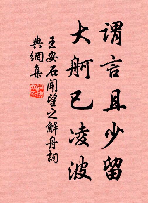 古詩文歷史字典書法欣賞書法字典國語詞典說文解字康熙字典古漢語字典謂言且少留,大舸已凌波王安石 《聞望之解舟》名句出處出自宋代王安石的《聞望之解舟》全文:子來我樂只,子去悲如何。謂言且少留,大舸已凌波。闇黮雖莫測,皇明邁羲娥。修門歸有時,京水非汨羅。王安石詩詞大全名句書法欣賞謂言且少留,大舸已凌波書法作品王安石名句,聞望之解舟名句名句推薦今年春風塵土黃,遠赴三州議繇役蘇轍《贈提刑賈司門青》得米還憂無束薪,今年真欲甑生塵陸游《貧病戲書》詛楚楚如桀,詛秦秦則紂蘇轍《和子瞻鳳翔八觀八首其二詛楚文》如論惜短命,何得滿長祇義淨《余以鹹亨元年在西京尋聽於時與並部處一法師…聊題兩絕》種花縱好誰同賞,置酒良難自慣貧方回《十一月二十日南至二首》覺來幽恨,停觴不御,欲歌還止辛棄疾《水龍吟·老來曾識淵明》袞出一輪明月譚處端《如夢令》不假牽絲,何勞刻木劉仁父《踏莎行(贈傀儡人劉師父)》世遠言猶在,身危道豈窮陸游《病中作》八月九日正長夜,千聲萬聲無了時白居易《聞夜砧》百謫勿相聞,從渠面我殿傅察《次七兄韻》綠雲冉冉撥不開,樂地可中能許大釋道璨《和余山南僉判清溪觀荷》歸來卻見半隱翁,月台如在神仙中王炎《呂待制所居八詠月台》猶期立腳群賢上,更請回頭萬物初曾豐《題李師儒上舍稽古堂》吾非嵇康徒,道遠未能涉魏了翁《績和李參政湖上雜詠》詩詞推薦擬寒山拾得二十首王安石〔宋代〕打賊賊恐怖,看客客喜歡。亦有客是賊,切莫受伊謾。樂哉貧兒家,無事役心肝。既無賊可打,豈有客須看。海陵寒食晁說之〔宋代〕忽逢群盜到江津,驚若奔魚跳此身。煙焰幾為新節鬼,風塵敢憶故鄉人。幾家有物蒸嘗在,到處無時哭泣頻。日日子瞻與李公麟宣德共畫翠石古木老僧謂之憩寂蘇轍〔宋代〕東坡自作蒼蒼石,留趣松待伯時。只有兩人嫌未足,更收前世杜陵詩。解剡孝嘉道中答溪民群來遮轎問新知縣如何二陳著〔宋代〕新知縣是舊官員,說與田家汝有緣。安穩過冬耘二麥,明年才勝似今年。【雙調】新水令_武陵春當年康進之〔元代〕武陵春當年曾避虎狼秦,是仙家幻來風韻。景因人得譽,人為景摹真。佳趣平分,人景共評論。【駐馬聽】花片紛元宵懷都城簡胡令俊民時胡連夕在告朱翌〔宋代〕天豁晴光合,檐收雪汗乾。燈期欣在候,火令不為難。方喜春風動,猶憐暮色寒。仙晨今夜樂,帝所舊年觀。鬱郁嘉運徐夤〔唐代〕嘉運良時兩阻修,釣竿蓑笠樂林丘。家無寸帛渾閒事,身似浮雲且自由。庭際鳥啼花旋落,潭心月在水空流。晨炊從駕天池應詔詩薛道衡〔隋代〕上聖家寰字。威略振邊陲。八維窮眺覽。千里曳旌旗。駕黿臨碧海。控驥踐瑤池。曲浦騰煙霧。深浪駭鯨螭。杏洪咨夔〔宋代〕萬山築底作春妍,一樹繁紅直幾錢。深院日長來燕後,平池水暖浴鵝天。弦歌禮樂詩書地,榜帖功名富貴天。兒輩九月十日同尤延之觀淨慈新殿楊萬里〔宋代〕昨雨敗重九,謂並敗此行。雲師出小譎,垂曉偷放晴。初愁落君後,我反先出城。佇立已小倦,喜聞馬來聲。南山
