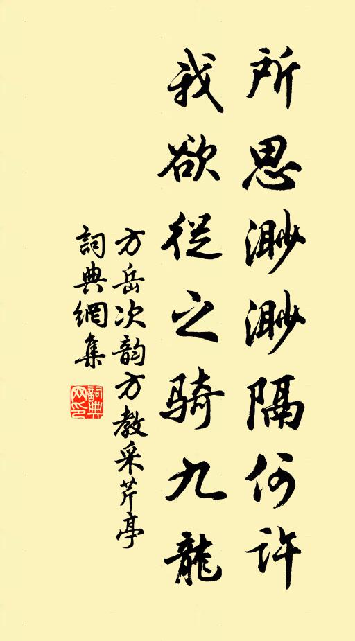 古詩文歷史字典書法欣賞書法字典國語詞典說文解字康熙字典古漢語字典所思渺渺隔何許,我欲從之騎九龍方岳 《次韻方教采芹亭》名句出處出自宋代方岳的《次韻方教采芹亭》全文:竹外清溪溪外峰,誰搴薜荔采芙蓉。所思渺渺隔何許,我欲從之騎九龍。方岳詩詞大全名句書法欣賞所思渺渺隔何許,我欲從之騎九龍書法作品方岳名句,次韻方教采芹亭名句名句推薦報導摩訶般若力,是境是心全不識釋印肅《頌證道歌證道歌》孝先風味也堪憐,肯為周公晝日眠蘇軾《李行中秀才醉眠亭三首》德配有虞,紹唐授禹佚名《郊廟朝會歌辭紹熙元年恭上壽星聖皇太后至尊》架上亂書兒自整,床頭濁酒婦能謀洪咨夔《又和》與其鞭撲朘民髓,熟若簞瓢樂此身王柏《次前人韻》我公仁存心,樂山心如丹樓鑰《趙資政當山堂》胸中鵬背三千里,膜外羊腸百八盤洪咨夔《又敬和寓舍》圭璋藏道室,弓劍莽幽宮施樞《禹廟》畫餅豐年賒一醉,臘前三白詎應休虞儔《和耘老弟喜雪》遇坎即乘流,西南到火洲沈佺期《從驩州廨宅移住山間水亭贈蘇使君》江水奔騰無晝夜,石田耕穫漫春秋郭印《憲司後園葺舊亭榜以明秀元少監有詩次韻》白社已應無故老,清江依舊繞空城鄭谷《渚宮亂後作》對暮山橫翠,衫殘葉飄黃柳永《臨江仙引·渡口》詩人古亦少達者,非特徐子如寒灰強至《贈徐君強》一語離窠窟,千生出蓋才釋道行《頌古五首》詩詞推薦遣興次前韻陳造〔宋代〕斫水蘄斷流,捻鹽寧療渴。區區守荒學,籠鳥眩樊遏。向來麋鹿姿,只可樵牧活。始其事誦數,魄似窮鬼奪。文字江神子·癸亥陳和叔會於賞心亭張舜民〔宋代〕七朝文物舊江山。水如天。莫憑闌。千古斜陽,無處問長安。更隔秦淮聞舊曲,秋已半,夜將闌。爭教潘鬢不生斑沖佑觀張紹〔唐代〕大始未形,混沌無際。上下開運,乾坤定位。日月麗天,山川鎮地。萬匯猶屯,三才始備。肇有神化,初生蒸民。聽彈歸去來辭潘璵〔宋代〕淵明昔賦歸去辭,後世寄聲焦桐絲。先生彈罷和者誰,春山花落啼子規。水調歌頭劉志淵〔元代〕人道無生趣,日就月相和。高奔用顯鳥飛,離外宿靈柯。秀孕蕊珠嘉瑞,光射銀蟾皎潔,顯現月中娥。相會瑤池宴除夜長安客舍歐陽詹〔唐代〕十上書仍寢,如流歲又遷。望家思獻壽,算甲恨長年。虛牖傳寒柝,孤燈照絕編。誰應問窮轍,泣盡更潸然。晚晴獨酌二首楊萬里〔宋代〕冷落杯盤下箸稀,今年淮白較來遲。異鄉黃雀真無價,稍暖瓊酥不得時。時敘火後,意不釋然,作詩解之范成大〔宋代〕潘郎曉衾夢蘧蘧,舞馬竟與融風俱。前驅炎官後熱屬,席捲不貸淵明廬。君家十年四立壁,震風凌雨啼妻孥。平生賦得還山吟,送沈四山人高適〔唐代〕還山吟,天高日暮寒山深,送君還山識君心。人生老大須恣意,看君解作一生事,山間偃仰無不至。石泉淙淙若風七交七首梅主簿歐陽修〔宋代〕聖俞翹楚才,乃是東南秀。玉山高岑岑,映我覺形陋。離騷喻草香,詩人識鳥獸。城中爭擁鼻,欲學不能就。平日