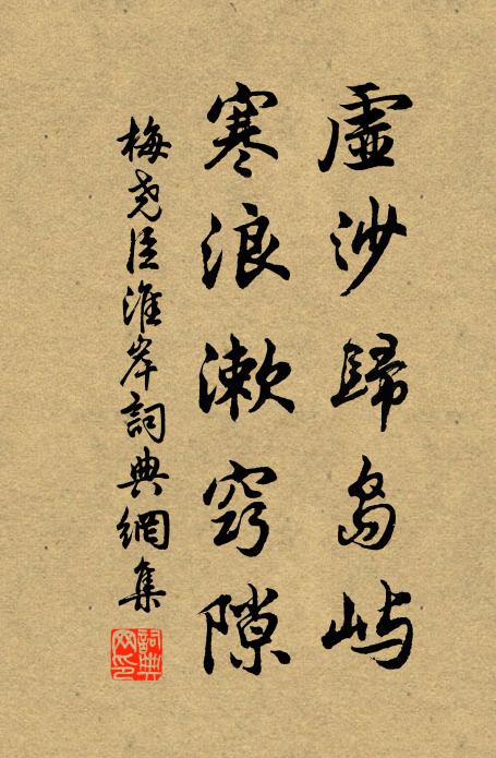 古詩文歷史字典書法欣賞書法字典國語詞典說文解字康熙字典古漢語字典虛沙歸島嶼,寒浪漱竅隙梅堯臣 《淮岸》名句出處出自宋代梅堯臣的《淮岸》全文:秋水刷土骨,峭瘦如老石。虛沙歸島嶼,寒浪漱竅隙。下過白魚尾,上有蒼獺跡。平崗自相連,野籜鳴風櫟。名句書法欣賞虛沙歸島嶼,寒浪漱竅隙書法作品梅堯臣名句,淮岸名句名句推薦天下英雄氣,千秋尚凜然劉禹錫《蜀先主廟》男兒百年且樂命,何須徇書受貧病李白《少年行三首·其三》今朝正月已半,是處燈火繚亂釋法泰《偈七首》更饒紅燭枝頭掛,粉蠟斗香奢趙彥端《眼兒媚(王漕赴介庵賞梅)》燈前春雨同揮翰,南風吹船著淮岸章甫《寄趙鄂州》炎夏天頗熱,儂門對溪住馮夢得《憶鄉歌四首》不居上界列仙班魏了翁《眼兒媚(南叔兄生日用前韻五月六日)》必爭如五射,有禮異六博司馬光《張明叔兄弟雨中見弄水軒投壺財酒薄暮而散斗》參差雉尾回丹陛,杳遠雞聲下禁樓孔武仲《十二月十六日後殿朝謁》人間短景不堪陳王丹桂《醉桃源 趙恭善生朝》誰令俗士駕,急去能不怍王之道《予紹興三十二年夏四月三日行部至山中時月上》問佛答雲乾屎橛,明明此理難分雪釋思岳《頌古九首》問之彼不通,告我此勿理鄭剛中《風俗》滿城車馬走紅塵,何人知享此幽寂白玉蟾《一覽亭》賦茅亦聊復,久矣忘喜怒仇遠《答陳宗道見寄》詩詞推薦鷓鴣天(題廣文官舍竹外梅花呈萬教)盧炳〔宋代〕閣雨浮雲寒尚輕。商量雪意未全成。莫嫌竹外蕭然處,忽有幽香透鼻清。詩興逸,酒魂醒。主人留客更多情。不辭看雲齊己〔唐代〕何峰觸石濕苔錢,便逐高風離瀑泉。深處臥來真隱逸,上頭行去是神仙。千尋有影滄江底,萬里無蹤碧落邊。長憶漢州王大錄事宅作杜甫〔唐代〕南溪老病客,相見下肩輿。近發看烏帽,催蓴煮白魚。宅中平岸水,身外滿床書。憶爾才名叔,含淒意有餘。梅岩趙崇釠〔宋代〕嵌空天影落元間,更著梅花迥莫攀。休說橫斜欠清淺,此岩正不減孤山。和杜仲觀青字詩二首之二賀鑄〔宋代〕白馬青絡頭,青萍寶帶鉤。青溪流水急,獨上青翰舟。佳人青雀釵,手把青荷游。慕君青雲器,青髮結綢繆。偈頌十二首釋道璨〔宋代〕一言已出駟難追,道了如何悔得來。冷地被人相訐露,牙關咬定口慵開。別胡逸姚合〔唐代〕記得春闈同席試,逡巡何啻十年余。今日相逢又相送,予乘五馬子腳踏車。女真進千手千眼觀音像頌釋德光〔宋代〕一手動時千手動,一眼觀時千眼觀。自是太平無一事,何須弄出幾多般。雪中會孫洙舍人飲王氏西堂戲成三絕蘇轍〔宋代〕新歲逼人無一日,殘冬飛雪已三回。百分琥珀從君勸,十里瓊瑤走馬來。南國高人真巨源,華堂邂逅接清樽。十年大江東去 登鯨川樓王旭〔元代〕飛樓縹緲,疑行雲、勢壓鯨川雄傑。賓主落成登眺日,正是炎蒸時節。把酒臨風,憑闌一笑,忘盡人間熱。四圍煙