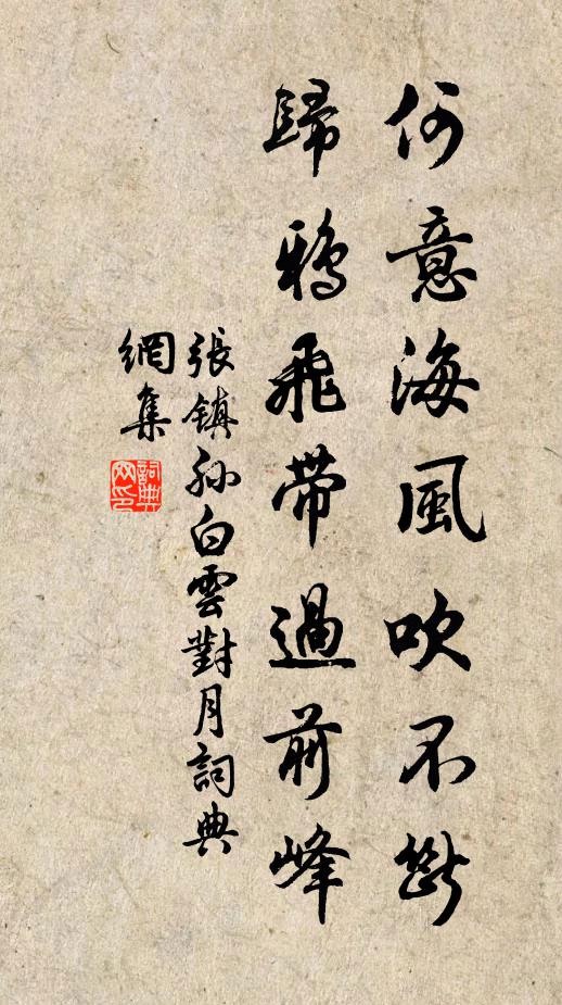 古詩文歷史字典書法欣賞書法字典國語詞典說文解字康熙字典古漢語字典何意海風吹不斷,歸鴉飛帶過前峰張鎮孫 《白雲對月》名句出處出自宋代張鎮孫的《白雲對月》全文:萬山飛翠映瑤空,一抹晴霞淡復濃。何意海風吹不斷,歸鴉飛帶過前峰。張鎮孫詩詞大全名句書法欣賞何意海風吹不斷,歸鴉飛帶過前峰書法作品張鎮孫名句,白雲對月名句名句推薦櫛短三秋發,途奔四海塵宋祁《答客》恭惟王明可用汲,一勺沃我思賢心度正《壽黃侍郎》賢人畜美德,豈必自標檢司馬光《晉康陳生家世以孝悌聞有異木連理生其庭旌表》我生本西南,為學慕齊魯蘇轍《送排保甲陳佑甫》一陰一陽分動靜,江河山嶽判流峙張榘《題劉直孺拙逸軒》欲轉聲猶澀,將飛羽未調鄭愔《詠黃鶯兒》玉壇訊息春寒淺高觀國《杏花天(杏花)》喻帝竟莫悟,終歸茂陵田李白《嵩山采菖蒲者》送君登廣陌,楊柳正依依陳起《寄劉茂實》為客時多不解愁,亦逢佳節強登樓蘇泂《重陽二首》何如灘頭媲東家,石上持竿釣游鯉李壁《過昭君村賦詩》過門剝啄亦奇事,拜起幸未須人扶陸游《寄趙昌甫》莫言霜雪多,終見綠有餘梅堯臣《擬水西寺東峰亭九詠陰崖竹》和風微度寶箏響,永日徐轉簾陰移陸游《記九月二十六夜夢》況多病、情傷幽素游次公《賀新郎》詩詞推薦閒身釋文珦〔宋代〕閒身孰能鞿,蕭散隨所欲。涼風入芒屨,緩步秋塘曲。清波淡無涯,無以滌心目。魚鳥亦忘情,何如在濠濮。題畫廿四首唐寅〔明代〕一叢樓閣空江上,日有群鷗伴苦吟。盡勝達官憂利害,五更霜里佩黃金。北齊唐彥謙〔唐代〕草草招提強據鞍,周師乘勝莫回看。背城肯戰知虛實,爭奈人前忍笑難。泗源程企〔宋代〕泗源鬼奇且怪,鬼聲勢各喧鬼豗。虎豹鬼岩邊去,蛟龍窟里來。稍流煙作陣,初激雪成堆。派必人疏導,源應鬼鑿秋後得雨姜特立〔宋代〕亢夏書草木死,書旱火熾如書焚。秋深得雨涼,萬物生精神。庭蕉抽綠書。野草秀芳茵。風露洗芙蓉,艷質照商旻清明日東歸舟次滯雨宋庠〔宋代〕月弦離畢破芳辰,舟子招招數問津。壓岸晚陰雲著野,蘸渠春色柳隨人。煙疇雊雉逢誰嘆,風磧驚鷗莫我親。賜告贈鄭女郎(一作鄭氏妹)薛馧〔唐代〕艷陽灼灼河洛神,珠簾繡戶青樓春。能彈箜篌弄纖指,愁殺門前少年子。笑開一面紅粉妝,東園幾樹桃花死。朝理解嘲十絕呈浩西堂釋紹嵩〔宋代〕殘骸已廢自知休,少不愁窮老豈愁。坎止流行聊爾耳,一身隨世作虛舟。定風波令/定風波周紫芝〔宋代〕梅粉梢頭雨未乾。淡煙疏日帶春寒。暝鴉啼處,人在小樓邊。芳草只隨春恨長,塞鴻空傍碧雲還。斷霞銷盡,新月山居李涉〔唐代〕一從身世兩相遺,往往關門到午時。想得俗流應大笑,不知年老識便宜。