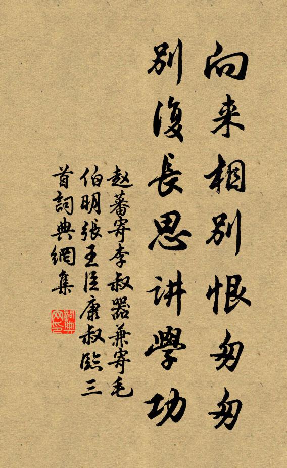 古詩文歷史字典書法欣賞書法字典國語詞典說文解字康熙字典古漢語字典向來相別恨匆匆,別復長思講學功趙蕃 《寄李叔器兼寄毛伯明張王臣康叔臨三首》名句出處出自宋代趙蕃的《寄李叔器兼寄毛伯明張王臣康叔臨三首》全文:向來相別恨匆匆,別復長思講學功。江水無由至雙鯉,春風又是起歸鴻。趙蕃詩詞大全名句書法欣賞向來相別恨匆匆,別復長思講學功書法作品趙蕃名句,寄李叔器兼寄毛伯明張王臣康叔臨三首名句名句推薦君侯心事即蒼冥,諤諤曾同唯唯爭王邁《用徐編修德夫韻其開藩旴江二首》要知來日清明日,請聽鵑鳴第一聲許月卿六《新安道中》嬌濕怕春知,跨白虬、天門未曉何夢桂《驀山溪》魂歸滄海憐精衛,人向空山拜杜鵑柳亞子《八月二十七日,明思文皇帝殉國忌辰也。讀》炙熊之蹯兮,龍醢羊羹張耒《種菊:》滿聽秋聲移竹母,徑眠明月枕桐孫方岳《簡王尉》無勛封柱國,有志捽何羅王灼《答伯秋》君不見寒儒骯髒默自守,橫前書笈,燕坐瓮牖陳造《薄薄酒》中國之人不測也,故或至於震懼而失辭,以為夷狄笑蘇洵《送石昌言使北引》多緒多情,病身軀憔悴損;閒愁閒悶,將柳帶結同心關漢卿《【雙調】新水令_攪閒風吹散》只今流落天南端,悵望中原莫回首張元乾《信中居仁叔正皆有詩訪梅於城西而獨未暇載酒》別易見應難陳師道《菩薩蠻》投晚鐘公渡放船,急流送我轉千山黃大受《梅川呈同舟游仲發時中流失舟故云》潨瀉泉石聲,蕭森松檜影舒坦《游翠岩六首》屋角微聞哢曉禽,起煨榾柮旋冠簪劉克莊《元日七言二首》詩詞推薦贈李隱士釋行海〔宋代〕白薴為衣草結廬,相逢猶問世何如。每彈山水忘憂曲,懶上王侯自薦書。白眼鷗邊窺宇宙,清罇月下宴樵漁。時情偶成梅詠三首張嵲〔宋代〕故園微路繞江乾,常記開時偪歲寒。萬晨臨風驚老眼,卻疑還是霧中看。上孟郡王生辰三首仲並〔宋代〕霜余晴日照堤沙,早晚天墀下白麻。有吏當筵歌湛露,須公滿斚泛流霞。篇章況是萬人敵,閥閱相仍百乘家。落帽汝州王學士射弓行李廌〔宋代〕汝陽使君如孫武,文章絕人喜軍旅。要知談笑能治兵,戲教紅妝樂營女。白氈新袍錦臂鞲,條脫掛弓腰白羽。彩錯安福院二首劉敞〔宋代〕三十六陂秋水來,龍蛇奔走起風雷。老僧與置南軒地,會是憑欄心目開。賀新郎(兵後寓吳)蔣捷〔宋代〕深閣簾垂繡。記家人、軟語燈邊,笑渦紅透。萬疊城頭哀怨角,吹落霜花滿袖。影廝伴、東奔西走。望斷鄉關知何挽心泉蒲處士丘葵〔宋代〕欲持雞絮立墳前,俗了青霞頂上仙。只合化為溪畔鷺,乘風飛去弄清泉。青冢白居易〔唐代〕上有飢鷹號,下有枯蓬走。茫茫邊雪裡,一掬沙培塿。傳是昭君墓,埋閉蛾眉久。凝脂化為泥,鉛黛復何有。唯有和張規臣水墨梅五絕陳與義〔宋代〕自讀西湖處士詩,年年臨水看幽姿。晴窗畫出橫斜影,絕勝前村夜雪時。故市王洋〔宋代〕樵牧無人記故侯,崎崎林壑水經邱。道傍若問五承福,應嘆人間萬事休。