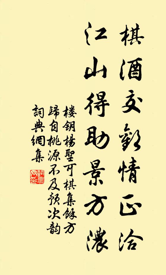 古詩文歷史字典書法欣賞書法字典國語詞典說文解字康熙字典古漢語字典棋酒交歡情正洽,江山得助景方濃樓鑰 《楊聖可棋集余方歸自桃源不及預次韻》名句出處出自宋代樓鑰的《楊聖可棋集余方歸自桃源不及預次韻》全文:屏處尤便野性慵,故人何幸總相逢。賦歸敢慕陶彭澤,自免猶睎邴曼容。棋酒交歡情正洽,江山得助景方濃。嗟余誤入桃源去,總路滿城聞晚鐘。名句書法欣賞棋酒交歡情正洽,江山得助景方濃書法作品樓鑰名句,楊聖可棋集余方歸自桃源不及預次韻名句名句推薦寒暄方得所,風雨不相催司馬光《二十八日會不疑家席上紀實》落花終日雨,流水一溪雲高翥《無計》鳥聲已迎一百五,野逕微行誰復嗔吳則禮《由刁園步至因勝求浴》須知深處藏雷雨,不獨江邊繞釣磯宋白《雲》未識嵇中散,今無元魯山虞儔《寶閣尚書凌公輓詩》金簪二寸短,留結殷勤,鑄就偏名有誰認朱彝尊《洞仙歌》只今惟有溪童在,應放高枝棲白鷳周弼《海棠》裊裊腰疑折,褰褰袖欲飛張祜《舞》風葉飄零夜,雨花狼籍春戴復古《風雨無憀中覽鏡有感作小詩未有斷句適兩侄孫》善者未必善,惡者未必惡釋師範《豐乾寒拾虎四睡贊》玉顏隨年變,丈夫多好新傅玄《豫章行苦相篇》餘喘尚能鼓,老憤知已結蘇舜元《悲二子聊句》點檢東頭松菊,料理西頭水竹,一一手親裁李孝光《水調歌頭 與於雲峰》天上嫦娥人未識,料應清雅似梨花方回《梨花》廓落無依合太虛,行行何處不逢渠釋正覺《送明專使》詩詞推薦出謁晚歸陸游〔宋代〕萬卷縱橫眼欲盲,偶隨尺一起柴荊。淵魚脫水知難悔,野鶴乘車只自驚。苑路落梅輕有態,御溝流水細無聲。紅麈謝林簿遺廬阜茶芽潘牥〔宋代〕誰采匡廬紫玉芽,二千里路到吾家。磚爐石銚自烹吃,清落詩脾作雪花。有駜佚名〔先秦〕有駜有駜,駜彼乘黃。夙夜在公,在公明明。振振鷺,鷺於下。鼓咽咽,醉言舞。於胥樂兮!有駜有駜,駜彼乘牡鼓角仇遠〔宋代〕五更相次曉,一曲有餘清。忽醒山林夢,遙聞鼓角聲。背風還迤邐,帶月最分明。莫作邊城看,長淮久息兵。游華子岡紅泉碧澗曾極〔宋代〕去城才半驛,深谷自逶迤。藤絡崩崖石,松垂倒地枝。寒山縮毛髮,碧澗照鬚眉。至日登樂遊園裴度〔唐代〕陰律隨寒改,陽和應節生。祥雲觀魏闕,瑞氣映秦城。驗炭論時政,書雲受歲盈。晷移長日至,霧斂遠霄清。景暖挽戴丞劉克莊〔宋代〕戴氏多人物,君尤月旦推。能傳後倉禮,亦擅叔倫詩。故里懸車蚤,名場解褐遲。它年端有恨,椿桂不同時。簡南劍倅趙用甫以夫同年二首王邁〔宋代〕岜亭邂逅又輕離,時事更翻幾局棋。遊宦明知同旦過。出山聊復救朝飢。屠龍笑我真可用,躍馬追君已落遲。舟自震澤道吳興城外有感孫應時〔宋代〕憶向苕溪泊酒船,寧知綠髮便華顛。只今行腳一萬里,重此驚心二十年。箬笠簑衣真我事,清風明月苦論錢。晚涼游簡寂觀張正見〔南北朝〕三梁澗本絕,千仞路猶通。即此神山內,銀牖映仙宮。鏡似臨峰月,流如飲澗虹。幽桂無斜影,深松有勁風。惟當