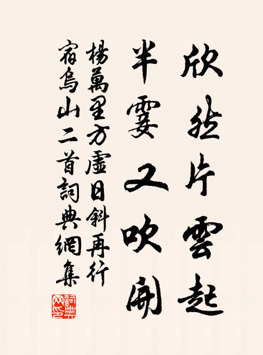古詩文歷史字典書法欣賞書法字典國語詞典說文解字康熙字典古漢語字典欣然片雲起,半霎又吹開楊萬里 《方虛日斜再行宿烏山二首》名句出處出自宋代楊萬里的《方虛日斜再行宿烏山二首》全文:日已襄容去,風仍劈面來。征徒歇得醒,老子不須催。綠蔭涼過傘,黃泥曬作埃。欣然片雲起,半霎又吹開。楊萬里詩詞大全名句書法欣賞欣然片雲起,半霎又吹開書法作品楊萬里名句,方虛日斜再行宿烏山二首名句名句推薦平波渺渺煙蒼蒼,菰浦才熟楊柳黃陳堯佐《吳江》槐花綴粉粘苔砌,桂子飄香入草堂董嗣杲《秋涼懷歸三首》秦君好學勇,決勝百馬汗晁補之《次韻答秦覯見贈》珠幡已報三陽候,柏葉將陳萬壽杯晏殊《辛春日詞御閣》病多三徑塞,吟苦四鄰驚劉得仁《病中晨起即事寄場中往還》五帝三皇神聖事,騙了無涯過客 * 《賀新郎讀史》孤雲不定心,持缽度寒林王鎡《送默然上人歸天台》窗橫暮卷葉,檐臥古主枝盧照鄰《宿晉安亭》山對起、飛來萬馬平坡駐章謙亨《摸魚兒(過期思稼軒之居,漕留飲於秋水觀,賦一詞謝之)》旦逐新人殊未歸,還令秋至夜霜飛佚名《妾薄命》海西上千里,將行勇還退蘇轍《游泰山四首 岳下》每教人愛人嫌陳德武《清平樂》瀟水流,湘水流,三閭愁接二妃愁屈大均《瀟湘神 零陵作》乞巧樓空夜筵散,襪生寒,青苔砌上觀銀漢馬致遠《【越調】小桃紅_四公子宅賦》向艷歌偏愛,賦情多處寄衷曲盧祖皋《秋霽》詩詞推薦奉答聖俞達頭魚之作歐陽修〔宋代〕吾聞海之大,物類無窮極。蟲蝦淺水間,蠃蜆如山積。毛魚與鹿角,一龠數千百。收藏各有時,嗜好無南北。其微次韻閻學士靖軒贈受益山居二首方回〔宋代〕八月濤江五月湖,畫圖一見粟生膚。君家奄有兩奇觀,更覺天真勝畫圖。哭李群玉段成式〔唐代〕曾話黃陵事,今為白日催。老無兒女累,誰哭到泉台。訪雪峰真歇禪師李彌遜〔宋代〕紅塵白髮不相投,來就僧房借板頭。大士法中龍象貴,老翁心外水雲浮。長蘆江靜千山月,枯木岩寒一葉秋。別後神清秀 寄看龐總管園趙公馬鈺〔元代〕些兒微妙非常好。猛焰里、自然芝草。玉虎與金龍,密護三田寶。丹成九轉青童報。便授取、紫微宣誥。體掛六銖送青神丞劉平仲解官三絕史堯弼〔宋代〕多奇趙北燕南地,還喜超然出冀方。氣習敦龐今復見,餘風千載有陶唐。聞西師復華州陸游〔宋代〕西師驛上破番書,鄠杜真成可卜居。細肋臥沙非望及,且炊黍飯食河魚。葉子逸以惠山泉瀹日鑄新茶餉予與常鄭卿章甫〔宋代〕惠山甘泉苦不冷,日鑄茶香方是真。廣文喚客作妙供,石銚風爐皆手親。神清便欲排閶闔,且了吾人淡生活。瓶芽池上春日即事林逋〔宋代〕鴛鴦如綺杜蘅肥,鸂鶒夷猶翠瀲微。但據汀洲長並宿,莫沖煙靄輒驚飛。已輸謝客清吟了,未忍山翁爛醉歸。釣艇次楊綿州韻二首釋寶曇〔宋代〕夜潮明日浙東西,故國征鴻各自歸。白璧一雙唯我在,行年六十似公希。人生自是專城貴,道眼何曾與世違。剩種