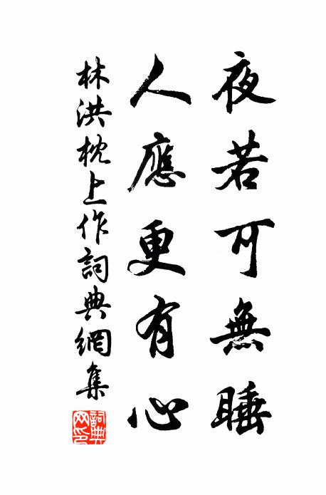 古詩文歷史字典書法欣賞書法字典國語詞典說文解字康熙字典古漢語字典夜若可無睡,人應更有心林洪 《枕上作》名句出處出自宋代林洪的《枕上作》全文:天街月未沈,來者已駸駸。夜若可無睡,人應更有心。香凝衾正暖,燈隔帳如陰。亦欲呼童起,誰門能賞音。林洪詩詞大全名句書法欣賞夜若可無睡,人應更有心書法作品林洪名句,枕上作名句名句推薦風梢雨蓋摩霄漢,個裡高人即地仙王之道《和王元渤留題松壽岩白雲庵寄鄭顧道二首》御風獨長嘯,此心謝鞿馽羅與之《玉梁道中雜詠》不是骷髏,不是傀儡白玉蟾《鄭天谷寫神隨喜說偈》腳踏車不可駐,朱檻未遑攀戴叔倫《奉天酬別鄭諫議雲逵、盧拾遺景亮見別之作》雙撐石柱峙東南,勢力擎天名不俗韓信同《雙柱擎天》德鎮千鈞重,文輝萬丈長李廌《小蘇先生九三丈自司諫拜起居郎權中書舍人廌》不道相逢不相識,盡教寒拾笑咍咍白玉蟾《見浙翁琰禪師》賦來詩句無閒語,老去官班未在朝張籍《贈王秘書》作相勸焚書,詐雲愚蚩蚩顏太初《許希》庭外瀟瀟雨勿翁《賀新郎(端午和前韻)》百年門地推鴻緒,三月春江照隼旟周南《太平州陳大監挽章》一更里,擒意馬楊真人《輥金丸》不知歸又何處,知我者何希方岳《水調歌頭(癸丑生日)》同林偶落此,相向意甚平陳與義《種竹》先生繡衣吹霜風,一道生齒關寢飧李流謙《送晁子西提刑赴召》詩詞推薦句陳傅良〔宋代〕半妝宮面迎風笑,間色仙衣帶露收。望鶴林寺李紳〔唐代〕鶴棲峰下青蓮宇,花發江城世界春。紅照日高殷奪火,紫凝霞曙瑩銷塵。每思載酒悲前事,欲問題詩想舊身。自嘆酬陳翃郎中冬至攜柳郎竇郎歸河中舊居見寄盧綸〔唐代〕三旬一休沐,清景滿林廬。南郭群儒從,東床兩客居。燒煙浮雪野,麥隴潤冰渠。班白皆持酒,蓬茅盡有書。終期三月五日游劉光世園朱翌〔宋代〕南高峰下訪余春,霽草浮光暖更薰。日轉暮日添著色,風旋湖水作回紡。飄零大士天花雨,驚雇將軍畫棟雲。興盡早春病中張籍〔唐代〕羸病及年初,心情不自如。多申請假牒,只送賀官書。幽徑獨行步,白頭長懶梳。更憐晴日色,漸漸暖貧居。頌古三十八首釋慧方〔宋代〕善財拈起一枝草,持來度與文殊老。殺活雖然在手中,遍界不藏光杲杲。梅花喜神譜爛熳二十八枝宋伯仁〔宋代〕萬里收纖雲,一鉤懸碧落。缺圓無定時,人間幾愁樂。雪晴陸游〔宋代〕臘盡春生白帝城,俸錢雖薄勝躬耕。眼前但恨親朋少,身外元知得喪輕。日映滿窗松竹影,雪消並舍鳥烏聲。老來再用南伯韻郭印〔宋代〕乾坤誰整頓,世乏英雄姿。陛下求賢切,焦勞見宵衣。草茅豈無人,耕雨釣寒漪。如何一終星,坐視戎馬肥。題楊總卿鹿岡庵章粲〔宋代〕客行鹿岡暮,四顧秋滿目。澗碧菸草滋,林黃霜橘熟。歸鳥各東西,啼螿相斷續。愁心浩難留,故山正幽獨。