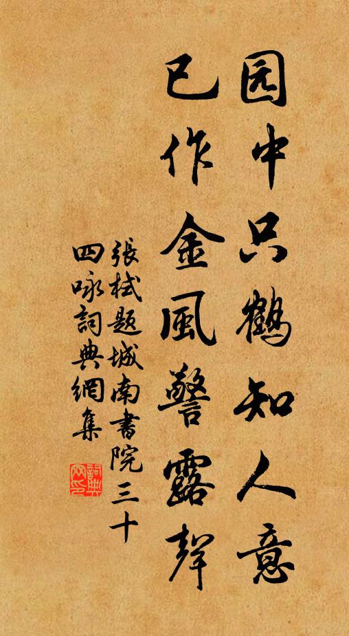 古詩文歷史字典書法欣賞書法字典國語詞典說文解字康熙字典古漢語字典園中只鶴知人意,已作金風警露聲張栻 《題城南書院三十四詠》名句出處出自宋代張栻的《題城南書院三十四詠》全文:睡覺西山月正平,荷香不斷曉涼生。園中只鶴知人意,已作金風警露聲。張栻詩詞大全名句書法欣賞園中只鶴知人意,已作金風警露聲書法作品張栻名句,題城南書院三十四詠名句名句推薦慣是洛濱要解佩,本是河間好數錢上官儀《和太尉戲贈高陽公》閒問蘇小樓前,夕陽花外,歸燕曾來否張可久《百字令 春日湖上》世網無端巧見遮,路岐何處出裹斜汪炎昶《次韻答伯初》清池沈鳥影,高樹落蟬聲吳龍翰《嘉禾沈園》酒闌欲上馬,握手增眷眷孫應時《答王甫撫乾和荊江亭韻》無數流鶯遠近飛方千里《浣沙溪/浣溪沙》百姓喚作太守雨,東皋西陌皆沖融王冕《喜雨歌為宋太守賦》古來復諫多不祥,鴟夷浮江吳國滅,老臣疽背霸王歇王炎《公無渡河》亦有告予者,縮贏伏見元有期魏了翁《羅五星善奕棋乾詩》免輪迴、決在今生,可細搜細刷馬鈺《清心鏡 道友問修行》回薄浩劫何渺茫,冥默銷沉寂無光李復《出城》正冶思縈花,餘酲倦花張炎《探芳信》紅珠絡繡帽,翠鈿束羅襟許渾《贈蕭鍊師》群陰剝盡一陽生,又見東山水上行釋智愚《偈頌十七首》墳生苦霧蒼茫外,門掩寒雲寂寞中貫休《悼張道古(昭宗時道古官拾遺以直諫貶蜀中死)》詩詞推薦持上人別久矣一日來訪舉似近作且言遷寓新房張鎡〔宋代〕幽雲心性阿師同,懶復隨春泥白戲。指日茶香申舊好,蔓陰窗戶葡萄風。聞杜鵑戲作絕句陸游〔宋代〕半世羈游厭路岐,憑鞍日日數歸期。勞君樹杪丁寧語,似勸飢人食肉糜。過宋呈曾公冕吳則禮〔宋代〕團欒棗熟官焙奇,澆我清秋雁鶩池。絕聞人說宋城令,真是南豐僕射兒。次韻郭教授雪二首陳造〔宋代〕皇心憂喜與民同,帝意深憐歲不豐。瑤檢何時下仙界,瑞花一昔覆寰中。和聲已自消疵癘,陳廩從知飽困窮。今世巫山一段雲 西江風雪李齊賢〔元代〕過海風淒緊,連雲雪杳茫。落花飄絮滿江鄉。偷放一春狂。漁市關門早,征帆入浦忙。酒樓何處咽絲簧。愁殺孟襄滿庭芳佚名〔宋代〕北斗璇魁,南閩元帥,西清真地行仙。東林白社,依約認前緣。霞洞天台萬疊,記當時、秀減山川。三生夢,岩公宿齊雲寺黃公度〔宋代〕行李秋將老,停鞭日已西。深村見人少,孤寺與雲齊。試問沾微祿,何如返故棲。雞鳴不成寢,乘月下清溪。上元夜效小庾體(見《歲時雜詠》)陳子昂〔唐代〕三五月華新,遨遊逐上春。相邀洛城曲,追宴小平津。樓上看珠妓,車中見玉人。芳宵殊未極,隨意守燈輪。姑孰十詠。慈姥竹李白〔唐代〕野竹攢石生,含煙映江島。翠色落波深,虛聲帶寒早。龍吟曾未聽,鳳曲吹應好。不學蒲柳凋,貞心嘗自保。贈鵝湖上人趙令衿〔宋代〕三年四度到鵝湖,山水娛人道不孤。最是可人快心目,曉風殘月弄菰蒲。
