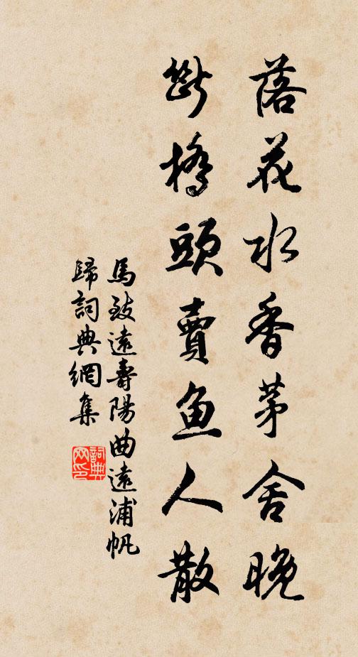 夕陽下,酒旆閒,兩三航未曾著岸。落花水香茅舍晚,斷橋頭賣魚人散。