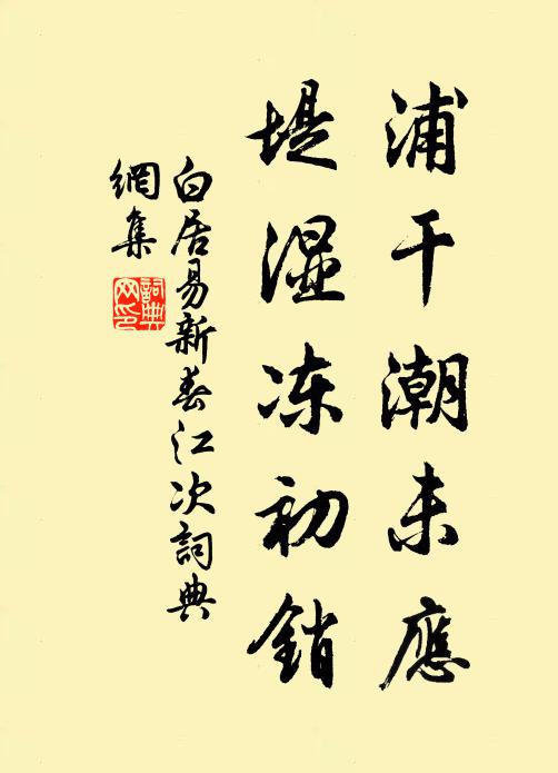 古詩文歷史字典書法欣賞書法字典國語詞典說文解字康熙字典古漢語字典浦乾潮未應,堤濕凍初銷白居易 《新春江次》名句出處出自唐代白居易的《新春江次》全文:浦乾潮未應,堤濕凍初銷。粉片妝梅朵,金絲刷柳條。鴨頭新綠水,雁齒小紅橋。莫怪珂聲碎,春來五馬驕。名句書法欣賞浦乾潮未應,堤濕凍初銷書法作品白居易名句,新春江次名句名句推薦谷深山遠空無像,何處人呼應不圓釋正覺《偈頌二百零五首》村墅溪亭處處嬉,新年海岱悉清夷劉克莊《村墅》樂事如今懶陸文圭《探春慢 和心淵己巳元夕韻》共事鹹淳帝,俱生嘉定年馬廷鸞《挽費潔堂》撞鐘擊鼓飯千指,分坐豈無三尺楹何耕《暇日與陳楚材游四天王寺見五髻文殊畫像於廡》鐵作橋樑雲作蓋,石成樓觀水成簾白玉蟾《送鄭道人歸羅浮》人笑此翁,又來訪古范成大《三登樂》朋友與我俱曹植《贈丁翼詩》葉山堅石如水蒼,斲為大尊重且方李廌《王彥溫多恕許惠葉縣石方尊將以貯酒作詩取之》老漸多歸思,貧惟長病容姚合《喜馬戴冬夜見過期無可上人不至》證鱉成龜,喚三作兩釋道璨《偈頌十二首》嵌空浪吞吐,薈蔚風颼飀陳與義《過君山不獲登覽》良期苦難儷,千里勞遠目程公許《過眉山謁鄉耆宿李八丈提刑》清灣氣象暮潭潭,漁客車罾似引帆孔武仲《寓目》春長秋風敗黃葉,白髮老人慵把鑷宋太宗《緣識》詩詞推薦夔州竹枝歌九首范成大〔宋代〕白頭老媼篸紅花,黑頭女娘三髻丫。背上兒眠上山去,採桑已閒當採茶。遇仙槎 和師韻馬鈺〔元代〕三光固下元,六度清中闕。九轉上元燈,照見長生月。無分晝夜明,光彩連綿發。顯出個胎仙,生死今番越。裴子再寄詩酬之王洋〔宋代〕裴郎四海一輕舠,身寄浮家小動搖。蝴蝶不來閒處舞,知隨春夢到雲霄。秋闈後勉子侄劉宰〔宋代〕我生場屋慣周旋,得失從知豈偶然。天理先須盡人事,時文端有本塵編。日烘瓮牖朝先起,雪壓茅齋夜不眠。萬里行役有嘆二首楊萬里〔宋代〕去年丐西歸,謂可休餘生。今年復東下,駕言入神京。臥治方小安,趨召豈不榮。何如還家樂,醉吟聽溪聲。送新羅人歸本國劉得仁〔唐代〕雞林隔巨浸,一住一年行。日近國先曙,風吹海不平。眼穿鄉井樹,頭白渺瀰程。到彼星霜換,唐家語卻生。贈相者趙椿年曾豐〔宋代〕胸次無諸塵垢障,眼中有爾光明藏。云何不策反照動,小而用之風鑒上。伎倆君參不二門,形骸我入無色相。相逢頌古三十一首釋安永〔宋代〕問處分明答處親,縱橫有路慣反身。相如奪得連城璧,秦主安然致太平。郊廟歌辭。五郊樂章。肅和魏徵〔唐代〕金行在節,素靈居正。氣肅霜嚴,林凋草勁。豺祭隼擊,潦收川鏡。九穀已登,萬箱流詠。示智道者釋曇華〔宋代〕少室門庭冷似灰,長年不見一人來。汝今若解知慚愧,那取工夫到一回。