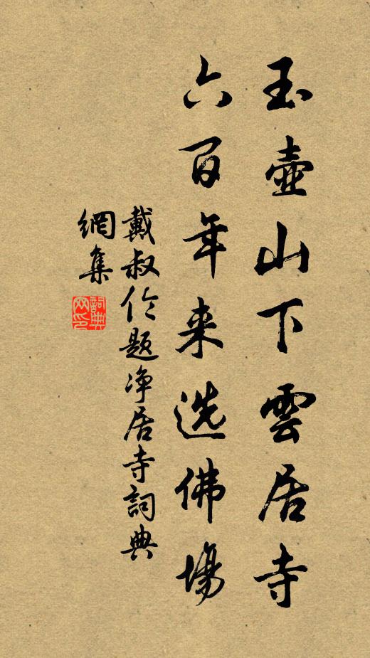 古詩文歷史字典書法欣賞書法字典國語詞典說文解字康熙字典古漢語字典玉壺山下雲居寺,六百年來選佛場戴叔倫 《題淨居寺》名句出處出自唐代戴叔倫的《題淨居寺》全文:玉壺山下雲居寺,六百年來選佛場。滿地白雲關不住,石泉流出落花香。戴叔倫詩詞大全名句書法欣賞玉壺山下雲居寺,六百年來選佛場書法作品戴叔倫名句,題淨居寺名句名句推薦共駭群龍水上游,不知原是木蘭舟邊貢《午日觀競渡》情期夙所敦,邀迓已去屢韓維《令綽泛舟潩河作詩詒之》數客同吟棹,羈懷得少寬趙希邁《黃姚灘》弗躬弗親,庶民弗信佚名《節南山》我室思無邪,我堂德有鄰蘇軾《用前韻再和孫志舉》及我竄群舒,向風心鬱郁徐鉉《酬郭先輩》莫謂家貧厭舊醅,一尊聊對桂花開陸游《書喜》願移此靈根,支拄天西北五邁《題江郎石》想射日回天,到頭虛耗王吉昌《繡定針》西峰殘日落,誰見寂寥心周賀《宿開元寺樓》清音雅調感君子,一撫一弄懷知己司馬逸客《雅琴篇》式燕固雲喜,有行尤愴離朱長文《公堂置酒群彥鹹集作詩吳學中諸先輩且用敘別》淨居寺,在光山縣南四十里大蘇山之南、小蘇山之北蘇軾《游淨居寺(並敘)》景像自開還自合,怡然何必更忘憂釋延壽《山居詩》酒如瀉江波,紫翠映華席李流謙《元質偶招客飲為賦此篇》詩詞推薦嘉禾百詠樂郊亭張堯同〔宋代〕竹下清風好,時來掛幅巾。待逢田叟問,知是樂郊人。水仙花四首楊萬里〔宋代〕額間拂殺御袍黃,衣上偷將月秭香。待倩春風作媒卻,西湖嫁與水仙王。謫宋徙毫初聞周璠琵琶晁補之〔宋代〕棗園憭栗檜廳寒,醉倚琵琶倒鶡冠。不似江州白司馬,只成怨恨不成歡。題群仙圖仇遠〔宋代〕世代雖殊道不殊,衣冠氣貌列仙儒。自憐無計攀靈轡,豈意相從入畫圖。把袂拍肩歸福地,抗塵走俗笑泥塗。苔痕澗上居人項安世〔宋代〕跨澗作橋兼作屋,行人初到已泠然。全家寢食淙琤上,韶濩聲中過百年。送交代王公輔洪咨夔〔宋代〕興州乳臭腥紅袍,萬馬夾擁橫磨刀。奴顏婢舌競動進,羅拜狗彘護優猱。漢家衣冠余兩豪,卻立渠肯污腥臊。傳呼寄沈莊可戴復古〔宋代〕無山可種菊,強號菊山人。結得諸公好,吟成五字新。紅塵時在路,白髮未離貧。吾輩渾如此,天公似不仁。沁園春洪咨夔〔宋代〕飲馬鹹池,總轡崑崙,橫鶩九州。慶中興機會,天生山甫,非常事業,天授留侯。左搏龍蛇,右馴虎兕,萬里中原趣劉聖與寓王甫杜墅劉宰〔宋代〕門外平湖百頃寬,庭前翠竹繞欄乾。鳥啼花笑四時好,幾爭窗明六月寒。賸可琴書供晝永,不妨弦管到更闌。留行依韻和王平甫見寄梅堯臣〔宋代〕兄為太守兩輪朱,仲泛吳人燕尾艫。且看洞庭多橘柚,莫懷江國有枌榆。少游山水殊非俗,老愛詩書又似愚。百事