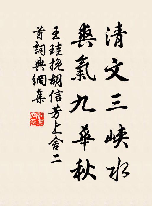 古詩文歷史字典書法欣賞書法字典國語詞典說文解字康熙字典古漢語字典清文三峽水,爽氣九華秋王珪 《挽胡信芳上舍二首》名句出處出自唐代王珪的《挽胡信芳上舍二首》全文:濠上初相行,竹林曾共游。清文三峽水,爽氣九華秋。世已從新學,人誰與此流。遺芳端不朽,未信台棺休。王珪詩詞大全名句書法欣賞清文三峽水,爽氣九華秋書法作品王珪名句,挽胡信芳上舍二首名句名句推薦遠雙夷塗邁牧之,三霜道路飽驅馳李曾伯《送戴書記》露濕秋香滿池岸,由來不羨瓦松高鄭谷《菊》白頭漁子搖蒼煙,眠沙曉驚起裴說《游洞庭湖》送君渡海南,風帆若張弓蘇轍《次韻子瞻過海》夜對遺編嘆復驚,古來成敗浩縱橫陸游《讀史》庖犧網未收,同類如予何周文璞《烏媒》文略也從牽吏役,質夫何故戀囂塵白居易《期李二十文略王十八質夫不至獨宿仙遊寺》愁逐野雲銷不盡,情隨春浪去難平張佖《春夕言懷》芭蕉大蔽牛,不奈霜風侵洪咨夔《閒居二首》定催歸有謂,泥香芝檢,留行無計,路熟花驄黃機《沁園春(為潘郴州壽)》楚岫高低接太行,吳江渺漠下滄浪陳允平《姑蘇館》倚危樓極目,無情細草長天色歐陽修《感庭秋/撼庭秋》故園同此夕,長望一霑纓張嵲《山中月夜》大丈夫,榮與貴,視尋常林正大《水調歌》用舍東方言虎鼠,賤疏梅福比蒿萊梅堯臣《次韻和吳仲庶舍人送德化郭尉》詩詞推薦滿江紅(東湖觀蓮)黃裳〔宋代〕綠蓋紛紛,多少個、雲霄仙子。應是有,瑤池盛會,靚妝臨水。無奈輕盈風信急,瑞香亂翠紅相倚。誰共吟、此景和夢遊春詩一百韻白居易〔唐代〕昔君夢遊春,夢遊仙山曲。怳若有所遇,似愜平生欲。因尋菖蒲水,漸入桃花谷。到一紅樓家,愛之看不足。池流臨川節中寄季和弟李壁〔宋代〕平生曠達慕莊周,老覺悲來不自由。節里憶君頻夢見,遙傳掬淚過江州。無為洞口作元結〔唐代〕無為洞口春水滿,無為洞傍春雲白。愛此踟躕不能去,令人悔作衣冠客。洞傍山僧皆學禪,無求無欲亦忘年。欲問游龍潭李彌遜〔宋代〕百念輕冰已著湯,解纓何必濯滄浪。欲收一滴寒潭水,散作人間無盡涼。喜簡元輔兄二首晁公溯〔宋代〕元有不病者,君無嗟遽衰。閉門謝餘子,扶杖看清時。野樹著花早,春江生浪遲。相過忍輕別,小立為題詩。生查子(洪舍人用前韻索冠答謝,並以冠往)趙磻老〔宋代〕朝路進賢歸,厭聽歌金縷。不戀玉堂花,豹隱南山霧。漉酒未巾時,暑檻披風處。子夏不兼人,並與詩筒付。送梁公昌從信安北征李白〔唐代〕入幕推英選,捐書事遠戎。高談百戰術,郁作萬夫雄。起舞蓮花劍,行歌明月弓。將飛天地陣,兵出塞垣通。祖席弟觀為眾奉里神于丹山僧舍有五絕因趁韻陳著〔宋代〕迎神舊是醉嘩場,榷禁方嚴酒有坊。倖免叫囂成鬼市,不妨安穩服農忙。偈頌一百零二首釋紹曇〔宋代〕洞庭七十二峰,飛雪一千餘丈。晨昏說法琅琅,誰謂盧公已往。元不往,在這裡。優曇火里開,嗅著無香氣。