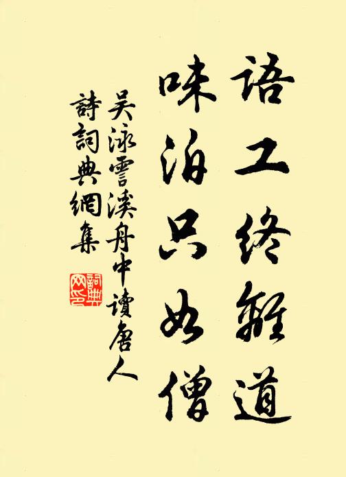 古詩文歷史字典書法欣賞書法字典國語詞典說文解字康熙字典古漢語字典語工終離道,味泊只如僧吳泳 《霅溪舟中讀唐人詩》名句出處出自宋代吳泳的《霅溪舟中讀唐人詩》全文:大雅聲才息,騷人詞競興。語工終離道,味泊只如僧。霜夜杜荀鶴,秋風張季鷹。撫編吟魄動,飛雨灑船燈。吳泳詩詞大全名句書法欣賞語工終離道,味泊只如僧書法作品吳泳名句,霅溪舟中讀唐人詩名句名句推薦撥破浮塵入紫煙,五羊壇上訪神仟古成之《五仟觀二首》欲去足先澀,未語膽已寒蔡戡《同張叔囦顧致堯游金山受之憚於涉險爽約不》鶚書已費幾將上,熊軾猶便再落南曾豐《慶元六年七月至儋耳問前守之政改元四年罷歸》嘗貴後忽賤,病又名脫營方回《讀素問十六首》琴堂難坐,林趙顯宏《【黃鐘】刮地風 別思》它年看無雙,聲譽出江夏施晉卿《梅林分韻賦詩得下字》一朝時去不自由,山腹空有沙痕留陸游《瞿唐行》朝市不足問,君臣隨草根高適《登百丈峰二首》痛哭王孫去,南來萬晨余樓鑰《齊國夫人曹氏輓詞》後學寡師承,私知妄穿鑿袁燮《送路德章芾三首》天詔應邀請王哲《虞美人 戰公索修行》琱章琢句老雙溪,秀韻凌虛獨擅時曹勛《和雙溪五首》青松澗底獨離奇謝應芳《一翦梅》飲之融痞蹇,濯之伸拘攣皮日休《太湖詩以毛公泉一瓶獻上諫議因寄》藩守寧為重,擁騎造雲關韋應物《詣西山深師》詩詞推薦重過習池項安世〔宋代〕征鞍重過習家池,橋下泉聲下索詩。待洗一杯春酒涴,為君吐出碧雲詞。送顏尚書知泉州虞儔〔宋代〕聽履星辰最上頭,一麾得請暫南州。高風涼凜凜推前輩,政路駸駸卻倦遊。地近枌榆同衣錦,天低雨露密承流。只雜詩 其一陶淵明〔魏晉〕人生無根蒂,飄如陌上塵。分散逐風轉,此已非常身。落地為兄弟,何必骨肉親!得歡當作樂,斗酒聚比鄰。盛年渡揚子陳造〔宋代〕濤江吞天去,委此舟一葉。有之恃勇往,微命幾顛跲。弱纜維復解,宿浪俄妥帖。北風不滿帆,晴空欲凌躡。淮人步至西村陸游〔宋代〕一飽無餘事,西村偶獨行。榰筇息微倦,汲井漱餘酲。川闊雁平度,谷虛雲亂生。絕知豐歲樂,笑語隔柴荊。芳草虛中〔唐代〕綿綿芳草綠,何處動深思。金穀人亡後,沙場日暖時。龍鱗藏有瑞,風雨灑無私。欲采蘭兼蕙,清香可贈誰?被檄之上饒言還未幾又復往焉至小渡遇雨遣興喻良能〔宋代〕檄至方雲急,吾行敢滯留。朔風經小渡,細雨過中洲。冉冉新斑鬢,飄飄敝黑裘。欲知來往久,三見月如鉤。記夢鄭獬〔宋代〕赤城老仙翁,面發日月華。獨立石岩下,手把蟠桃花。授我碧簡文,奇篆蟠丹砂。讀之不可曉,翻身凌紫霞。句劉接〔宋代〕獵叟藤編戶,傜人草結庵。奉和武相公省中宿齋,酬李相公見寄鄭絪〔唐代〕高閣安仁省,名園廣武廬。沐蘭朝太一,種竹詠華胥。禁靜疏鍾徹,庭開爽韻虛。洪鈞齊萬物,縹帙整群書。寒露