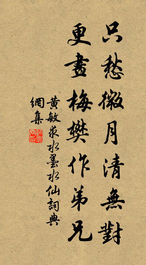 古詩文歷史字典書法欣賞書法字典國語詞典說文解字康熙字典古漢語字典只愁微月清無對,更畫梅樊作弟兄黃敏求 《水墨水仙》名句出處出自宋代黃敏求的《水墨水仙》全文:玉潤金寒情窈窕,縞裙翠帶態輕盈。只愁微月清無對,更畫梅樊作弟兄。黃敏求詩詞大全名句書法欣賞只愁微月清無對,更畫梅樊作弟兄書法作品黃敏求名句,水墨水仙名句名句推薦陳跡豈足道,舊歡何日無賀鑄《燕子樓》一片虛凝絕謂情,萬里清光飛玉兔釋如珙《偈頌三十六首》試問當年調鼎事,非梨非粟不能桃度正《制乾判院初度載臨謹以梅起興賦三絕句為斯文》只今煙水平軒檻,觸目無非是孝慈楊簡《嘉泰昭陽大淵獻築室董孝君祠之西下有湖焉某》人心成勝勢,天理是良媒魏了翁《和崔侍郎送行詩韻》漢楚興亡事已休,至今堪嘆亦堪羞於石《讀史七首》秀色發江左,風流奈若何李白《五松山送殷淑》來望野與通,古城何額額梅堯臣《依韻和韓子華陪王舅道損宴集》為岳瀆,為星雲孫銳《雲長公贊》眾生不異佛,佛即是眾生王安石《題半山寺壁二首》桑麻萬頃晴氛散,絲竹千門夕照移楊億《郡齋西寧即事十韻招麗水殿丞武功從事》曾經謝病各游梁,今日相逢憶孝王劉禹錫《洛中逢白監同話游梁之樂,因寄宣武令狐相公》長堤凍柳不堪折,窮臘使君單騎行梅堯臣《送樂職方知泗州》不是寒山子,何人解此吟釋惟一《偈頌一百三十六首》疏星掛,涼蟾低下林表周邦彥《霜葉飛(大石)》詩詞推薦舟中曉望孟浩然〔唐代〕掛席東南望,青山水國遙。舳艫爭利涉,來往接風潮。問我今何去,天台訪石橋。坐看霞色曉,疑是赤城標。折墨陸游〔宋代〕鸞膠搗松煙,成此金石姿,雖以剛故折,挺特終不移。微功在簡冊,敢惜身蹈危。雖非破硯文,永世亦有辭。唐大饗拜洛樂章禋和武則天〔唐代〕百禮崇容,千官肅事。靈降舞兆,神凝有粹。奠享鹹周,威儀畢備。奏夏登列,歌雍撤肆。秋日古蘭花十首方回〔宋代〕大似斯文不遇時,無人采佩世無知。援琴與鼓猗蘭操,五百年間一退之。句清江〔唐代〕萬木無一葉,客心悲此時。過楊華父宅與二僧同舟不及訪方回〔宋代〕每喜佯狂叟,窮途說共財。忽辭酒仙市,徑上客星台。鼓枻攜支遁,過門憶老萊。恐勞難黍具,或可致新醅。詠風王勃〔唐代〕肅肅涼風生,加我林壑清。驅煙尋澗戶,卷霧出山楹。去來固無跡,動息如有情。日落山水靜,為君起松聲。 梅花馮時行〔宋代〕正是園林花木衰,冰姿玉潔出疏籬。月中瘦影道傍見,江上寒香人不知。時節驚心非故物,簿書滿眼欠新詩。碧雲自詠陸游〔宋代〕曾著杞菊賦,自名桑薴翁。常開羅爵綱,不下釣魚筒。租稅先期畢,陂塘與眾同。士章八十字,世世寫屏風。偈頌一百零二首釋紹曇〔宋代〕出匣神鋒瑩鸊鵜,將軍珍襲已多時。相承不是屠龍手,只作三文補履錐。
