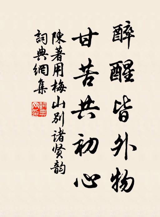 古詩文歷史字典書法欣賞書法字典國語詞典說文解字康熙字典古漢語字典醉醒皆外物,甘苦共初心陳著 《用梅山別諸賢韻》名句出處出自宋代陳著的《用梅山別諸賢韻》全文:世變事難必,天倫愛自深。醉醒皆外物,甘苦共初心。倦翼山招返,寒林風為吟。休當長聚首,衰境況侵尋。陳著詩詞大全名句書法欣賞醉醒皆外物,甘苦共初心書法作品陳著名句,用梅山別諸賢韻名句名句推薦海潮盡處逢陶石,江月圓時上庾樓徐鉉《送歐陽大監游廬山》木落古山空,猿啼秋月白呂渭《經湛長史草堂》身閒欲出無如嬾,酒薄雖傾不敵愁陸游《夏日雜題》年來性復便疏懶,老去誰能浪苦辛吳芾《和葉先生韻》谷口猿聲發,風傳入戶來裴迪《輞川集二十首臨湖亭》徐步移斑杖,登臨意惘然曹彥約《同景輔登樓約集少陵句》羌父豪豬靴,羌兒青兕裘杜甫《送韋十六評事充同谷郡防禦判官》藥匕蠲疴去近班,主台西邑借餘閒宋庠《次韻和太常韓博士寄獻留台吳侍郎之作》古壁苔入雲,陰溪樹穿浪錢起《獨往覆釜山,寄郎士元》亦復誚其介,忍窮如鐵石吳芾《朱世同喜雪中得酒出佳篇相謝用韻奉酬》細雨出江城,潮回江正清黃公度《離臨安》引道老農辭我去,與君更上最高峰楊萬里《同劉季游登天柱岡四首》櫱山養子忒婆心,斫了摩挲不憚勤釋惟一《頌古三十六首》少年拜舞綴庭紳,曾見中天日月新陸游《閒中戲書》蛟螭旗尾擁樓頭,偃仰胡床護一州王炎《和廖守岳陽樓韻三首》詩詞推薦留別梁任南漢挪路盧梁啓超〔清代〕冤霜六月零,憤泉萬壑哀,寥莪不可誦,遊子肝腸摧。魑魅白晝行,齧人如草萊。勞勞生我恩,慘慘入泉台。悠悠西湖雜興二首高翥〔宋代〕十三樓寺早餐飯,六一泉寺晚詠歌。坐斷竹風無暑氣,乳禽鳴處綠陰多。次省齋韻覓友梅縈笑集不蒙見惠再借韻楊公遠〔宋代〕巨編藏古錦,風雅續遺音。雷電欲下取,辟易不敢侵。真趣誰領會,一如陶潛琴。所言正而大,詎比鄭聲淫。疑有村居書事四首劉克莊〔宋代〕刮膜神方直萬金,國醫曾費一生心。可憐髽髻提籃者,也有盲人問點鍼。登宜春醉宿景星寺寄鄭判官兼簡空上人李群玉〔唐代〕曉發碧水陽,暝宿金山寺。松風灑寒雨,淅瀝醒余醉。夜中香積飯,蔬粒俱精異。境寂滅塵愁,神高得詩思。皎皎送羲大師釋重顯〔宋代〕岩房抱病經一月,門有諸生阻來謁。長往之期猶未能,七十之年更何說。若耶溪老忽留語,溪上舊遊且歸去。春風觀音大士贊釋智遇〔宋代〕寶瓶翠柳常隨手,又向青蓮葉上行。五濁世中無垢染,不須慈眼視眾生。信州道士蕭了空坐逝或見其在湘潭總府貳蕭公方回〔宋代〕了了了了,空空空空,心肝不在臭皮袋中。想見出神似蟬蛻,可能吸露更餐風。送國子徐博士之灃州徐鉉〔唐代〕多才適世用,學者不遑處。新詞八詠樓,更泛涔陽浦。行當應列宿,且復施甘雨。高齋閒坐時,清談孰為伍。送查總卿三首李流謙〔宋代〕御爐薰隔夜,清蹕響凌晨。對動天顏喜,朝回賜服新。自期宜棟乾,小卻尚絲綸。此論由來久,周行萬縉紳。