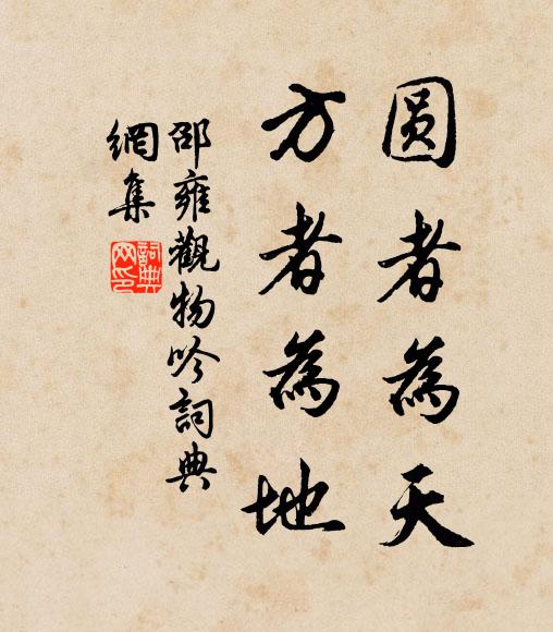 古詩文歷史字典書法欣賞書法字典國語詞典說文解字康熙字典古漢語字典圓者為天,方者為地邵雍 《觀物吟》名句出處出自宋代邵雍的《觀物吟》全文:一氣才分,兩儀已備。圓者為天,方者為地。變化生成,動植類起。人在其間,最靈最貴。邵雍詩詞大全名句書法欣賞圓者為天,方者為地書法作品邵雍名句,觀物吟名句名句推薦誰謂爾無羊?三百維群佚名《無羊》陰淫果決用心除,屍鬼因循為汝禍呂岩《贈劉方處士》誰知花下情,猶能憶楊柳徐積《花下飲》故奩脂澤具,留待上陵年宋祁《莊懿皇太后哀輓應制二首》子去成三友,公餘寄一樽李流謙《送尹仲求臨邛戶掾》怡然懷吾廬,花竹幽更盛楊萬里《明發平坦市》玉山那惜醉,金谷已無春李端《送黎少府赴陽翟》止止不復彈,繆然歌採薇曾極《上朱晦庵》修程不自勉,九十半百里胡寅《示龍王長老法贊用舊韻先公佳城與寺相直》野性羞雷同,自為梁父吟釋文珦《先雲洲訪予於萬玉歸而寄詩因用其韻》僧殘無給侍,墨妙雜輿台李流謙《下岩》子有不肖弟,有冠未嘗簪蘇轍《和子瞻鳳翔八觀八首其五東湖》恃險不種德,興亡嘆數窮王貞白《金陵懷古》郎忙日本國里打鼓,大唐國里撞鐘釋普寧《偈頌四十一首》蘭台供擬信樂歟,不知畫手安用摹韓元吉《跋北齊校書圖》詩詞推薦東林社楊維楨〔元代〕陶公八十日,解組歸山阿。覺今若不早, * 十倍過。開塗劃荊棘,斧缺且無柯。賴爾東林社,招我南山歌。回視泊流潢驛,潮風大作二首楊萬里〔宋代〕忽看草樹總離披,記得沙行昨日時。除卻潮來無別事,海風動地亦何為。失調名佚名〔宋代〕便直饒、鐵作心腸,也須是淚滴。【雙調】殿前歡 懶雲窩阿里西瑛〔元代〕懶雲窩,醒時詩酒醉時歌。瑤琴不理拋書臥,無夢南柯。得清閒儘快活,日月似攛梭過,富貴比花開落。青春去也次韻張鵬飛三絕方回〔宋代〕舐犢區區笑老牛,阿瞞焉恤一楊彪。英雄誤理大床話,賣藥惟應學伯休。聽元規琴張繼先〔宋代〕萬物紛然在,渾淪聲不流。昔人弦上取,今我意中求。水激崖邊石,風高島上秋。相看得真樂,天地共優遊。覽古四十二首 其四十楊維楨〔元代〕昨日滿頭花,堂上爭春妍。今朝大風起,花落玉津園。舊地易淮陝,取馘諧戎門。可憐於期首,不謝永州魂。和絳守王仲賢郎中邵雍〔宋代〕為郎得絳分銅虎,見寄詩中非浪夸。地土尚傳唐草木,山川猶起晉雲霞。園池富有吟供筆,風俗淳無訟到衙。太守壽安雜詩十首靈山寺司馬光〔宋代〕神林興盡謀早歸,草間露裛行徑微。忽思靈山去不遠,馬首欲東還向西。垂鞭縱轡尋山足,洛水逶迤過數曲。漸聞【雙調】雁兒落過得勝令 落花楊朝英〔元代〕惜殘紅惜嫩紅,如曉夢如春夢。寂寞了金谷園,冷落了桃源洞。錯怨五更風,蜂蝶去無蹤。一徑胭脂重,千機錦繡
