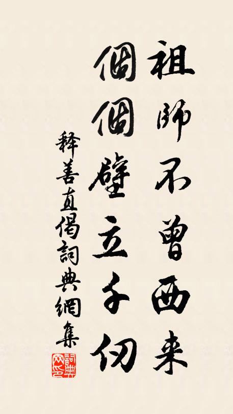 古詩文歷史字典書法欣賞書法字典國語詞典說文解字康熙字典古漢語字典祖師不曾西來,個個壁立千仞釋善直 《偈》名句出處出自宋代釋善直的《偈》全文:諸佛不曾出世,人人鼻孔遼天。祖師不曾西來,個個壁立千仞。釋善直詩詞大全名句書法欣賞祖師不曾西來,個個壁立千仞書法作品釋善直名句,偈名句名句推薦水連伊闕近,樹接夏陽深張說《崔禮部園亭得深字》喜倒坐中兒子輩,爭指似,謝家鹽王惲《江神子 金朝遺風,冬月頭雪,令僮輩團取,》高低相倚賴,渾如長幼情樂史《慈竹》記得江城春意動向子諲《玉樓春(宛丘行□□□□之園見梅對雪)》便付與同僚更可人張之翰《沁園春 謝王巨川侍郎,以澹游所書扇見惠》莫恨梅花憔悴去,且欣新綠盡歸田吳芾《喜雨》書慵捲起閒今古,回向心源不動時馬廷鸞《謝潔齋惠爐瓶》川迥楓林散,山深竹港幽元好問《山居雜詩》風外新篁搖翠葆王義山《樂語》女大知艱食,兒痴亦廢書章甫《除草》如潮愛恨總難休梁羽生《浣溪沙》養一箔蠶供釣線,種千莖竹作漁竿杜荀鶴《戲贈漁家》半山便遣能參透,猶有唐人是一關楊萬里《讀唐人及半山詩》直下不居功,箇中看轉處釋正覺《偈頌二百零五首》伯倫酒頌老叉詩,腹憤胸奇略泄之劉克莊《八十吟十絕》詩詞推薦醉蓬萊(丙申自壽)程珌〔宋代〕記蟾宮桂子,撒向人間,如今時候。□□□□,□□□□□。白下長乾,亂灘橫笛,想昔游依舊。大海一漚,千年採菖蒲陳與義〔宋代〕閒行澗底採菖蒲,千歲龍蛇抱石癯。明朝卻覓房州路,飛下山顛不要扶。山檻小飲曾鞏〔宋代〕變秋長雲豪,灑雨北風壯。余熇尚爭威,積晦頗異狀。山回攢楓顛,屋立懸狖上。飲檻聚石為,歌筵注溪當。歡言奉使契丹二十八首其二十一李公麟陽關圖二絕蘇轍〔宋代〕西出陽關萬里行,彎弓走馬自忘生。不堪未別一杯酒,長聽佳人泣渭城。偈頌十首釋如淨〔宋代〕十二峰前上戲棚,那吒赤脫點天強。屈煩鼓笛低頭舞,弄醜真堪笑一場。水調歌頭(似之、申伯、叔陽皆作,再次前韻)李綱〔宋代〕物我本虛幻,世事若俳諧。功名富貴,當得須是個般才。幸有山林雲水,造物端如有意,分付與吾儕。寄語舊猿鶴題弟晦所居壁楊億〔宋代〕製宅何其巧,連山復帶溪。芳樽長有酒,嘉樹自成蹊。學舍祥鱣墮,歌梁賀燕迷。調琴明月樹,系馬綠楊堤。好畤書情奉寄蔣弋陽公張良臣〔宋代〕五都一何綺,歌管政繁會。眷我友明月,援琴寫秋瀨。何言昃離後,一飽困藜稗。風雨墨如翳,欲往徒自礙。次韻子云盱眙道中三首韓元吉〔宋代〕海上狼烽不起煙,兵戈猶記舊年前。岩居有客能招飲,肉食何人為給鮮。但得生涯類盤谷,可無風景似斜川。共尋扈蹕霸州納蘭性德〔清代〕霸山重鎮奠神京,鸞輅春遊淑景明。萬呱銀濤沖古岸,四圍玉甃護嚴城。花乘暖日迎來騎,柳帶新膏綰去旌。八寨
