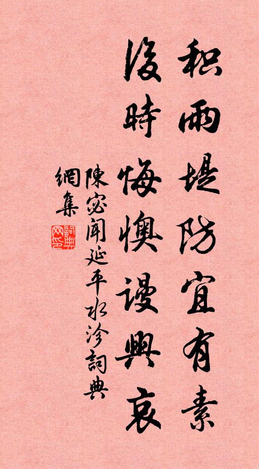 古詩文歷史字典書法欣賞書法字典國語詞典說文解字康熙字典古漢語字典積雨堤防宜有素,後時悔懊謾興哀陳宓 《聞延平水沴》名句出處出自宋代陳宓的《聞延平水沴》全文:延平山水東南冠,連歲何辜致許災。積雨堤防宜有素,後時悔懊謾興哀。名句書法欣賞積雨堤防宜有素,後時悔懊謾興哀書法作品陳宓名句,聞延平水沴名句名句推薦元來崧岳生申旦,會群仙、獻長生籙佚名《桂枝香》思君未有東來計,何日雙眉對面伸王令《幽居感懷寄滿子權》楚國茫茫盡醉人,獨醒惟有一靈均張耒《屈原》芰荷可裳菊可餐,肯逐纖埃與塵土劉琰《王剛仲惠詩醉筆聊和》無情社雨亦何狂趙師俠《浣溪沙(癸已豫章)》山林無不容,疲薾坐自礙蘇轍《游太山四首其四岳下》官閒門自靜,不為翟公羅宋庠《夏日久雨》此地何年別,蘭芳空自幽宋之問《春日鄭協律山亭陪宴餞鄭卿同用樓字》修竹自是無仙溺馬鈺《蓬萊客》馮生遠同恨,憔悴在田廬韋應物《張彭州前與緱氏馮少府各惠寄一篇多故未答…兼遠簡馮生》楚雲驚,隴水散,兩漂流朱敦儒《水調歌頭·淮陰作》命拙仍多故,君來每慰情,艱虞還儉歲,文字久寒盟蘇泂《送觀復機宜榮侍南遊二首》散漫祥雲逐聖回,飄颻瑞雪繞天來李嶠《游苑遇雪應制》欔槌侍御史,碗脫侍中郎佚名《武后長壽元年民間謠》李牧愧長袖謝靈運《永初三年七月十六日之郡初發都詩》詩詞推薦送文用庵主歸舊隱釋重顯〔宋代〕太白峰前舊隱基,杉松寒翠滴無時。經年拋卻又歸去,再聽岩猿祇自知。讀道書潘牥〔宋代〕道人清曉炷爐薰,嵐重衣巾濕露痕。課罷楞嚴經一卷,小窗徙倚候啼猿。恭睹宸制花落尤艷之句自古詩人未有形容及此曹勛〔宋代〕春事匆匆綠漸稼,林花鋪繡曉煙中。如何卷上黃金闕,許作華裀舞閬風。題黃長孺松江圖古箋陳著〔宋代〕吾行半東南,松江東南奇。湖鋪天上水,山橫鏡中眉。清風明月夜,細雨斜風時。扁舟幾來去,長揖三高祠。泯默高宗建炎初祀昊天上帝佚名〔宋代〕[姑洗為羽一奏]惟天為大,物始攸資。恭承祠祀,以報以祈。神不可度,日監在茲。有聲明德,庶其格思。山行即事王質〔宋代〕浮雲在空碧,來往議陰晴。荷雨灑衣濕,蘋風吹袖清。鵲聲喧日出,鷗性狎波平。山色不言語,喚醒三日酲。讀陳勝傳屈大均〔清代〕閭左稱雄日,漁陽謫戍人。王侯寧有種?竿木足亡秦。大義呼豪傑,先聲仗鬼神。驅除功第一,漢將可誰倫?寄楚州呂濟叔梅堯臣〔宋代〕亭午鳥不下,誰復過我廬。忽聞扣門者,偶出問何如。雲是山陽吏,太守遣置書。自惟久窮困,遊子安念予。淮陰尋春次韻樓鑰〔宋代〕曉來陌上雨斑斑,同社相將便出關。席地亦堪尋酒所,得園徑與坐花間。從教多病須行樂,任是清貧也破慳。門外仲本索歸甚遽前詩送行言之不足見示和篇覽之虞儔〔宋代〕幸有綈袍戀故人,不應回棹遽忘情。相逢且話十年事,此別又成千里行。歸去我猶慚靖節,催科誰解恕陽城。黃堂