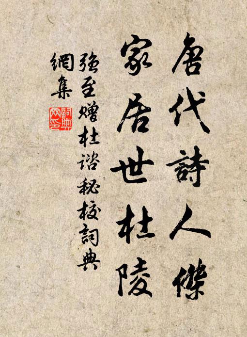 古詩文歷史字典書法欣賞書法字典國語詞典說文解字康熙字典古漢語字典唐代詩人傑,家居世杜陵強至 《贈杜諮秘校》名句出處出自宋代強至的《贈杜諮秘校》全文:唐代詩人傑,家居世杜陵。祖風今不墜,君學善相承。氣直橫秋鶚,文雄絕漢鵬。風騷如命將,壇復讓誰登。名句書法欣賞唐代詩人傑,家居世杜陵書法作品強至名句,贈杜諮秘校名句名句推薦忍錄錄以寓世兮,信烈者之所羞秦觀《蔡氏哀詞》鮫絲霧吐漸收,細腰無力轉嬌慵柳永《臨江仙引·畫舸》我向大羅觀世界,世界即如指掌大吳涵虛《上升歌》我行山間已一月,枕石潄流更奇絕岳珂《述山中語呈郡侯董庭直少監》繁壓玉欄霞,紅燒翠鬟火李至《奉和對海紅花見寄之什》風月秦樓愁處別,鶯花蜀國病中吟李新《再書》小草欣欣造物勻,三月來來野田好章采《搖搖花行》聞說頻年旱,先懷並日憂胡寅《喜雨》恩書容稿進,嘉頌愧辭荒馬廷鸞《恭進明堂大禮慶成詩》萬方應望雨,片景欲焚空齊己《苦熱》謗墨滿褚笥,戰血腥乾鋣方回《斷河酒樓得花字落字二首》急景駸駸度,遙懷處處生徐鉉《寄和州韓舍人》發彩斑斷雨,燈影清涼颸汪炎昶《讀書感憤四首》夢裡便尋青櫟社,生來幾過白苹洲吳潛《五用出郊韻三首》只愁不祭鬼成餒,那問乏供兒哭空陳著《次趙景文絕糧》詩詞推薦憶仙姿(九之三)賀鑄〔宋代〕相見時難別易。何限玉琴心意。眉黛只供愁,羞見雙鴛鴦字。憔悴。憔悴。蠟燭銷成紅淚。詠雨張道古〔唐代〕亢陽今已久,嘉雨自雲傾。一點不斜去,極多時下成。和黃雲夫武攸見寄韻史彌寧〔宋代〕詩名千古社陵翁,身不勝窮道不窮。編簡湛酣君有味,江山彈壓我無功。穉涼庭院梧桐雨,晚照陂墉蓼荻風。如此句張釜〔宋代〕四水縈紆十里程。賀新郎(為真主堂壽)戴復古〔宋代〕說與黃花道。九秋深、三光五嶽,氣鍾英表。金馬玉堂真學士,蘊藉詩書奧妙。一一是、經綸才調。斟酌古今來活有感三首張耒〔宋代〕一春苦多風,桃李見無幾。良游時已失,忽忽三月尾。中間亦何有,徒自亂心耳。所嗟違所娛,坐費良日晷。堂北望江南佚名〔宋代〕還丹術,切要經手傳。若信故方終日誤,顛來倒去倒來顛。不得怨神秋闈後勉子侄劉宰〔宋代〕我生場屋慣周旋,得失從知豈偶然。天理先須盡人事,時文端有本塵編。日烘瓮牖朝先起,雪壓茅齋夜不眠。萬里王中玉生辰李新〔宋代〕瑤磩桂楹香才濃,貴人罷直承明宮。高樓內集慶生子,酒面油膏紅復紅。嵩雲入洛秋容曉,水冷青洲蘭蕙小。露蠲出行湖山間雜賦陸游〔宋代〕老入新年健,春逢小雨晴。偶因尋酒去,又作繞村行。塘水蒼鵝戲,郊原黃犢鳴。閒身有樂事,倚杖看農耕。
