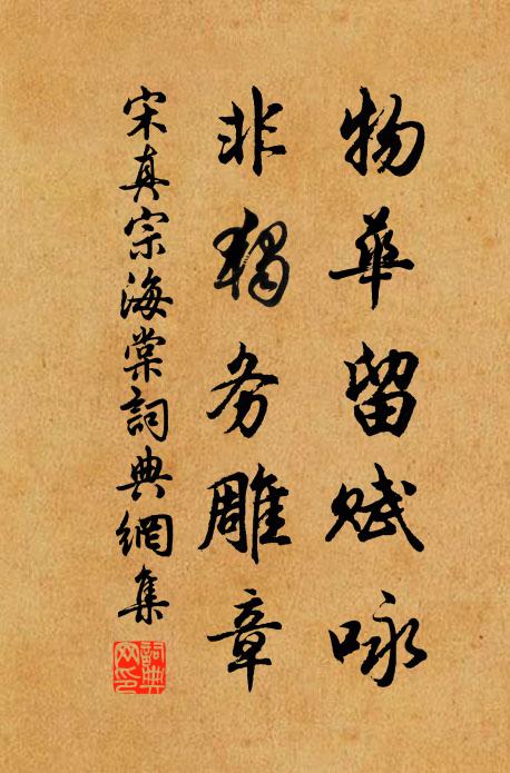古詩文歷史字典書法欣賞書法字典國語詞典說文解字康熙字典古漢語字典物華留賦詠,非獨務雕章宋真宗 《海棠》名句出處出自宋代宋真宗的《海棠》全文:春律行將半,繁枝忽競芳。霏霏含宿霧,灼灼艷朝陽。戲蝶棲輕蕊,游蜂逐遠香。物華留賦詠,非獨務雕章。宋真宗詩詞大全名句書法欣賞物華留賦詠,非獨務雕章書法作品宋真宗名句,海棠名句名句推薦終篇本無字,誰別勝陽春薛能《新雪八韻(一作閒居新雪)》趙客縵胡纓,吳鉤霜雪明李白《俠客行》相汝下劣軀,不過藉炎熱李呂《戒蠅》石公說道理,句句出凡格盧仝《蕭宅二三子贈答詩二十首客許石》芃芃叢生者,樸樕良已卑王洋《枯柏》大膽越照臨清景內,唐虞訊息笑聲中毛滂《上元夜》獨上秦台最高處,舊山依約在東南翁承贊《曉望》占年梅映臘雪瑞,回暖柳拂春晝長衛宗武《和友人新陽韻》萬事味來嚼蠟,只有濟時一念,未肯死前休王惲《水調歌頭 次前韻》混沌函三極,沖和貯一真洪咨夔《薺餛飩》自是山公興,誰令下士知獨孤及《李卿東池夜宴得池字》冷濕流螢草,光凝宿鶴枝王禹偁《中秋月》漫題詩句滿芭蕉耿時舉《浣溪沙》君王既巡狩,輦道入秦京祖詠《扈從御宿池》縱使曲肱無別夢,一尊風月弄婆娑曾幾《風月堂二首》詩詞推薦冬夜讀書有感陸游〔宋代〕胸中十萬宿貔貅,皁纛黃旗志未酬。莫笑蓬窗白頭客,時來談笑取幽州。題劉伯山蕃殖圖二首楊萬里〔宋代〕老子平生只荷鋤,誤攜破硯到清都。歸來荒盡西疇卻,媿見劉家蕃殖圖。龜巢夜宴方岳〔宋代〕落日鴛鴦睡淺坡,荷花初醒水微波。玉簫吹斷晴雲濕,最覺池寬得月多。頌古三十八首釋從瑾〔宋代〕當陽打動番南鼓,萬象森羅立地聞。不是大家齊則劇,難消白日到黃昏。九懷鴟夷子皮高似孫〔宋代〕江欲冷兮丹楓,月將缺兮初鴻。天如仄兮沉兮波,楫有聲兮追風。易莫易兮謀取功,難莫離兮圖終。東山兮誰作,秋堂夕元稹〔唐代〕炎涼正回互,金火郁相乘。雲雷時交構,川澤方蒸騰。清風一朝勝,白露忽已凝。草木凡氣盡,始見天地澄。況此詠雪詩徐陵〔南北朝〕瓊林玄圃葉。桂樹日南華。豈若天庭瑞。輕雪帶風斜。三晨喜盈尺。六出儛崇花。明朝闕門外。應見海神車。秘魔岩釋重顯〔宋代〕把斷重津過者難,擎扠須信髑髏乾。藿山到後知端的,同死同生未足觀。無題二首張玉孃〔宋代〕征雁初聞廢織梭,支頤機杼恨偏多。溪頭返影留斜日,湖上行舟盪芰荷。釣台二首陳必敬〔宋代〕已上桐江台,又弄桐江釣。不食桐江魚,不怕嚴公笑。